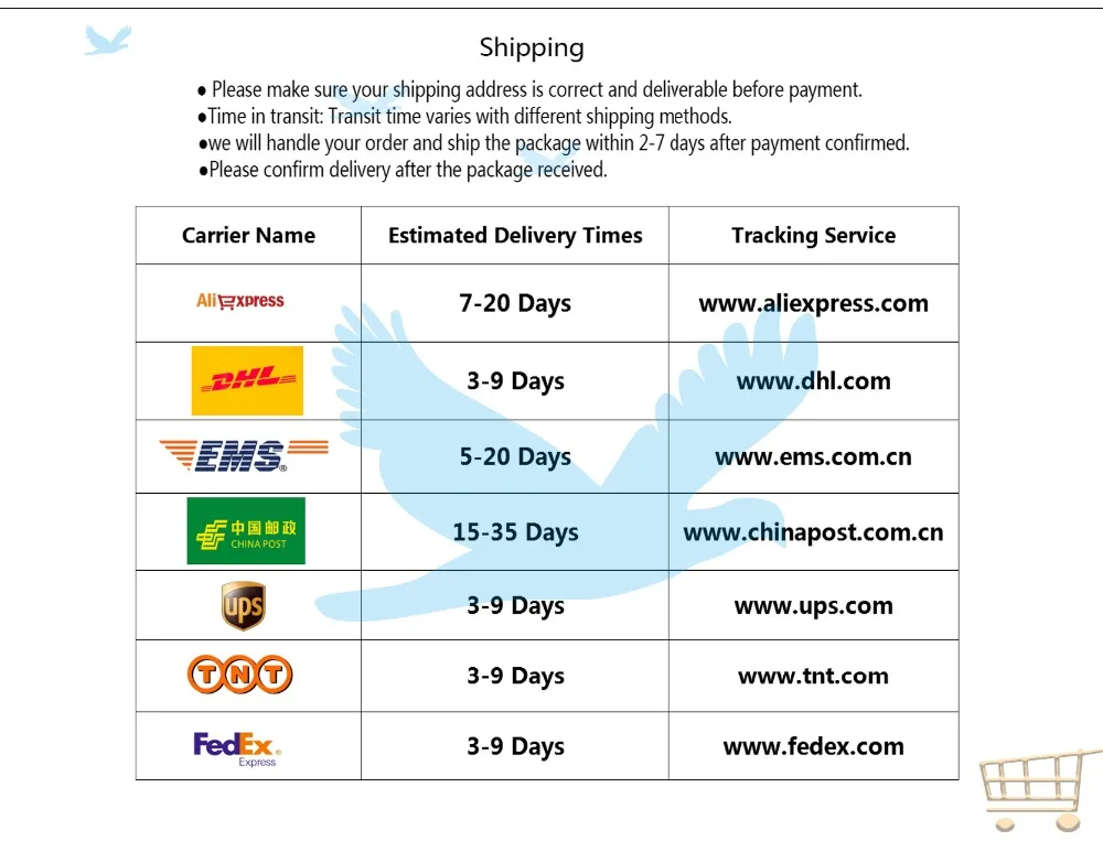 Packages from our warehouse in China will be shipped by ePacket or EMS depending on the weight and size of the product. Packages shipped from our US warehouse are shipped through USPS.