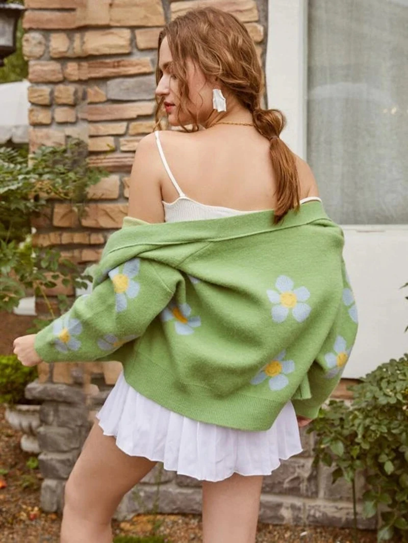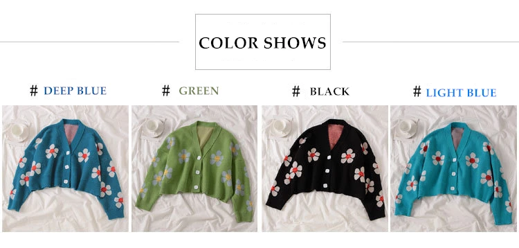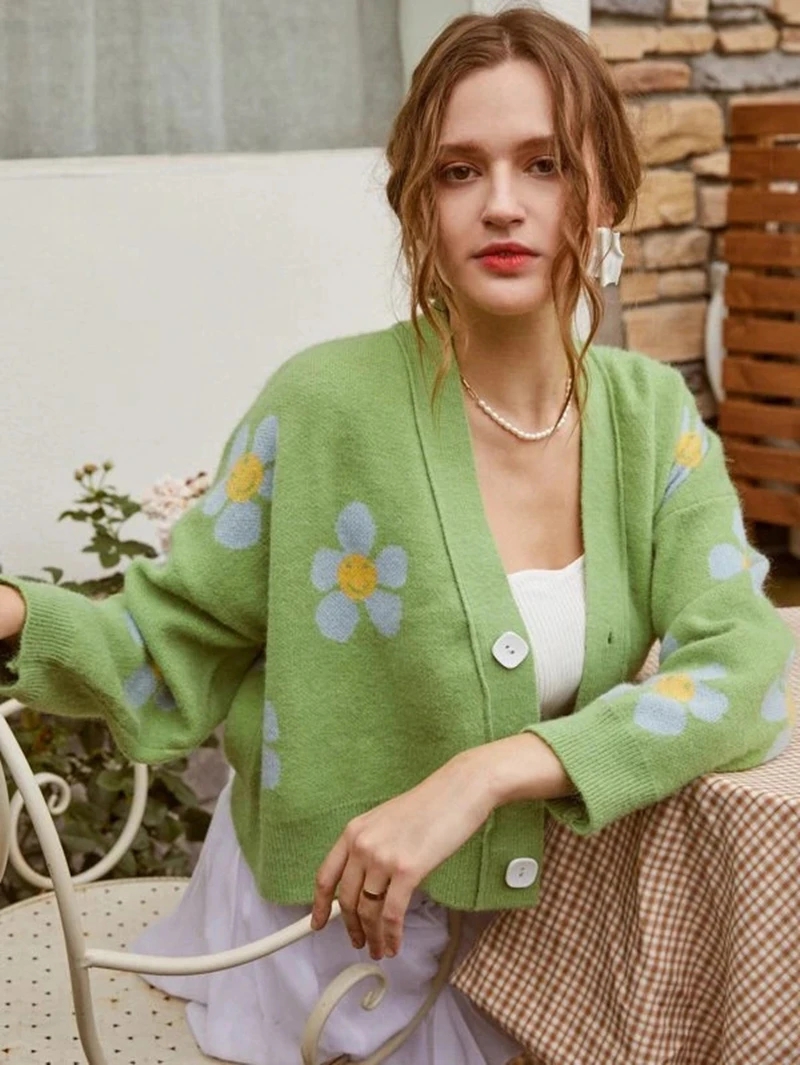 2020 Autumn College Cardigans Sweater Women Loose V Neck Flower Green Sweater Female Short Cute Casual Coat Thicked