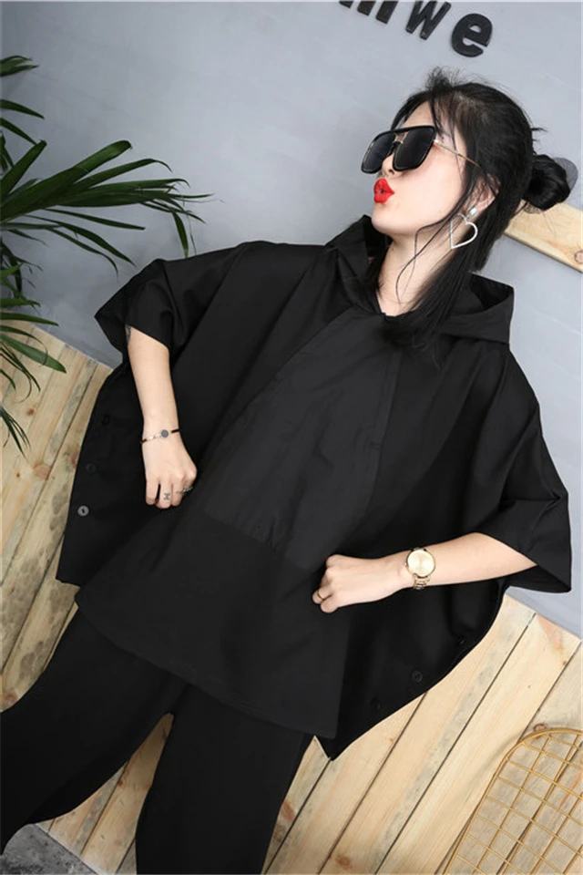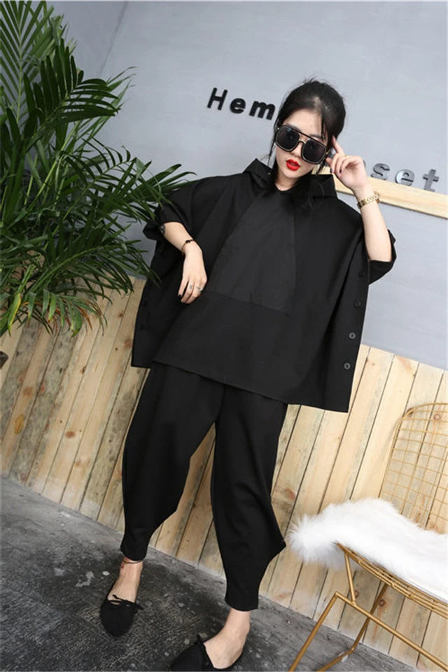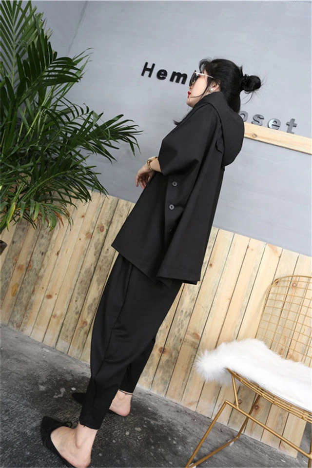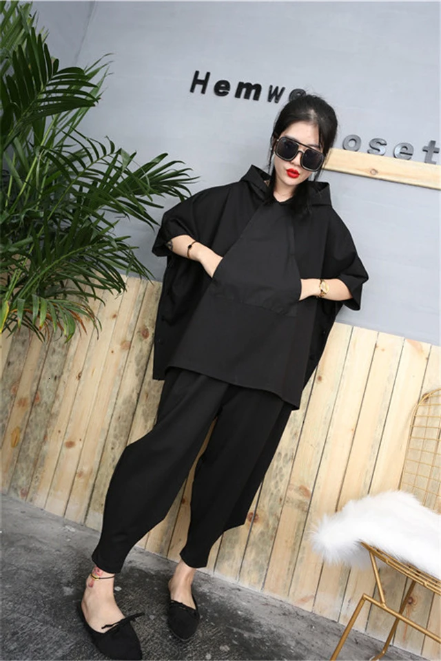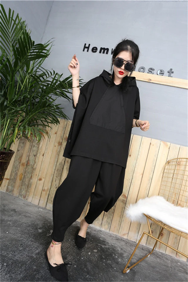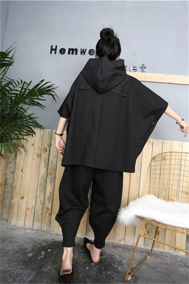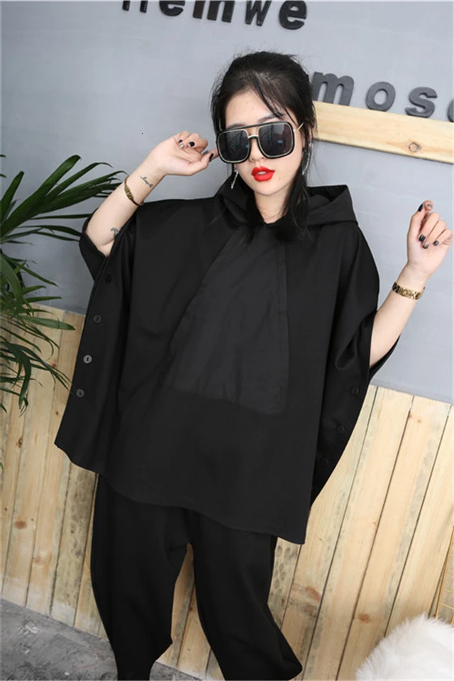 2020 Black Hip Hop 2 Piece Set Autumn Oversized Tracksuit Hooded Tops + Harem Pants Women Suit Female Cloak Bat Shirt Clothing