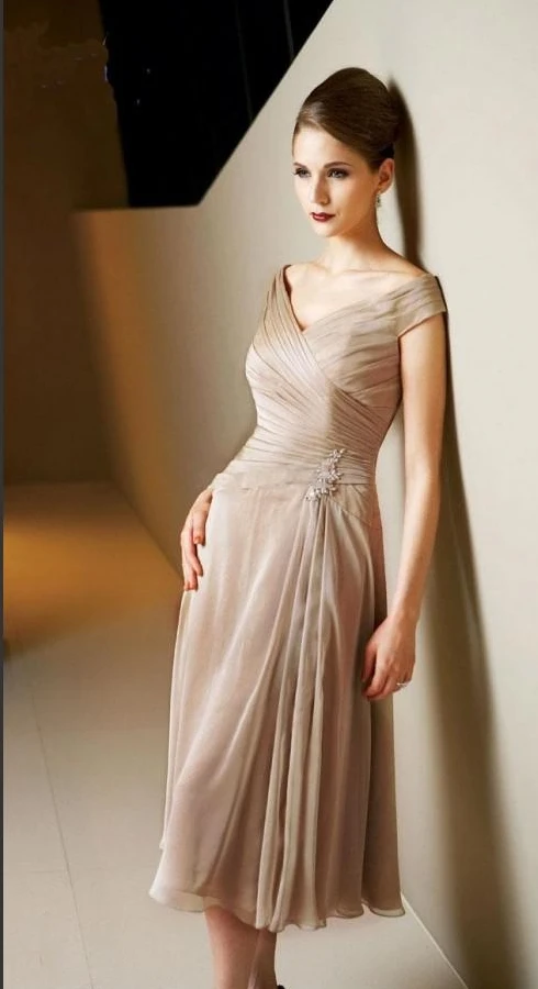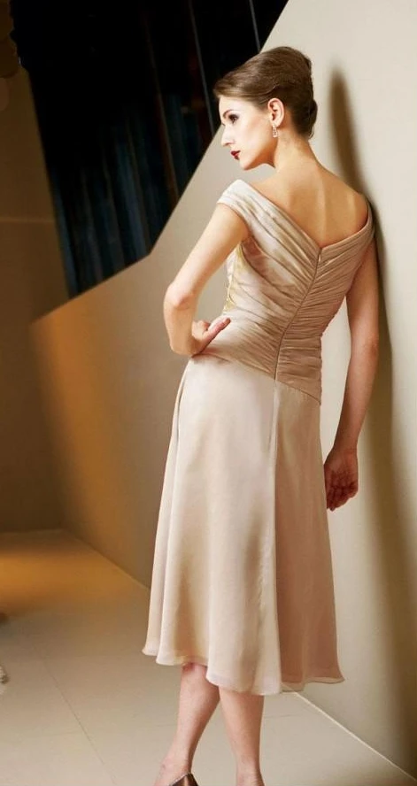 2020 Champagne Off-the-Shoulder Mother of the Bride Dresses Knee-length Prom Formal Gowns With Capped Appliques robe de soriee