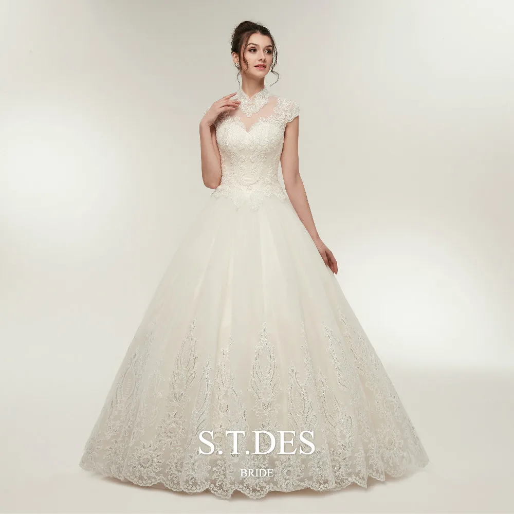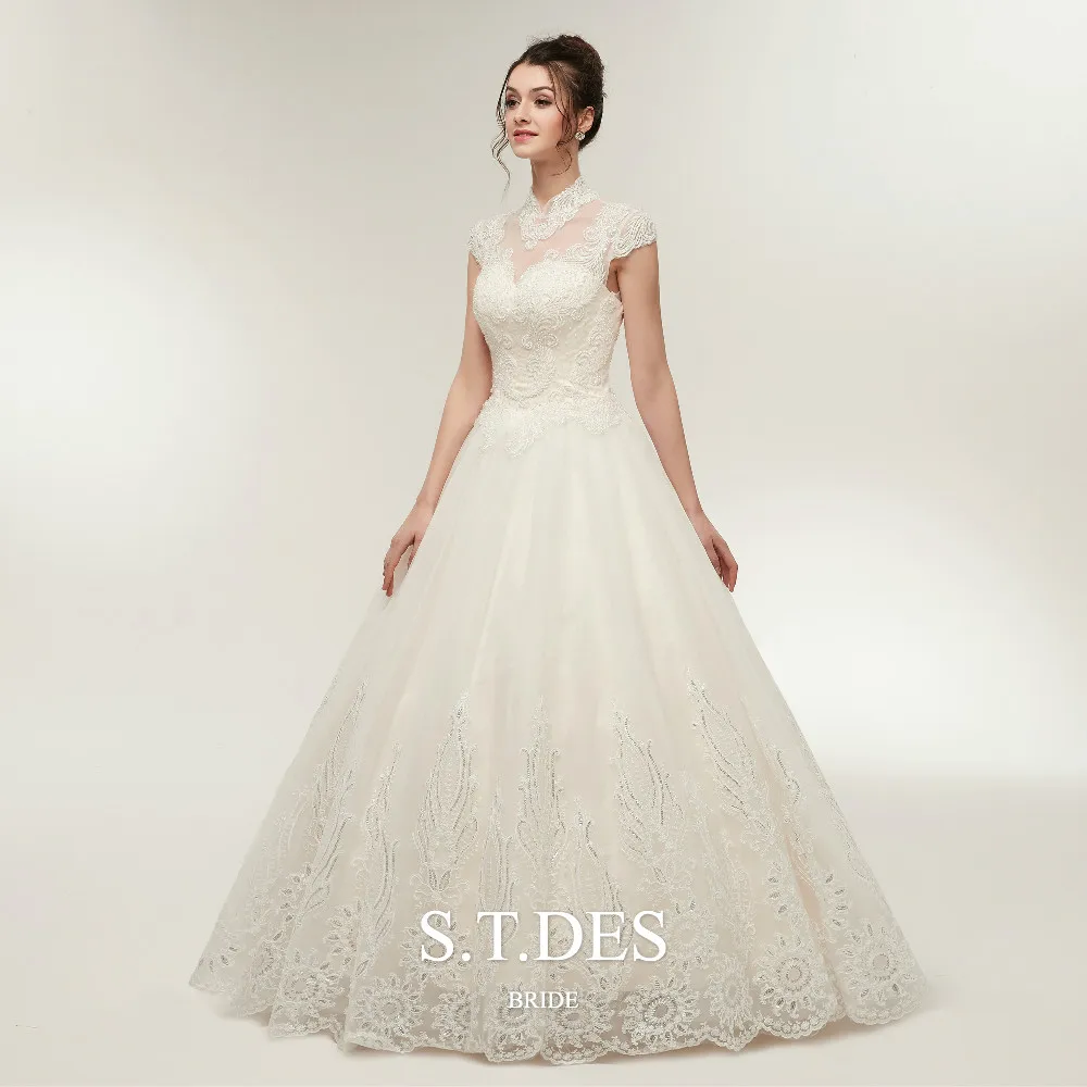 2020 S.T.Des Chinese Style Sheer Neck Sequined Appliques Lace Bride Gown Cap Sleeves Sexy Back Floor-Length Wedding Dress Woman