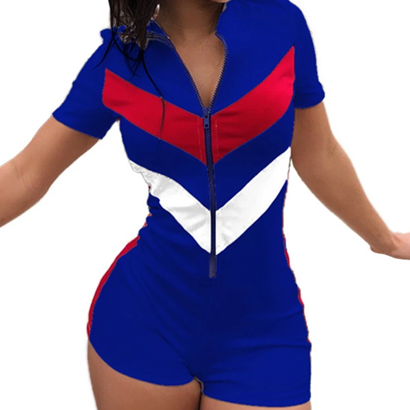 2020 Sexy Jumpsuit Women Summer Zipper Short Sleeve Stitching Color Casual Female Playsuit Shorts Rompers Shorts Bodysuit
