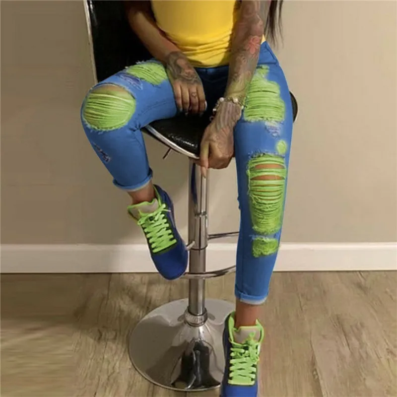 2020 Sexy Women Slim Jeans Trousers Color Contrast Patchwork Tassels Ripped High-waist Ruffles Denim Jeans Holes Pencil Pants
