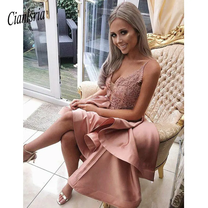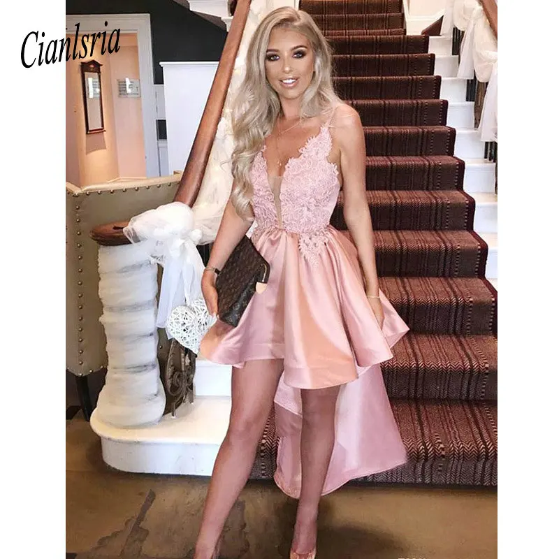 2020 Short Pink V Neck Cooktail Dresses Spaghetti Straps Homecoming Dresses High Low Prom Dresses