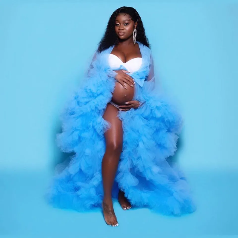 2020 Sky Blue Bridal Tulle Maternity Robes Long Sleeves See Through Tulle Dresses For Party Prom Women Dressing Gown