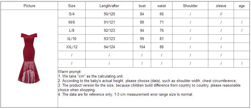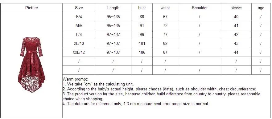 Picture Size Length/after bust waist Shoulder sleeve age S/4 95/135 86 67 / // M/6 95/135 91 72 / / / L/8 97/137 96 77 / / / XL/10 97/137 101 82 / / XXL/12 97/137 106 87 / / / / / / / / / / / /…