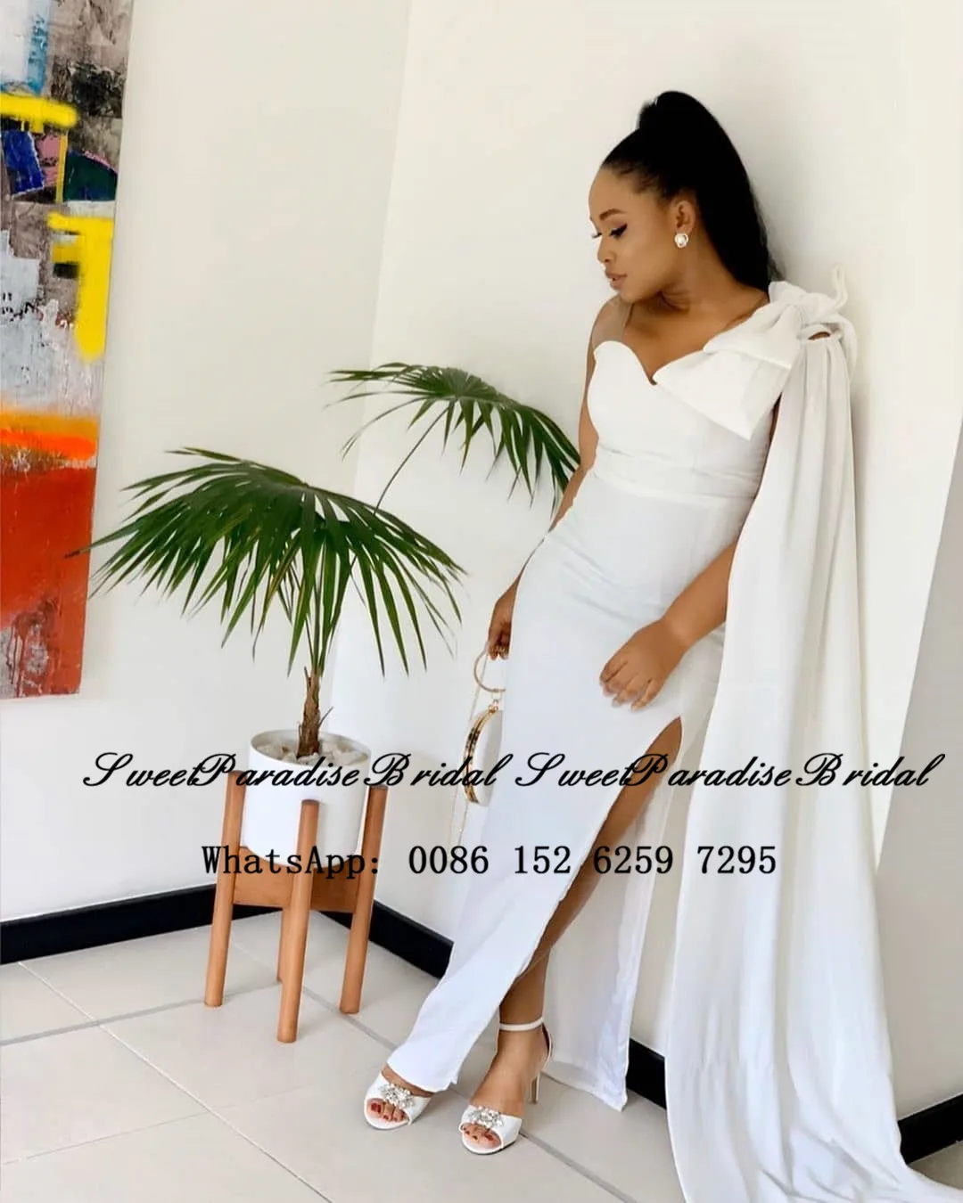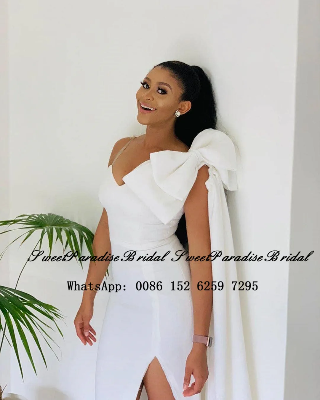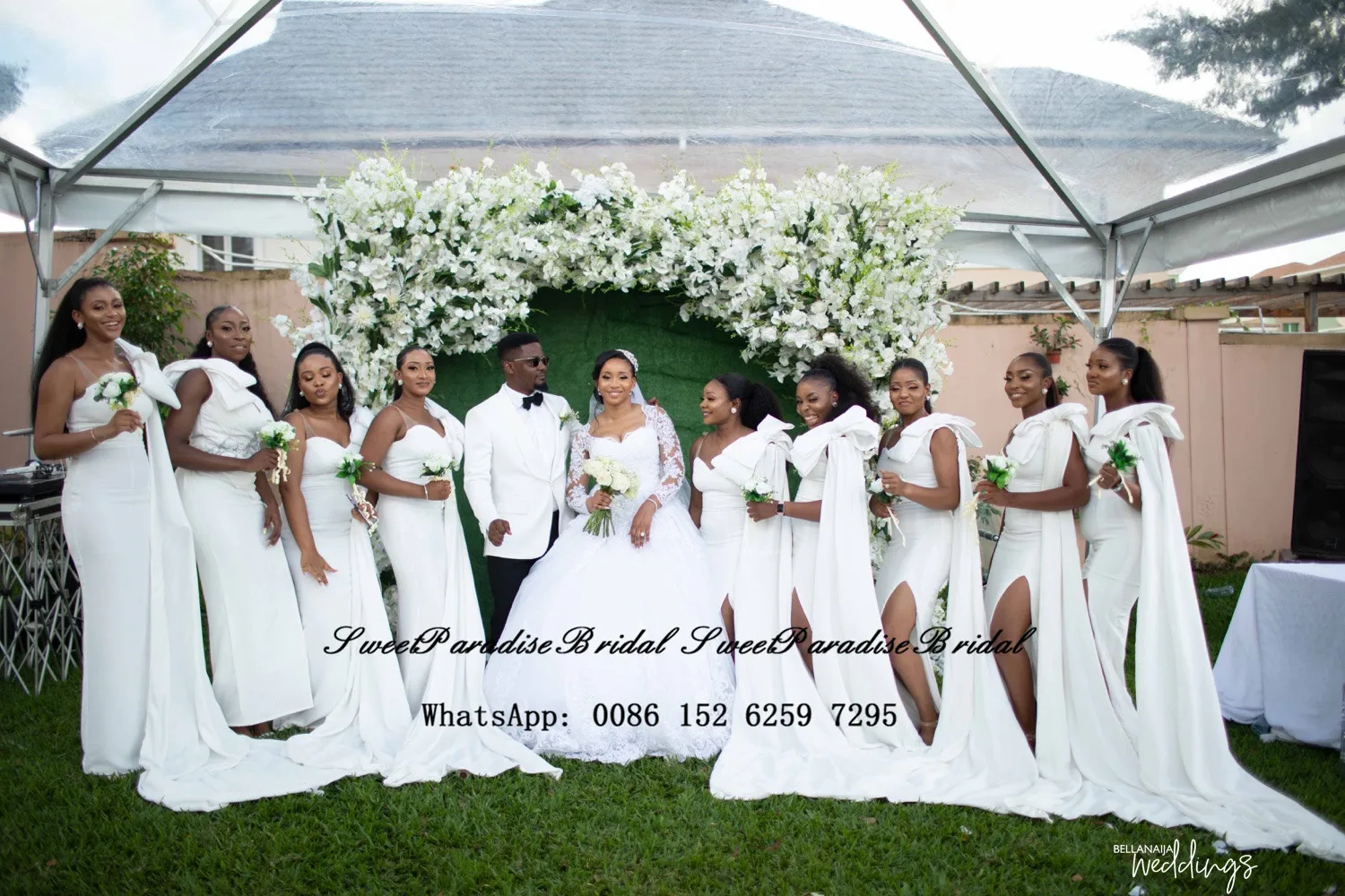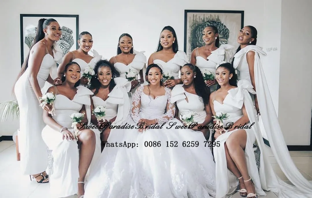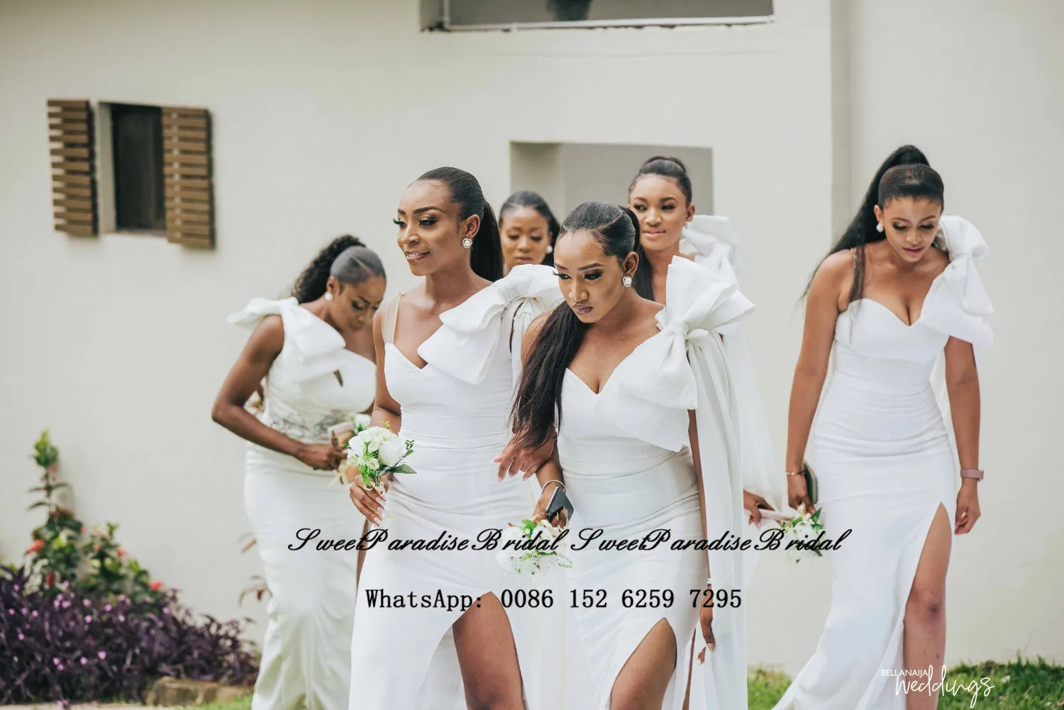 2020 White Mermaid Bridesmaid Dresses With Bow Cap Ribbon Women Sexy Side Split Long Prom Dress Wedding Party Gown Vestidos Floor Length Customize Lace Up Back Wholesale Price Under 100