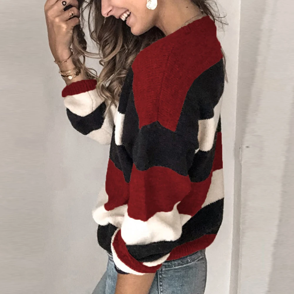 Women Fall Casual Long Sleeve Pullover O Neck Color Block Loose Knitted Sweater