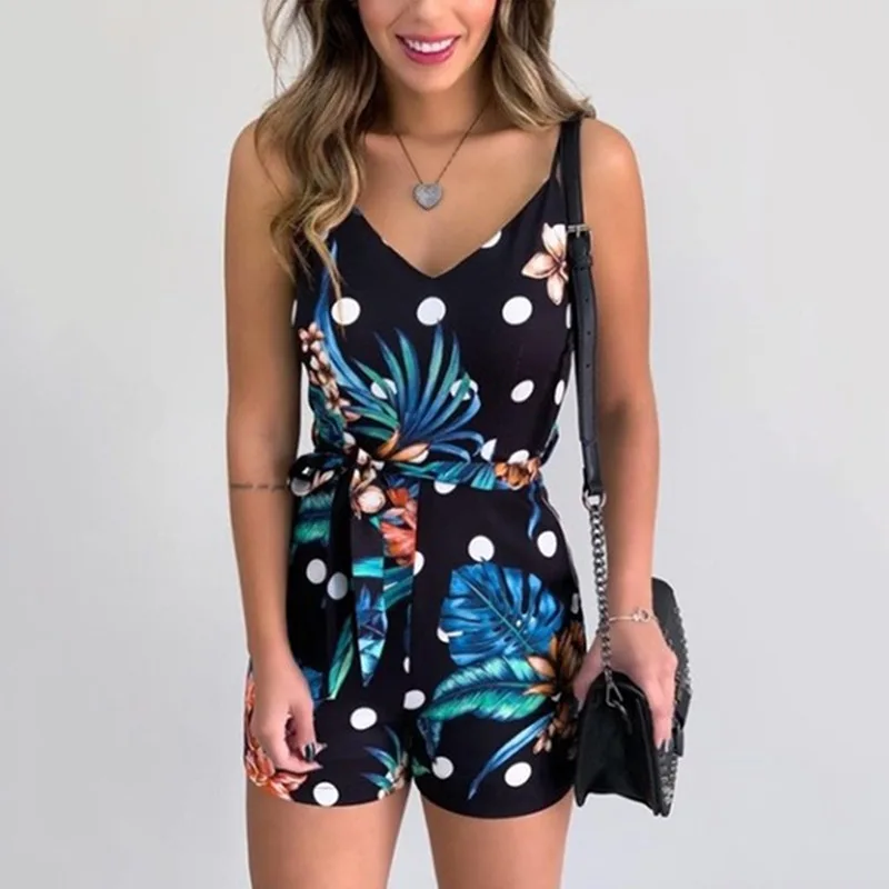 2020 NEW Women’s Summer Print Jumpsuit Casual Slim Short Sleeve V-Neck Beach Rompers Sleeveless Bodycon Sexy Playsuit