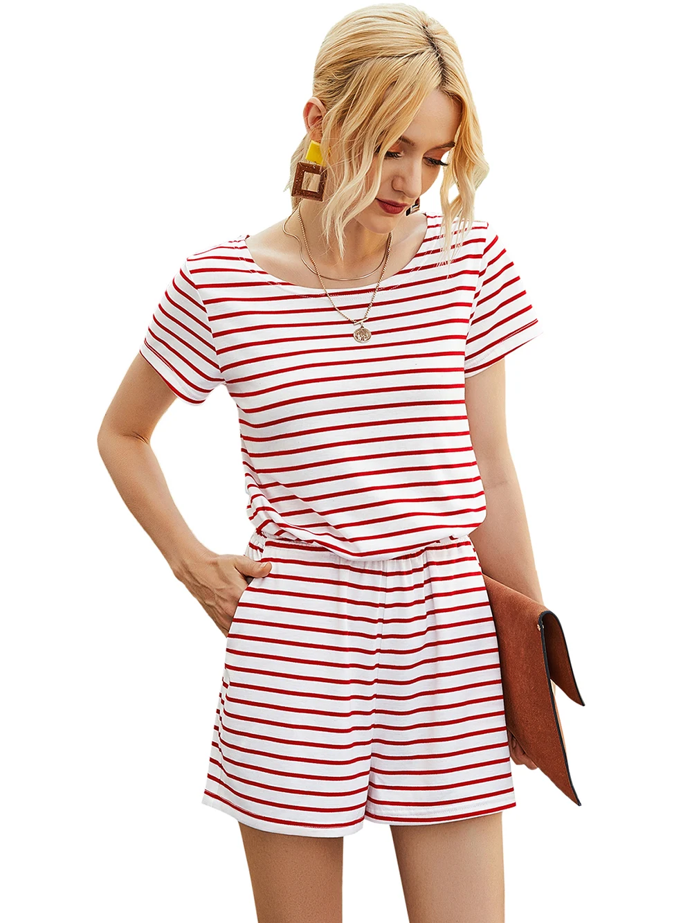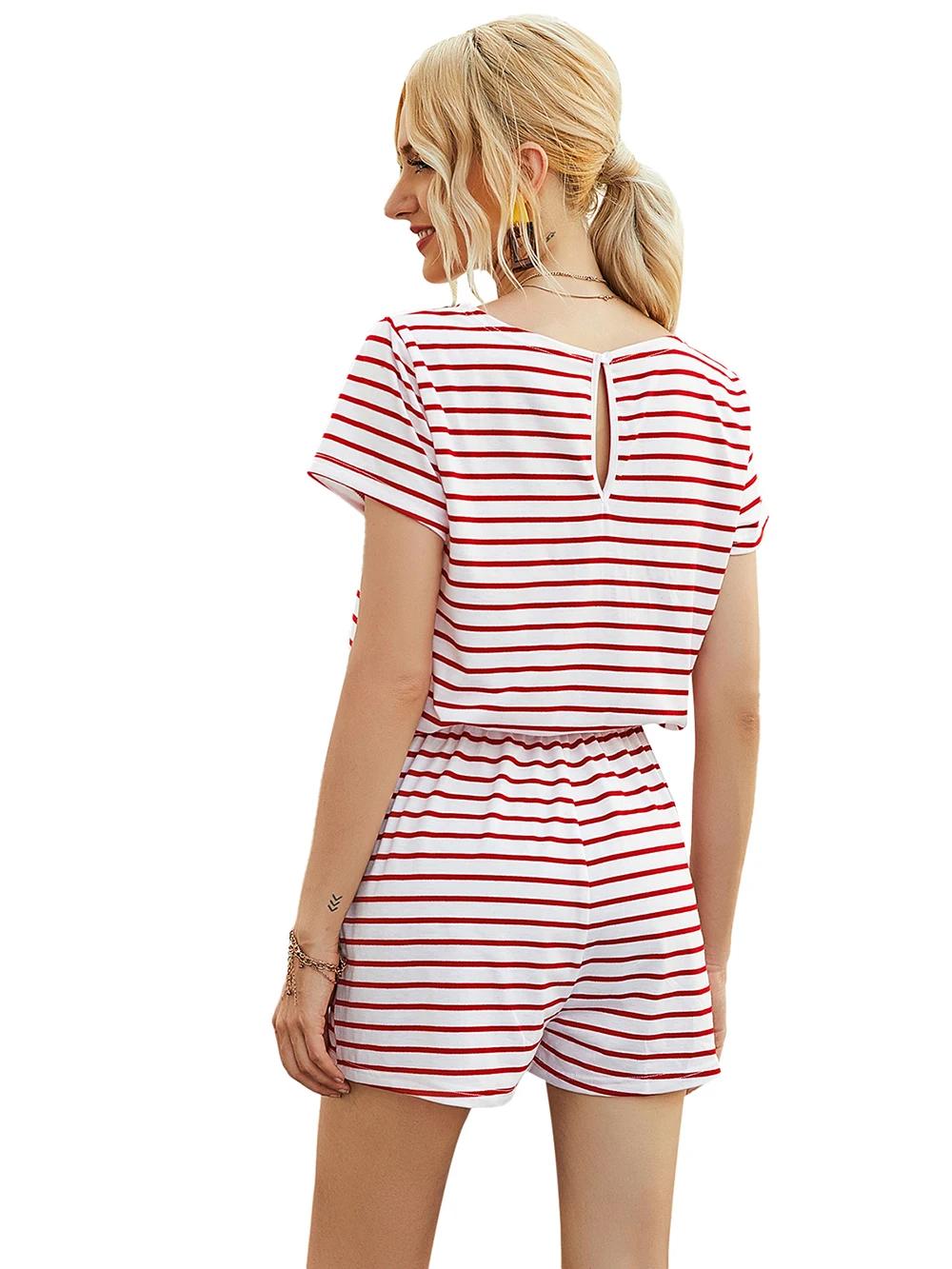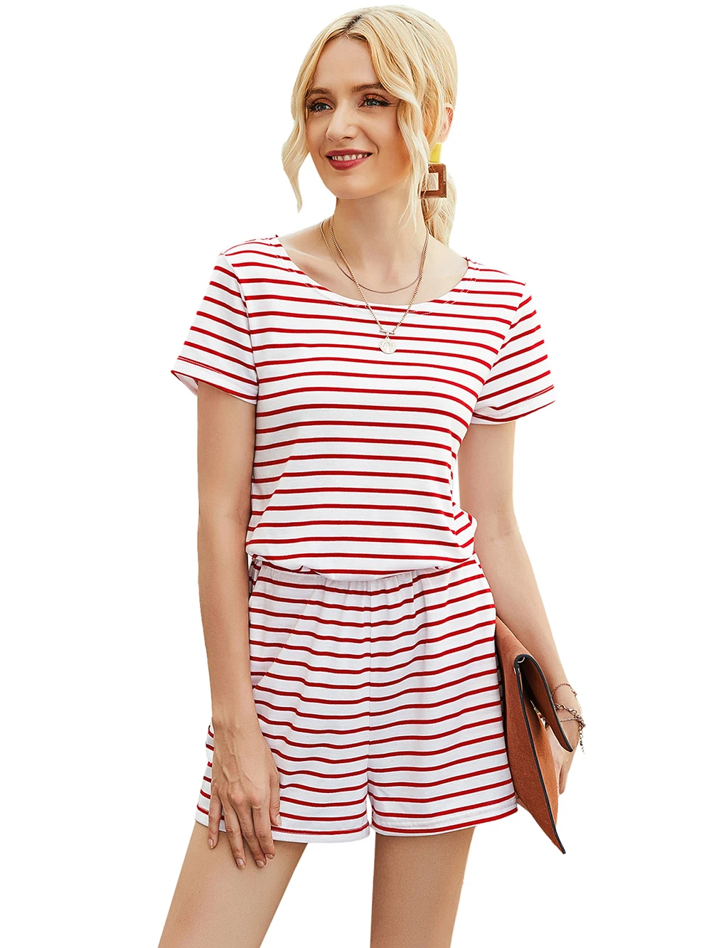 2021 Spring Summer New Casual Striped Short-Sleeved Jumpsuit Women’s Round Neck Short-Sleeved T-Shirt Jumpsuit