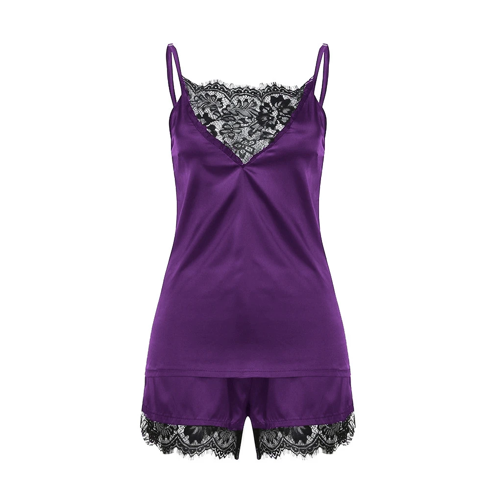 2pcs/Set Women Sexy Satin Babydoll Lingerie Lace Patchwork Top + High Waist Shorts Sleepwear Nightdress Pajamas