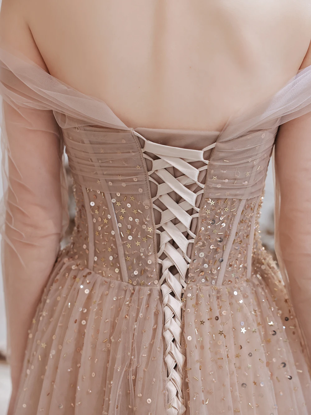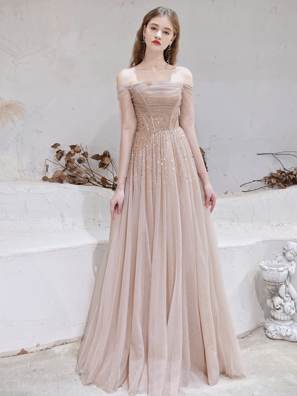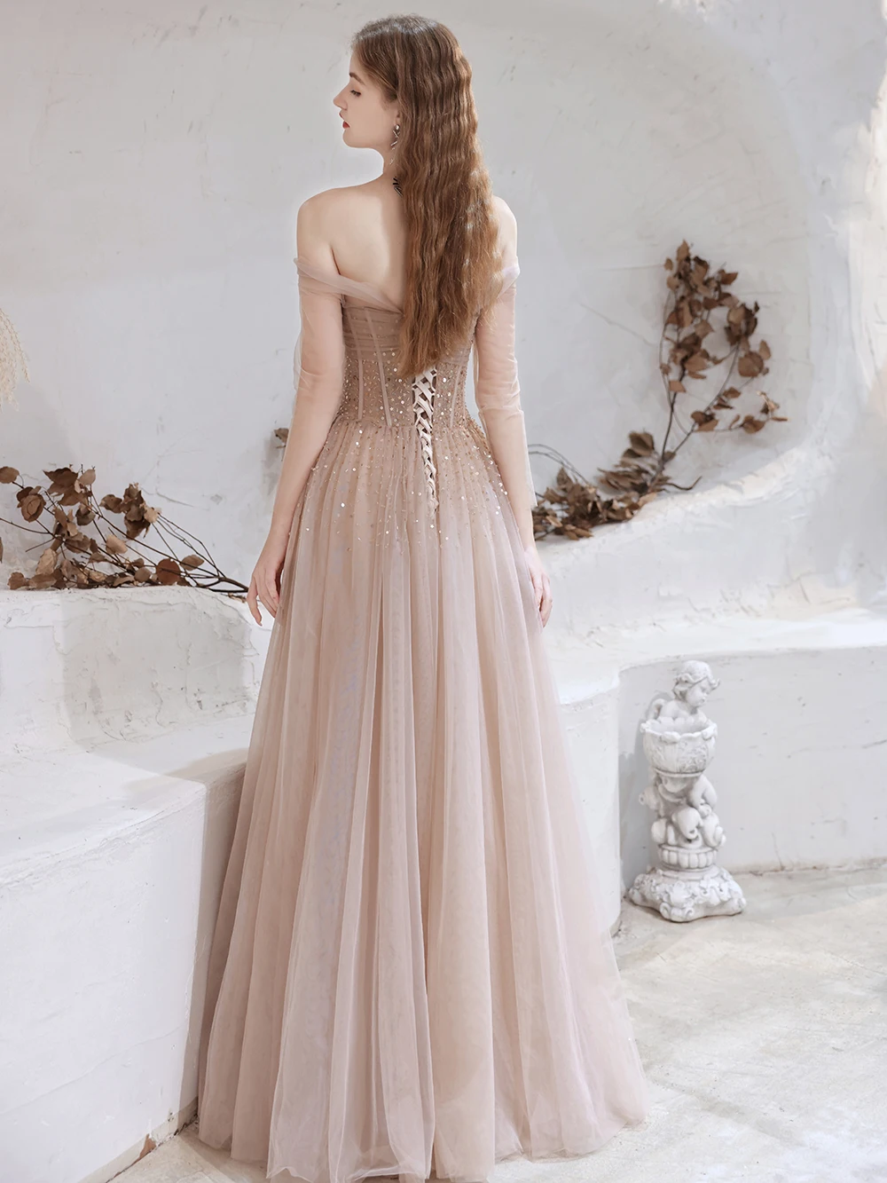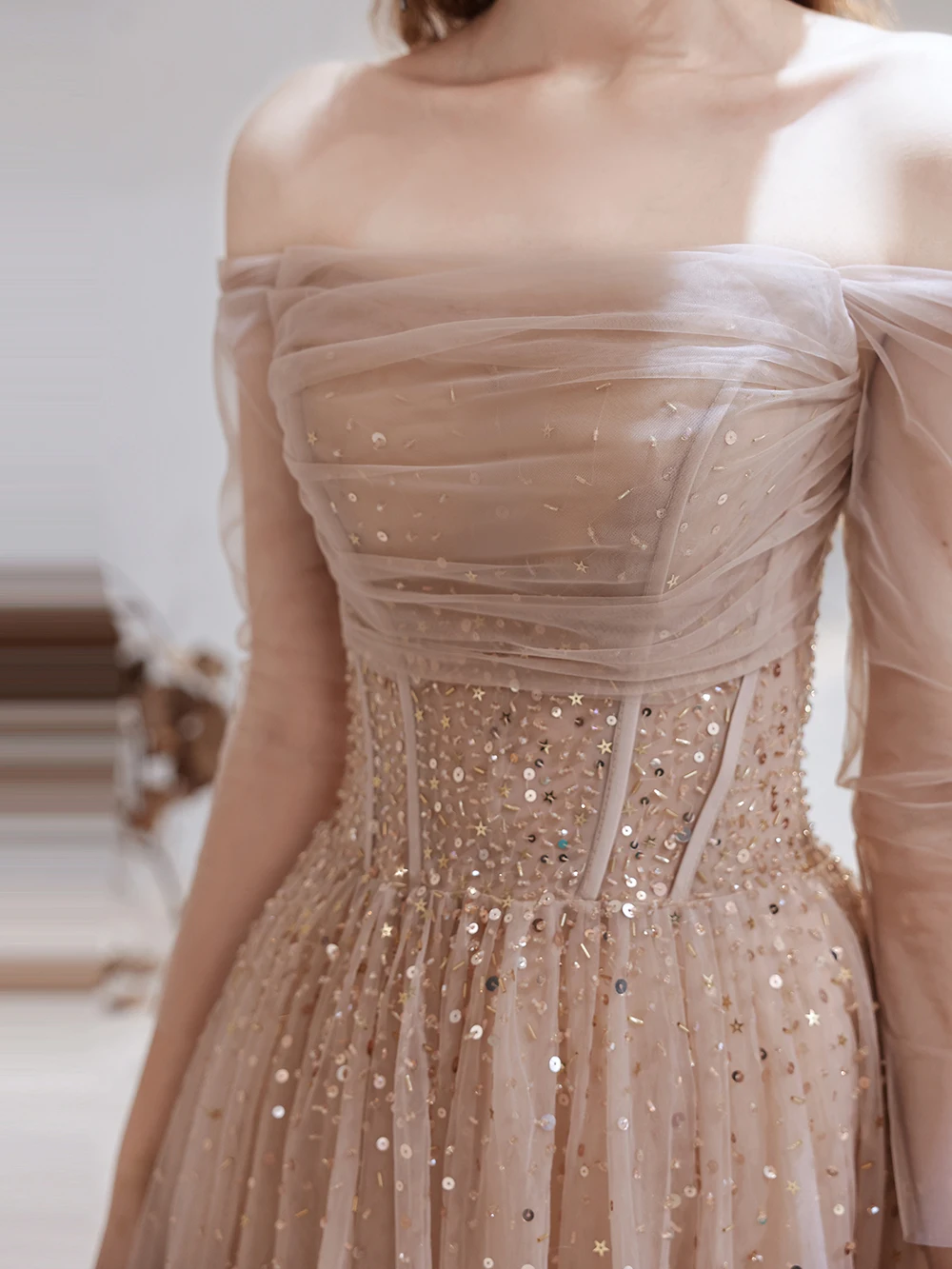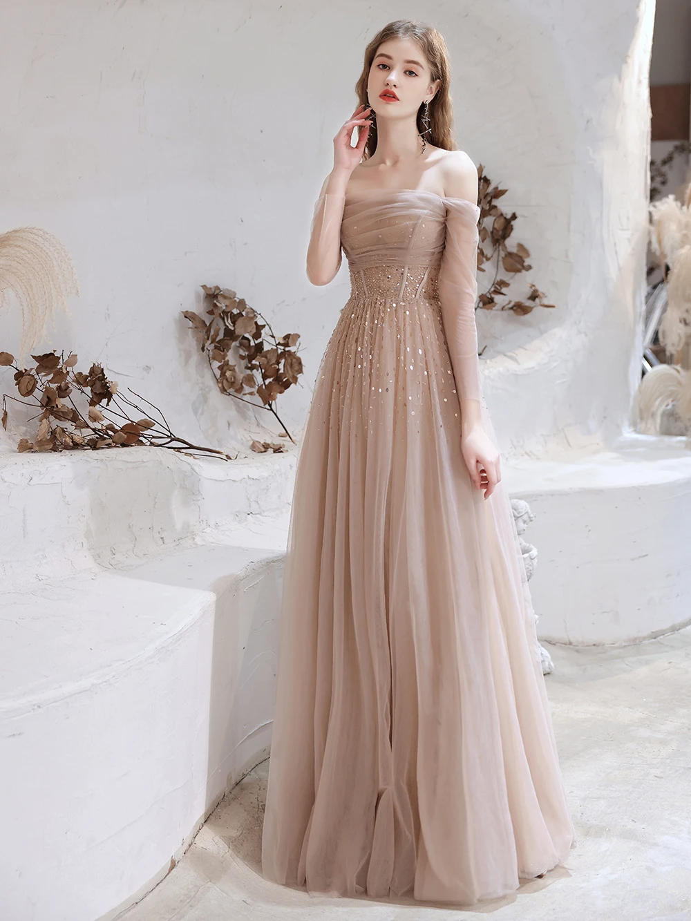 A-Line Evening Prom Dresses Boat Neck Full Illusion Sleeves Luxury Sequined Beading Long Nude Pink 2020 Long Party Gowns