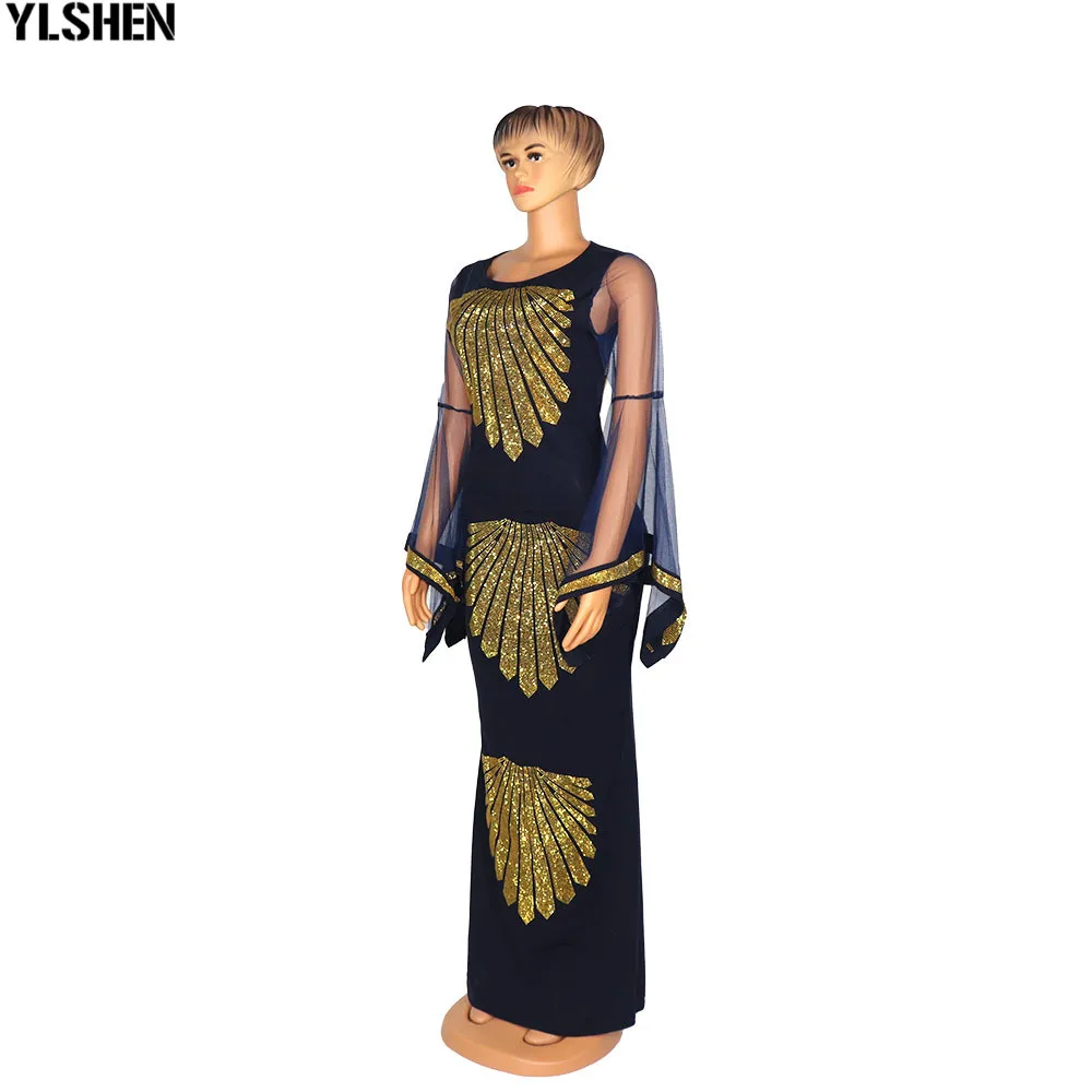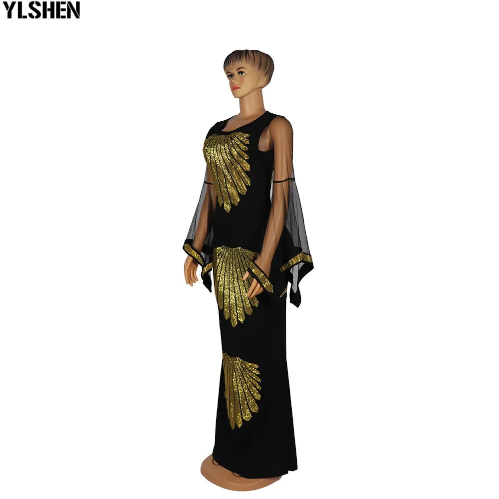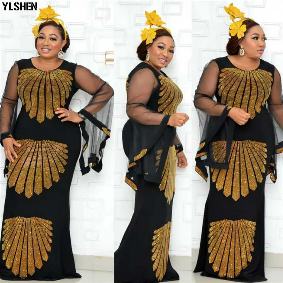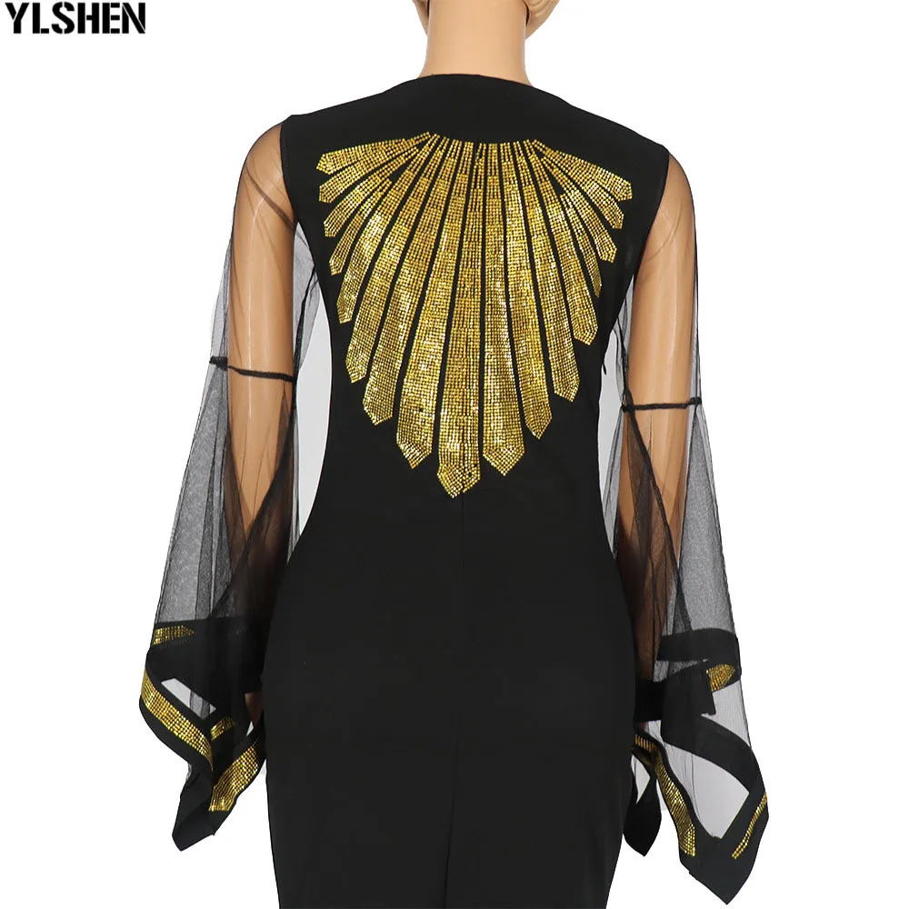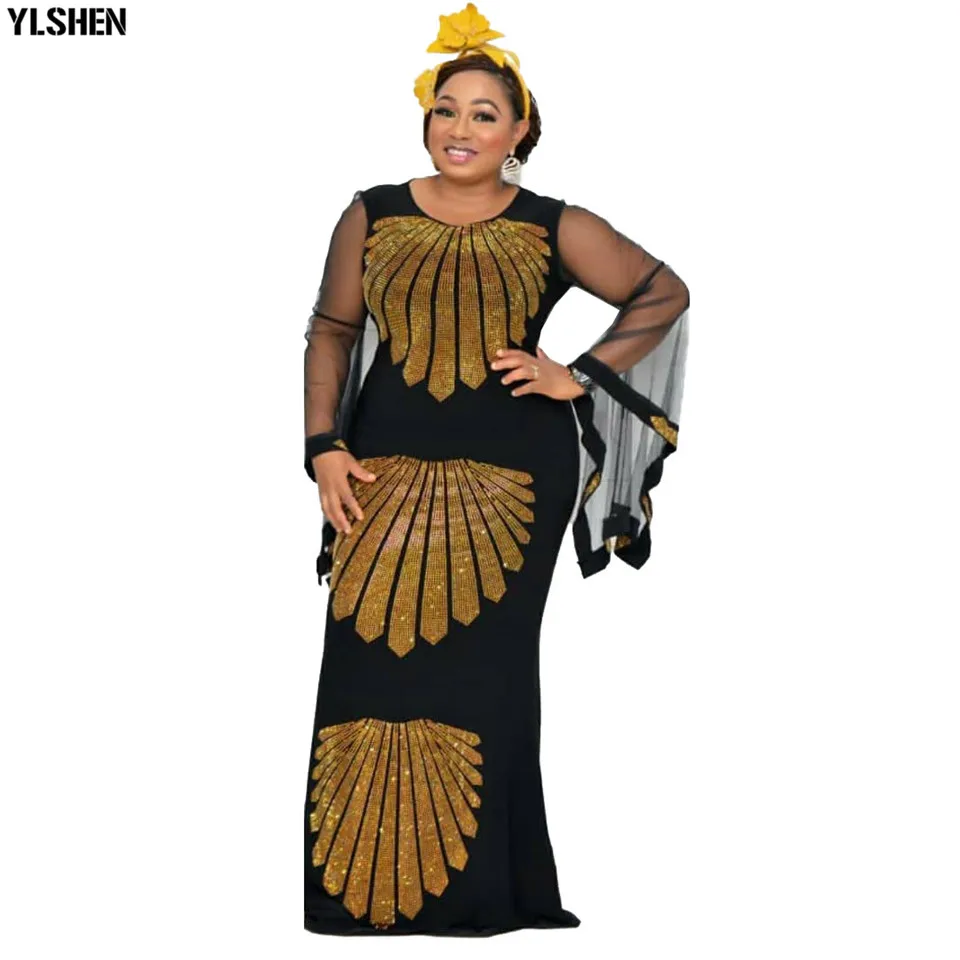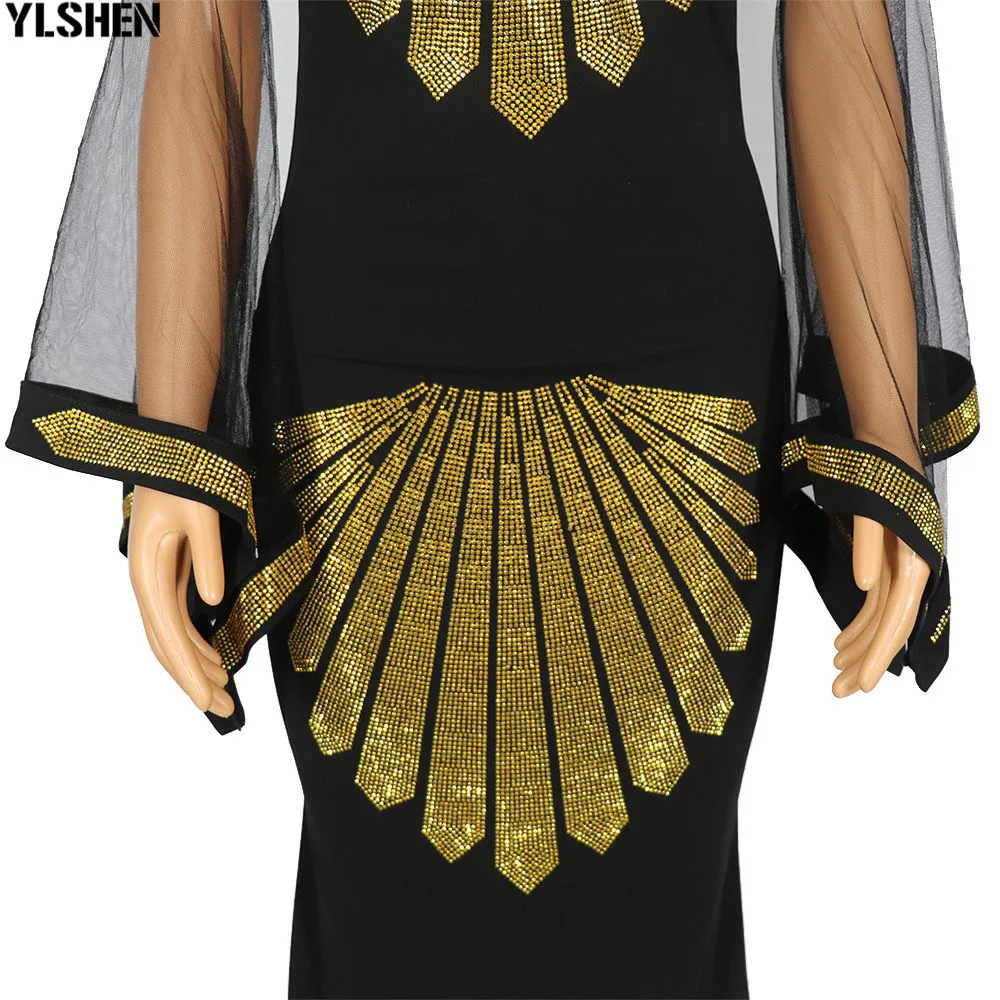 African Dresses For Women Dashiki Mesh Ruffle Sleeve Robe African Dress Africa Clothes Super Elastic Diamonds Party Maxi Dress