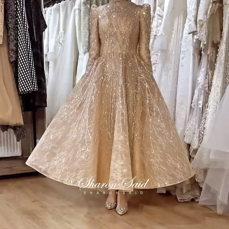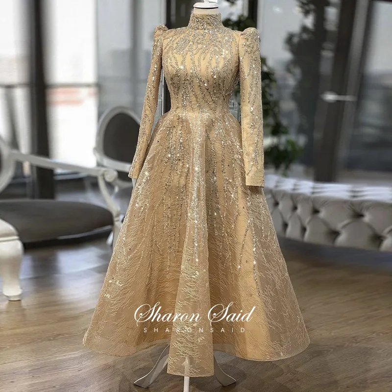 Arabic Gold Long Sleeve Muslim Evening Dresses 2021 Long Luxury Dubai Party Formal Dress Women Elegant High Neck Ankle Length
