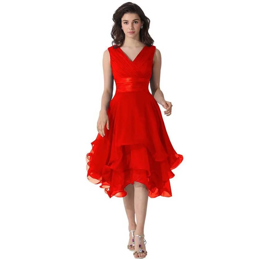 Occasion: Special Occasion Dresses Itme Tyle : Evening Dress Waistline : Natural Fabric Type : Chiffon Silhouette: A-Line Dress Length: Knee Length Neckline : V-Neck Sleeve Length : Sleeveless Decoration: Criss-Cross, Sashes Image Type: Reference Images Train: No Built-in Bra: Yes Brand Name: Women Evening Dress Is Customized: Yes Size…
