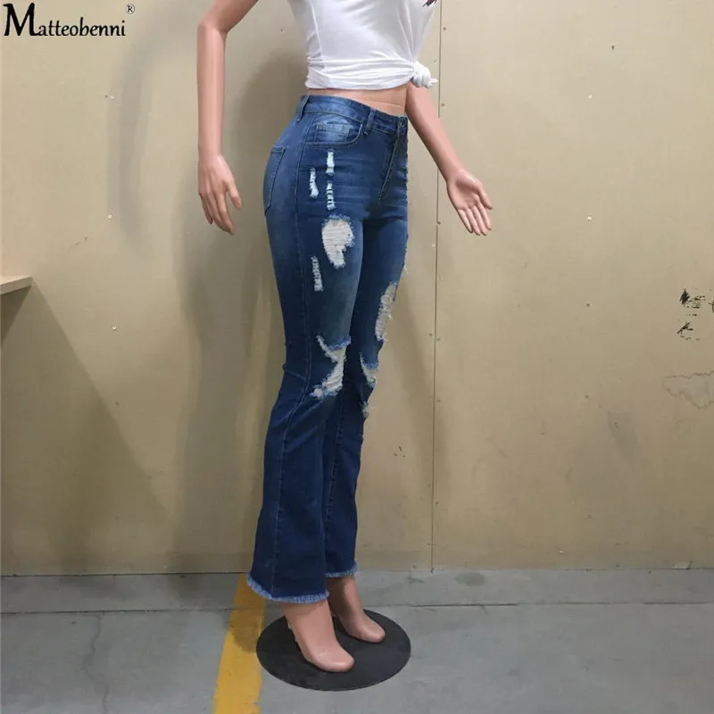 Autumn Women Vintage Casual Ripped Bell Bottom Jeans Female Stretch Skinny Flare Jean Mom High Waist Denim Pants Streetwear 2020