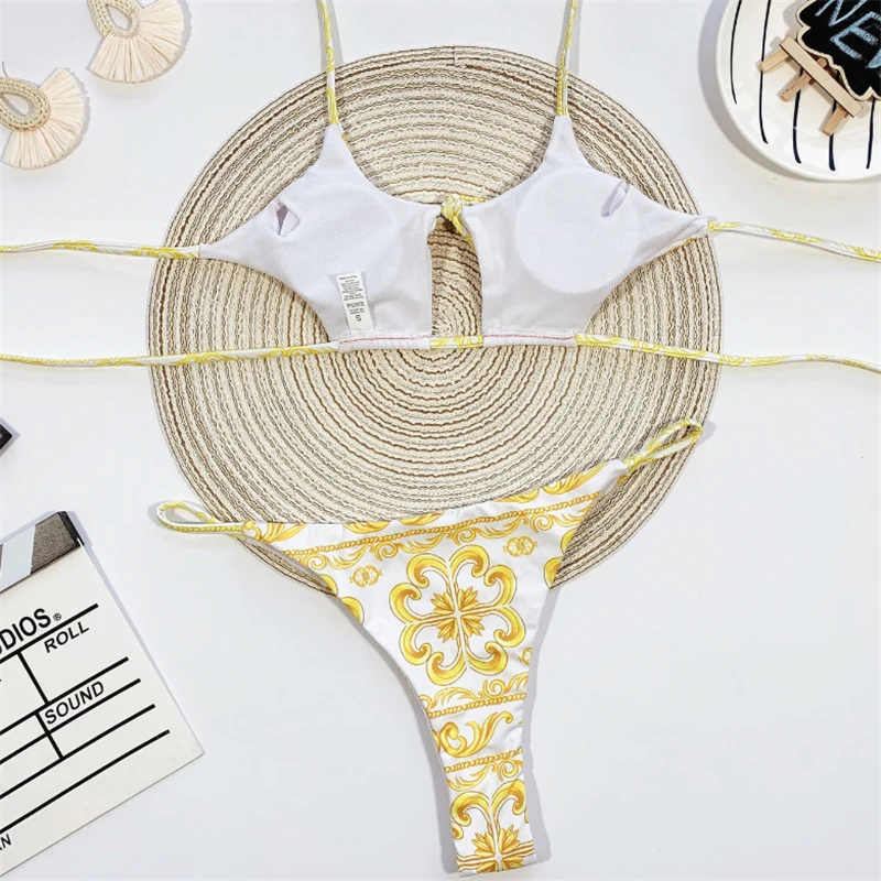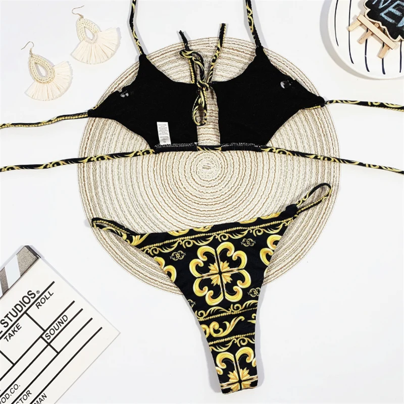 Bandage Swimsuit Women Two Piece Thong Bikini Mujer 2020 Sexy Hollow Out Print Bathing Suit Women Summer Halter Swimwear Biquini