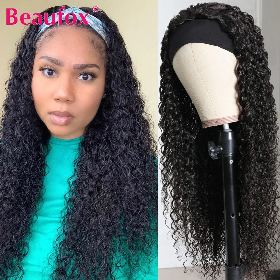 Beaufox Water Wave Headband Wig Human Hair Wigs For Black Women Brazilian Scarf Wig No Lace Glueless Remy Curly Human Hair Wigs