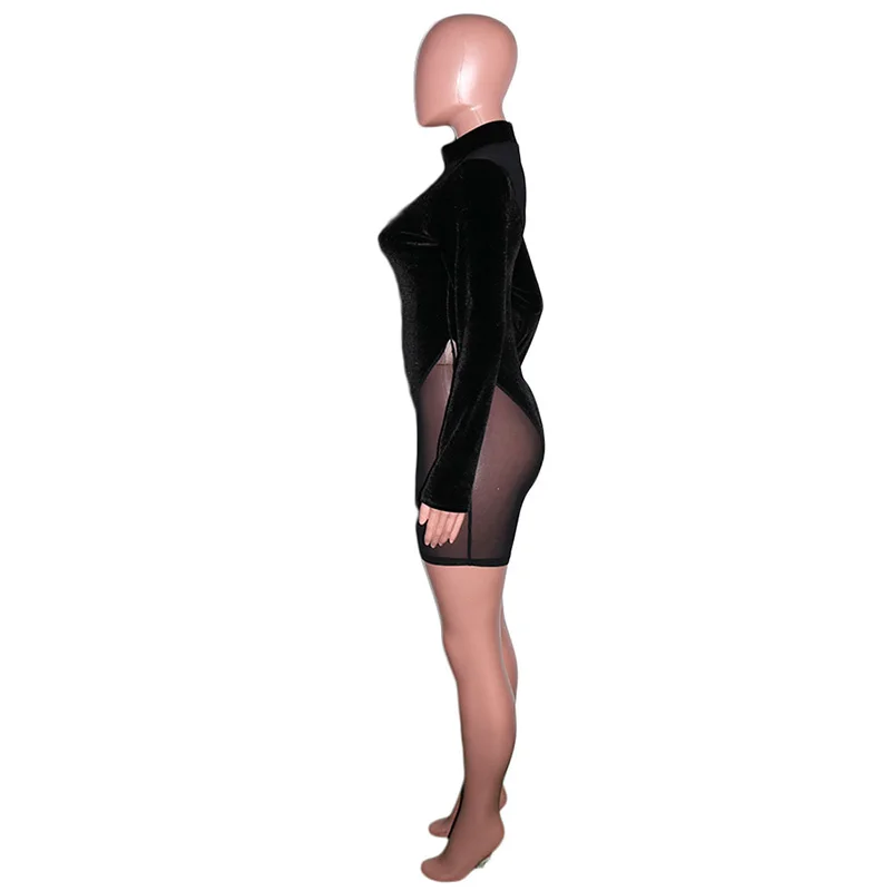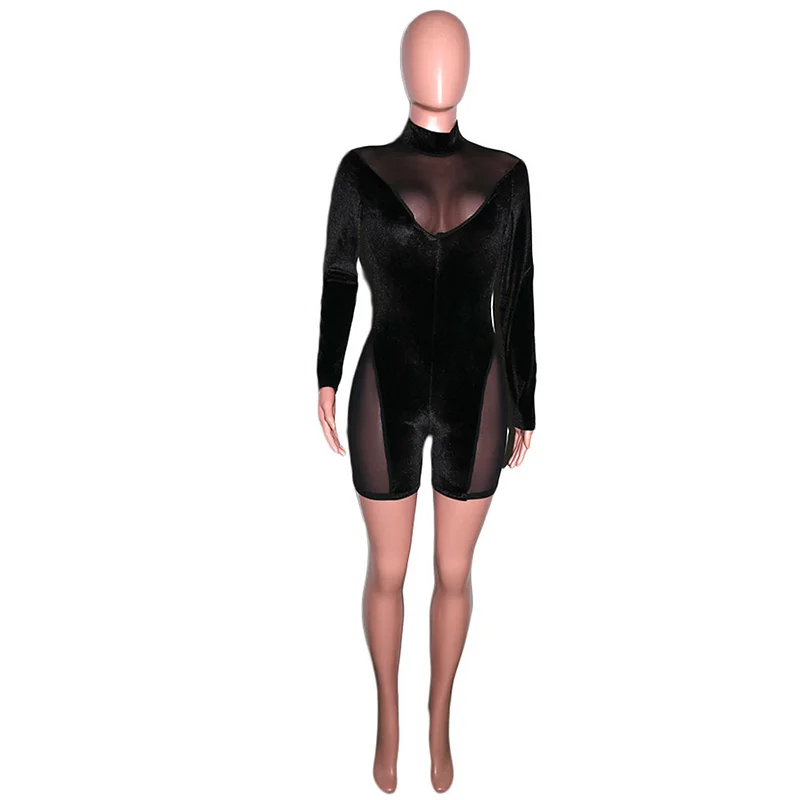 Beyprern New Chic Mesh Patchwork Black Velvet Romper Womens Long Sleeve Bodycon See Through Short Jumpsuit Party Club Outfits