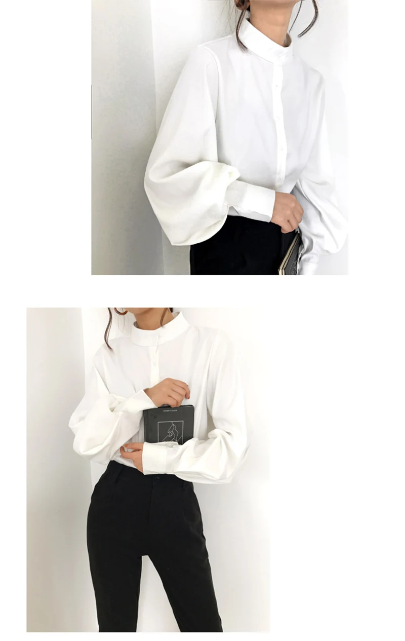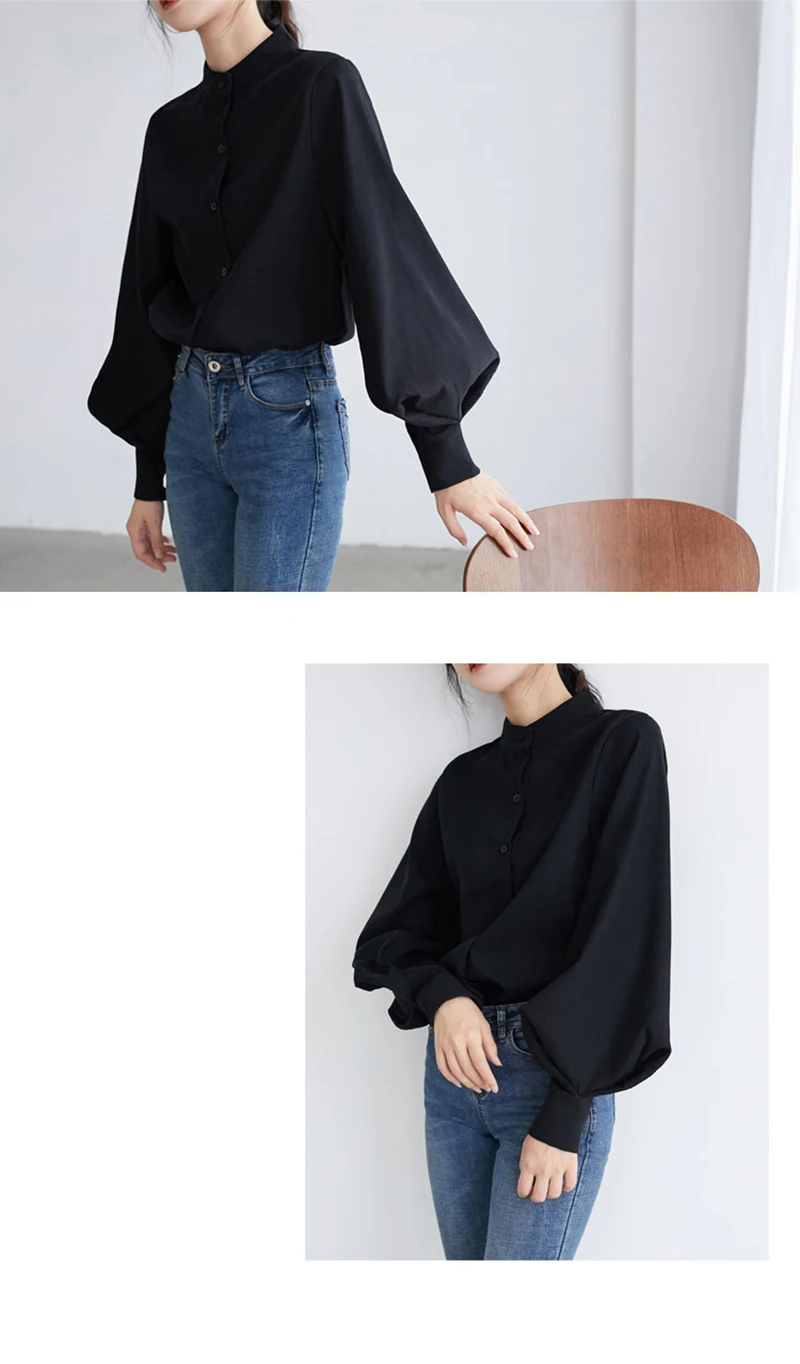 Big Lantern Sleeve Blouse Women Autumn Winter Single Breasted Stand Collar Shirts Office Work Blouse Solid Vintage Blouse Shirts