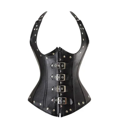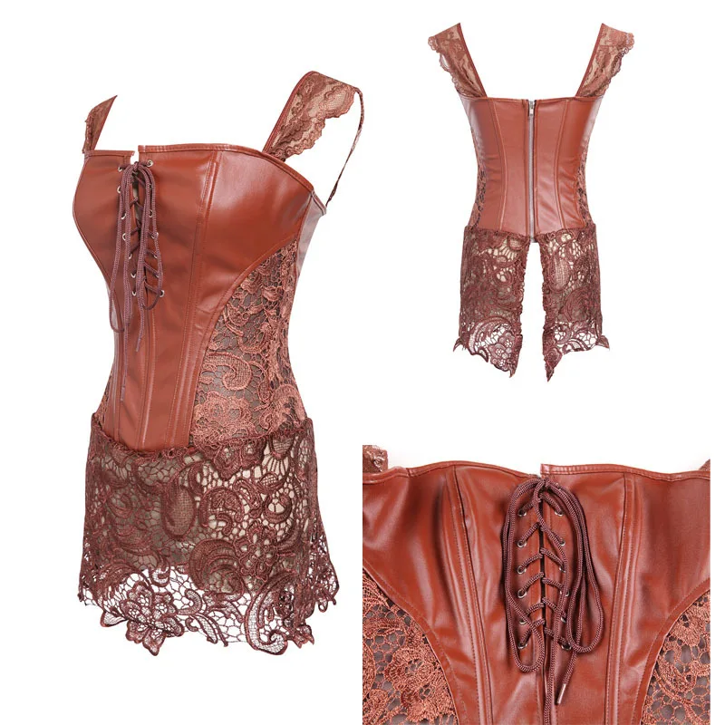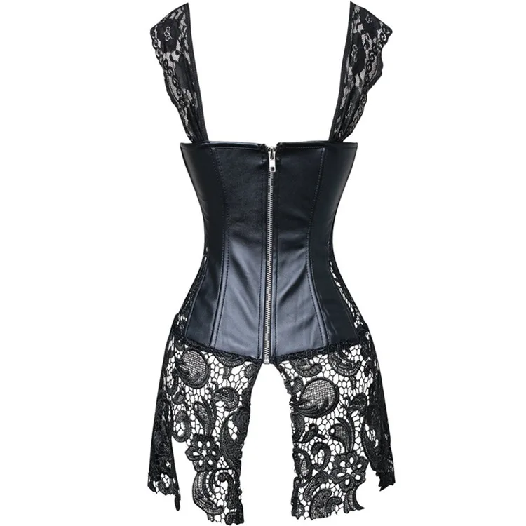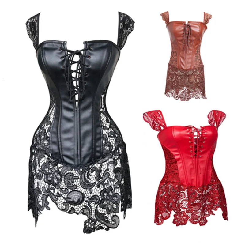 Fashion Black Red Bustier Zipper PU Leather Corset Bustier Dress Set Overbust Sexy Lingerie Women Lace Up Corselet Tops Skirt Thong
