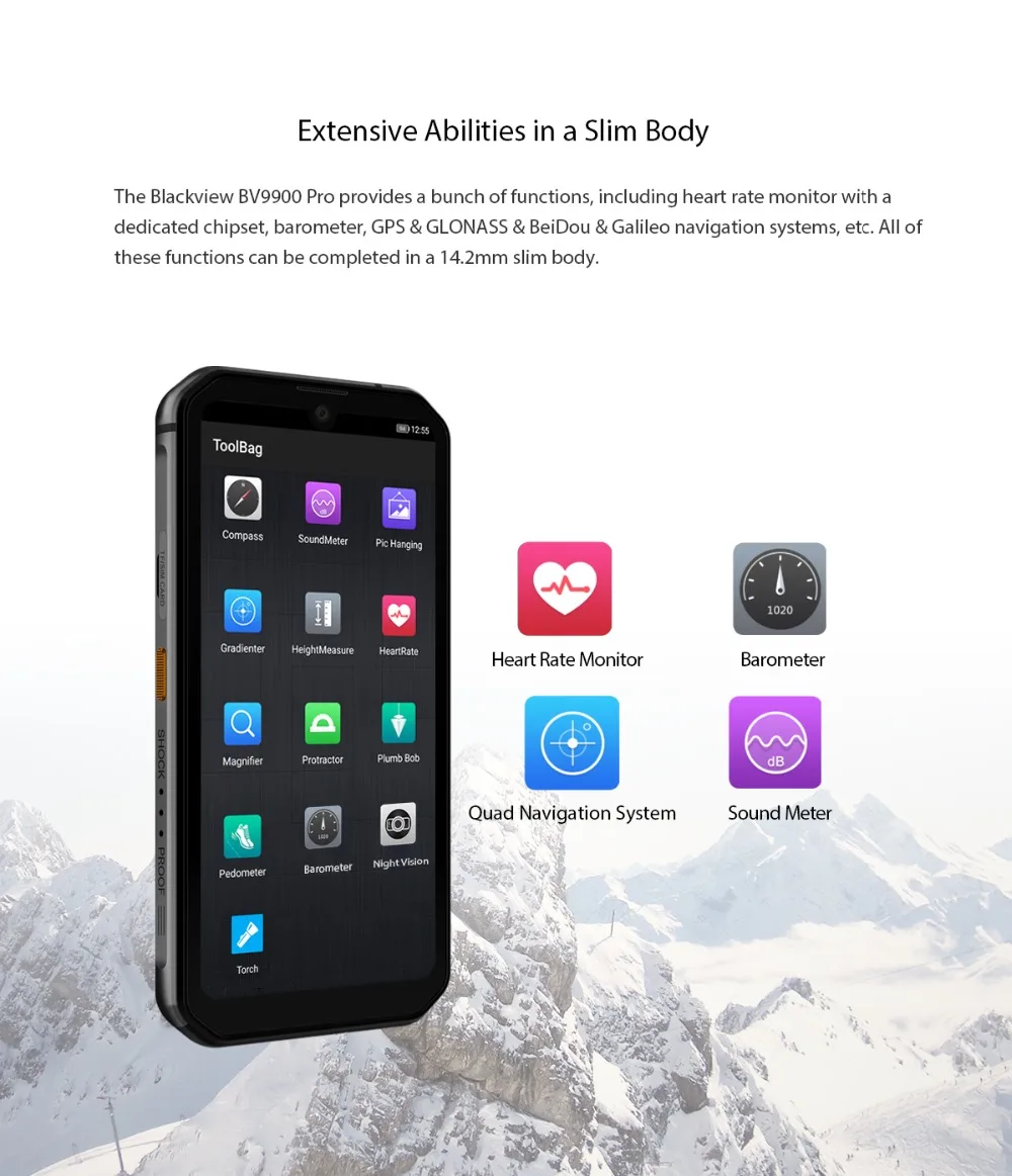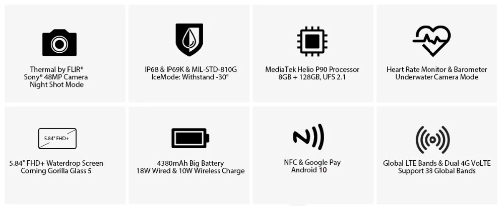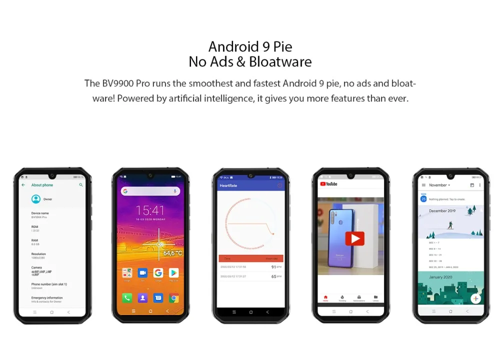 Blackview BV9900 Pro Feature: Thermal Imaging Smartphone (Thermal by FLIR) CPU: Helio P90 Processor OS: Android 10 SIM: 2 Nano SIM (Or 1 Nano + 1 TF) Battery: 4380mAh Memory: 8GB RAM + 128GB ROM GSM: 850/900/1800/1900 3G spec: WCDMA B1/2/4/5/6/8/19 TDS34/39 CDMA BC0/BC1/BC10 4G spec: FDD B1/2/3/4/5/7/8/12/13/17/18/19/20/25/26/28A/28B/66 TDD B34/38/39/40/41…