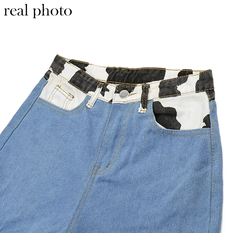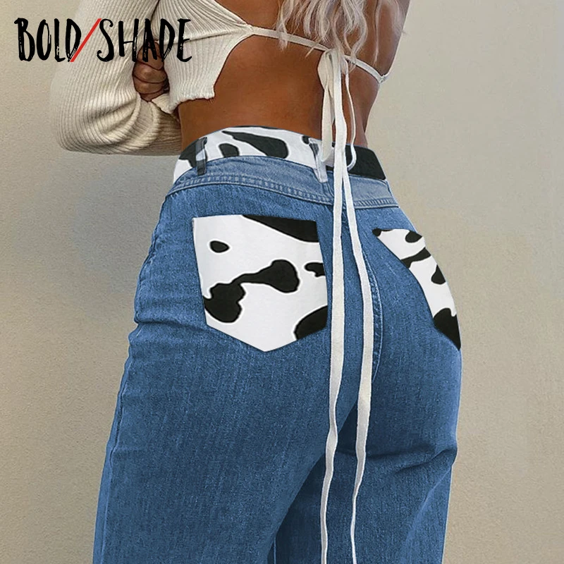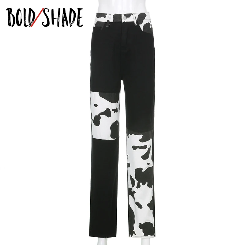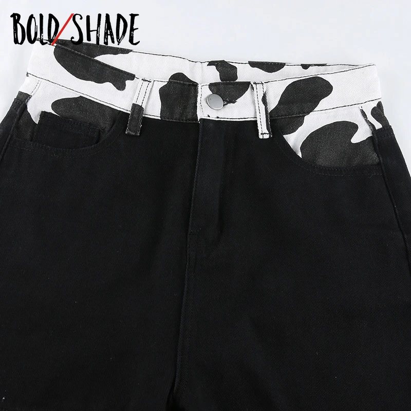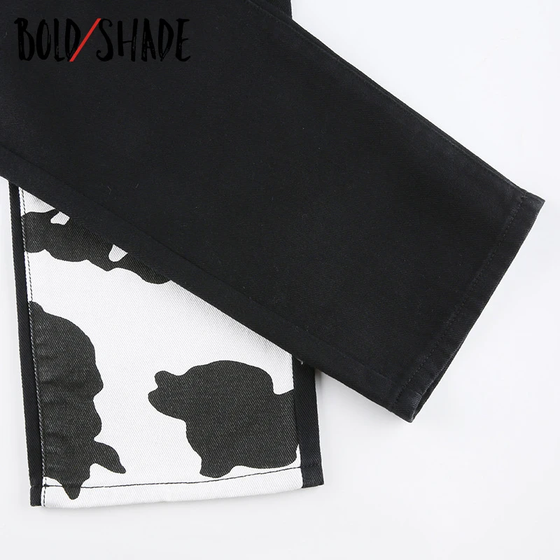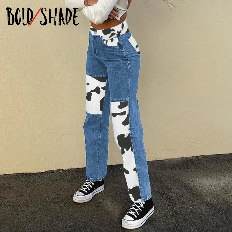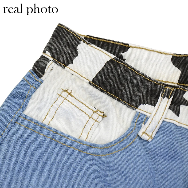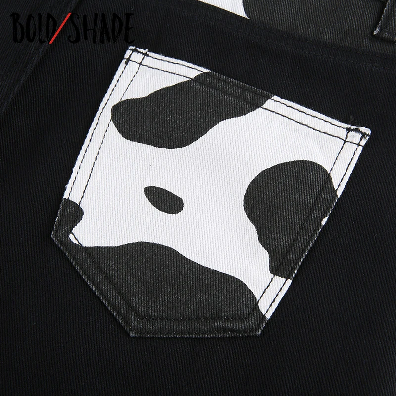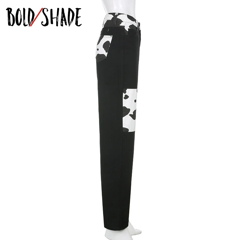 Bold Shade Indie Skater Style 90s Denim Jeans Y2k Grunge Fashion Milk Cow Print Patchwork Jeans Streetwear Pants Women Fall 2020