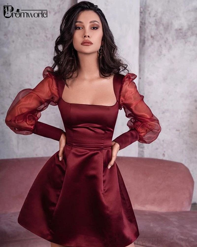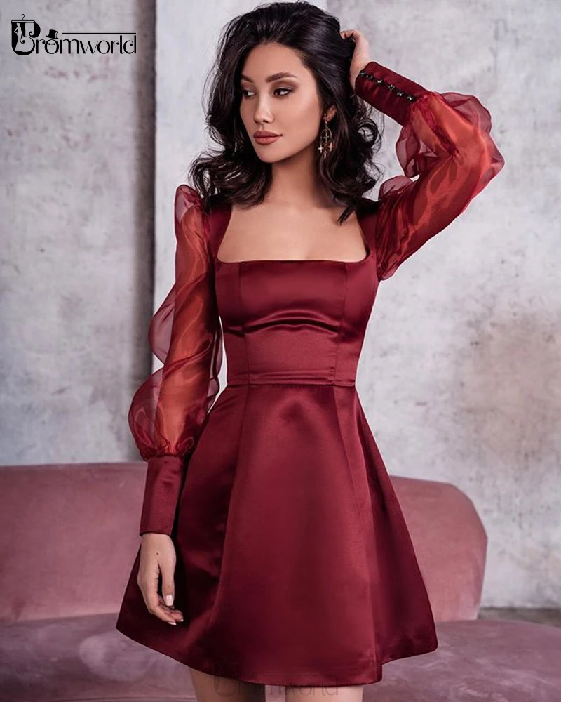 Chic Burgundy Short Mini Prom Homecoming Dresses Elegant A-line Satin Long Sleeves Graduation Party Cocktail Dresses