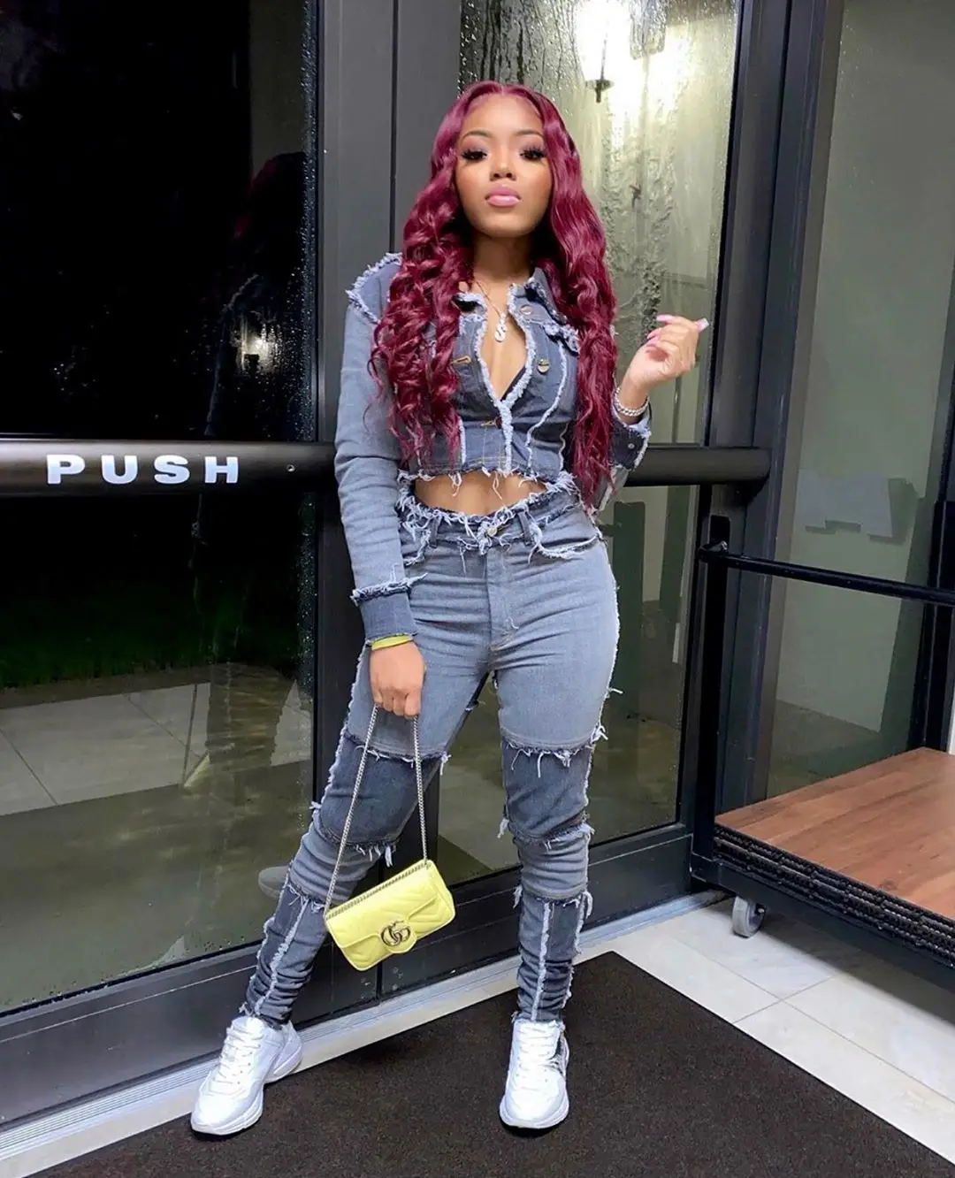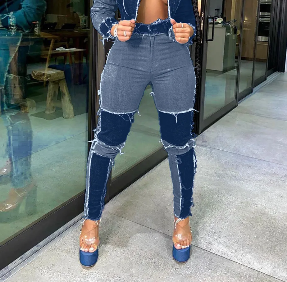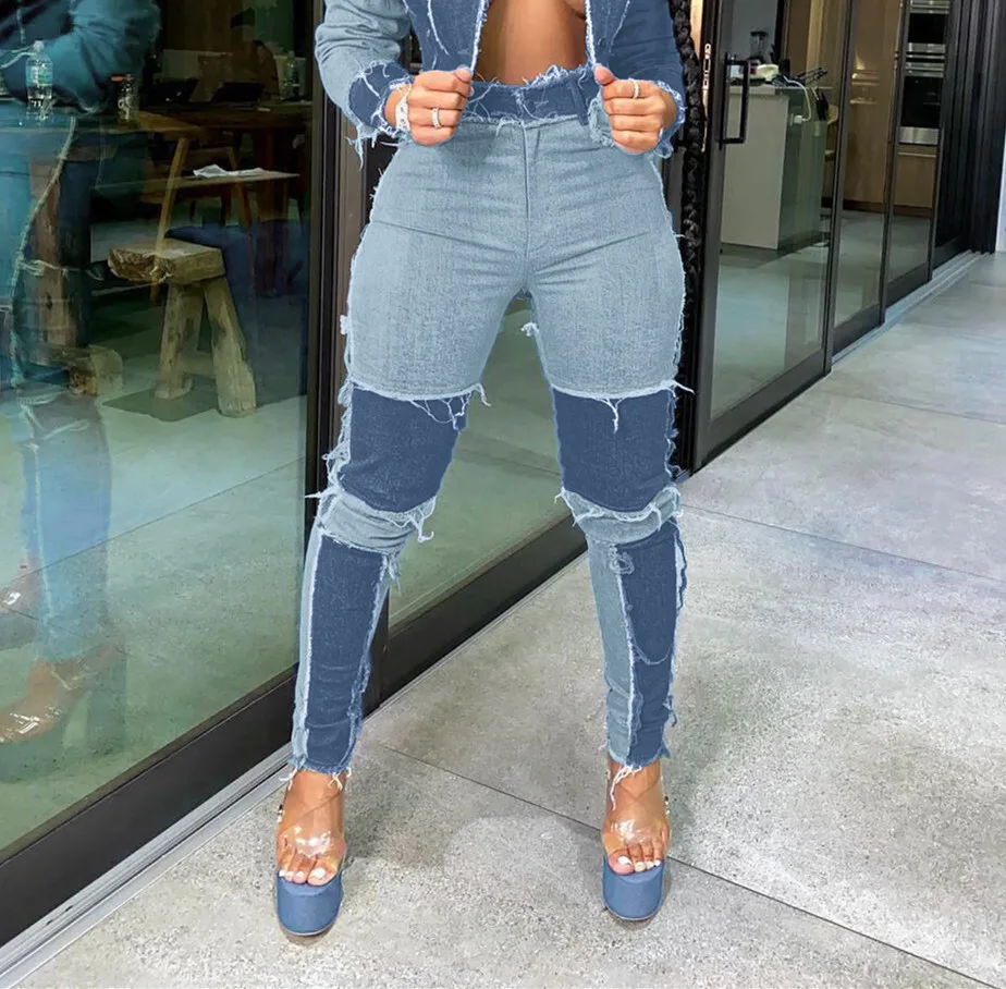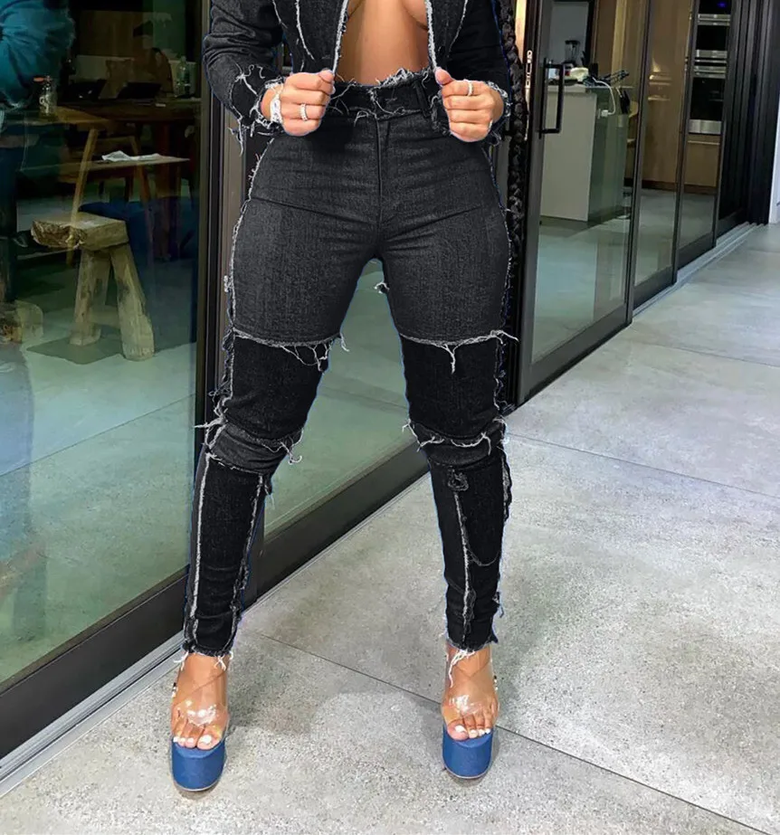 CM.YAYA Women Patchwork Denim Pants Retro Sexy Jeans Ripped Pencil Panelled Trousers Street Skinny High Waist Lady Jean Pants