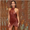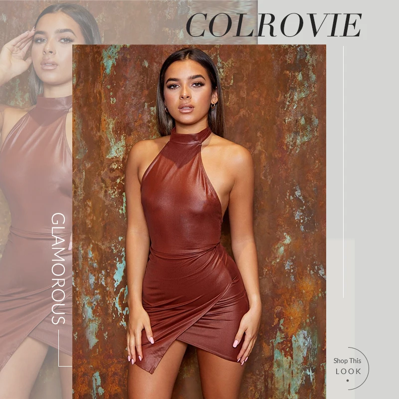 COLROVIE Rust Brown Asymmetrical Hem Open Back PU Leather Bodycon Dress Women Autumn Halter Glamorous Sexy Mini Pencil Dresses