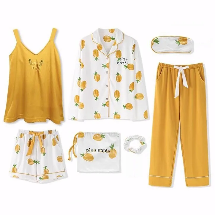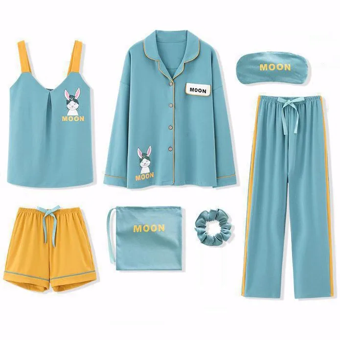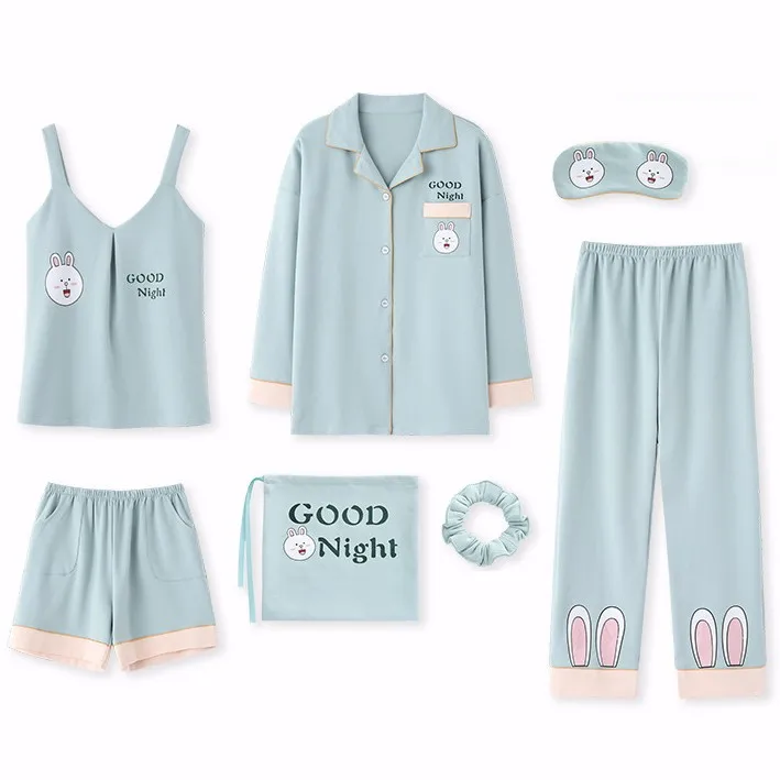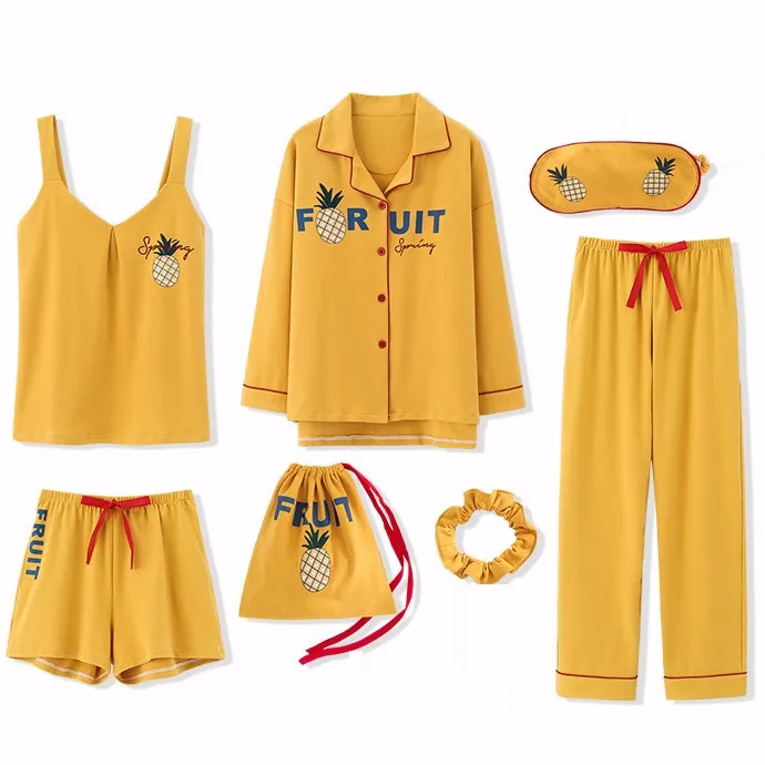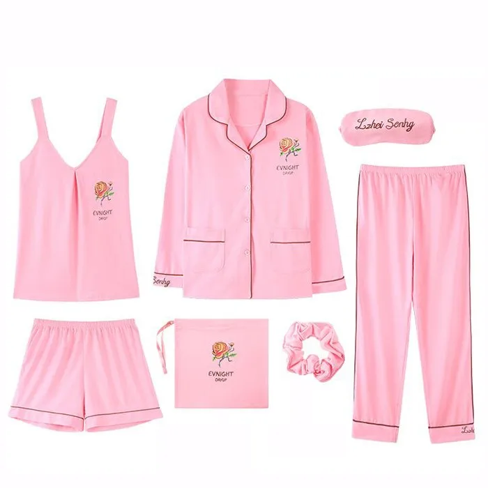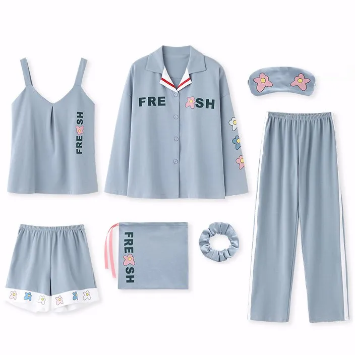Cotton Women Home Clothing 7PCS Pajamas Suit Nightwear Casual Intimate Lingerie Sleep Set Homewear Pyjamas Print Sleepwear