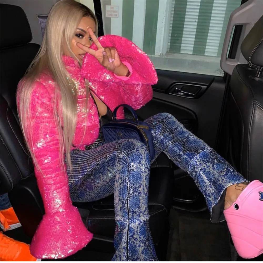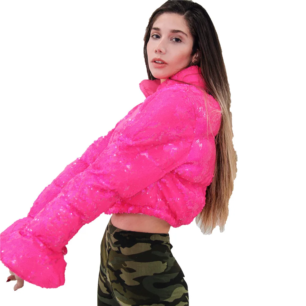 Cropped Puffer Jacket Pink Sequin Bell Sleeve Parka Bubble Coat Winter 2020 Fall Women XL XXL