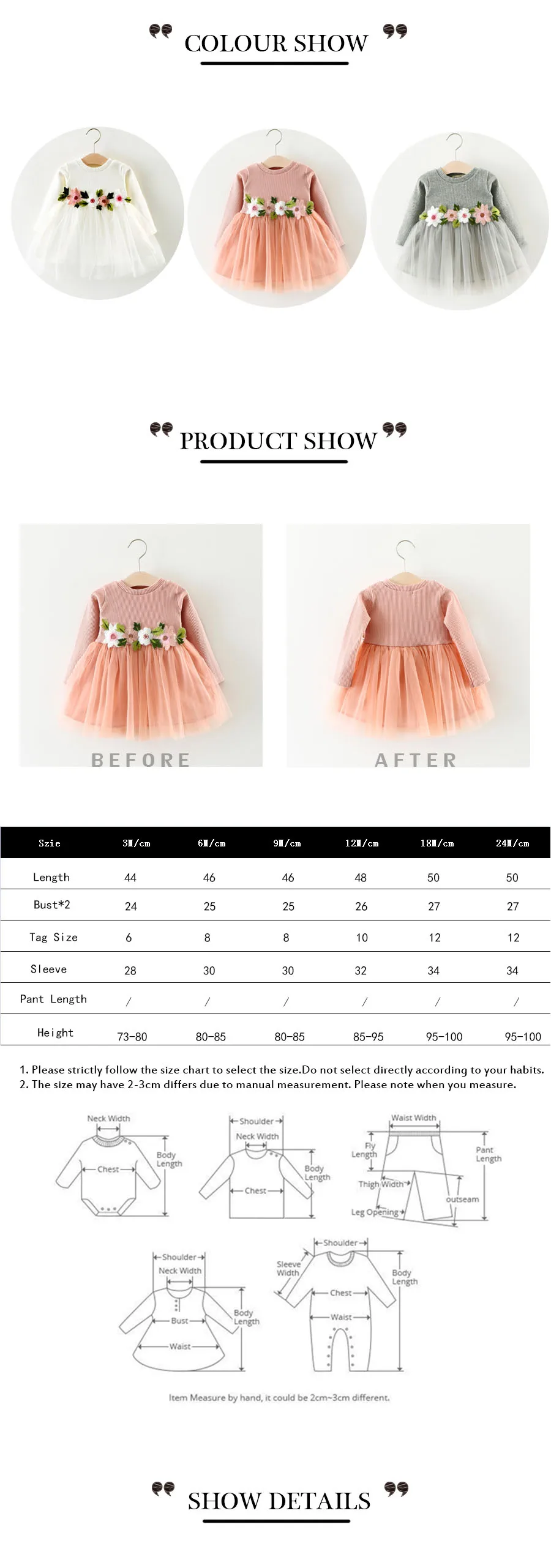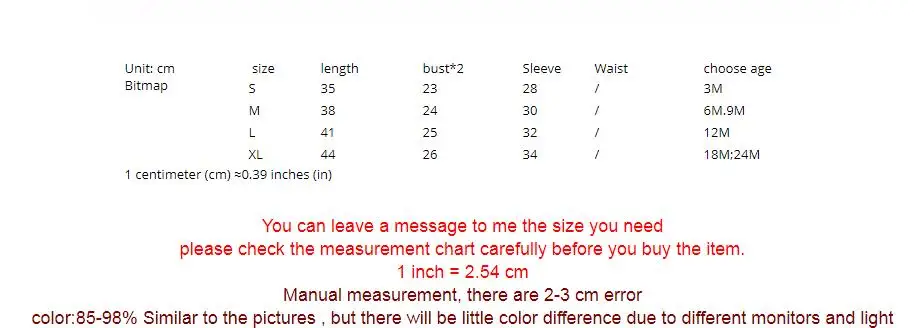 size dress bust*2 sleeve S=3M 6M 35cm 27cm 30cm M=9M 12M 37cm 28cm 32cm L =18M 38cm 28cm 33cm XL=24M 40cm 29cm 33cm You can leave a message to me the size you need please check the measurement chart carefully before you buy the item. 1 inch = 2.54 cm…