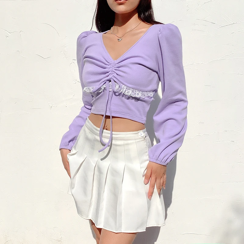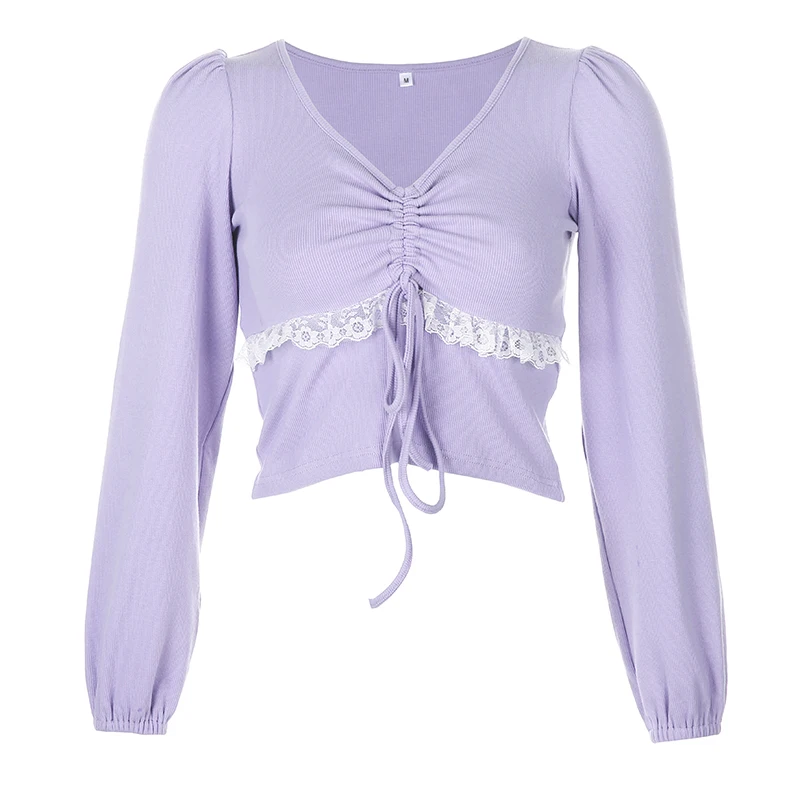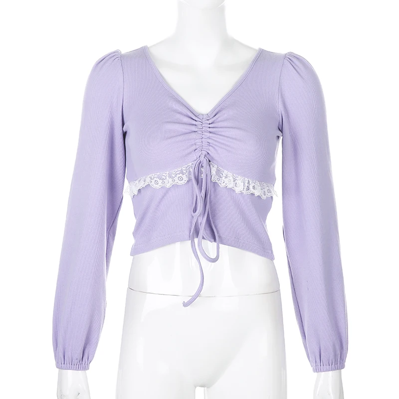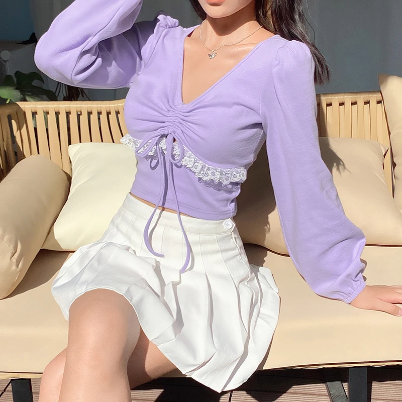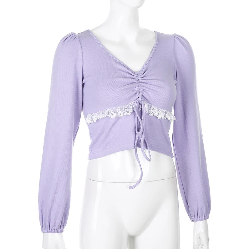 Darlingaga V Neck Lace Patchwork Autumn Woman Tshirts Cropped Y2K Top Puff Sleeve Drawstring Fashion Ruched T shirt Slim Tee New