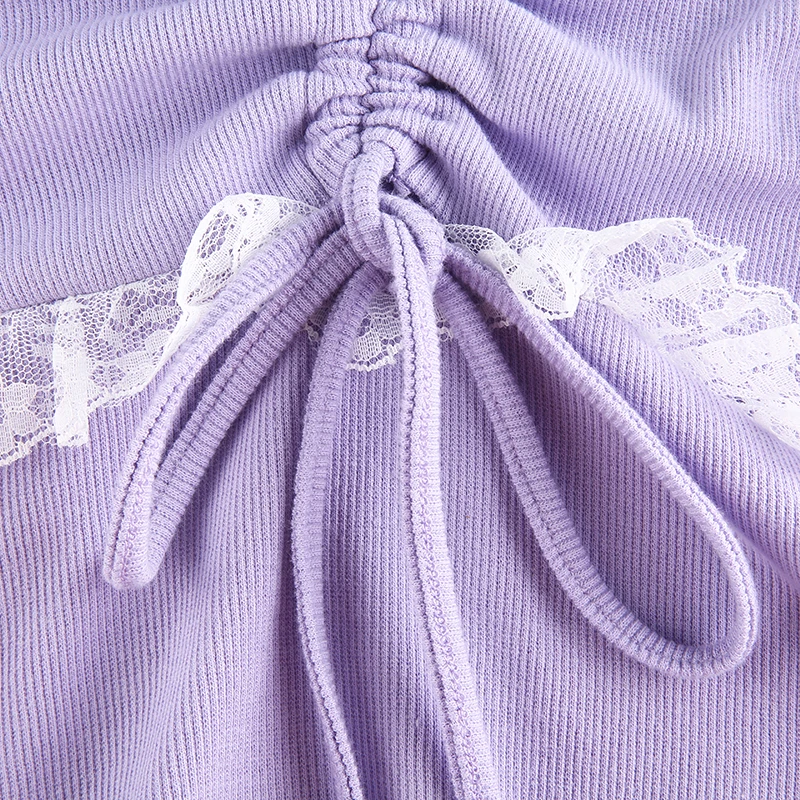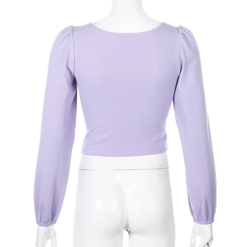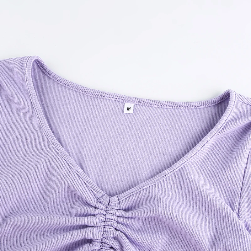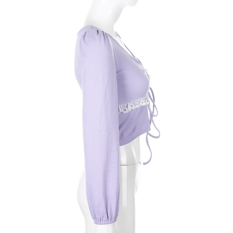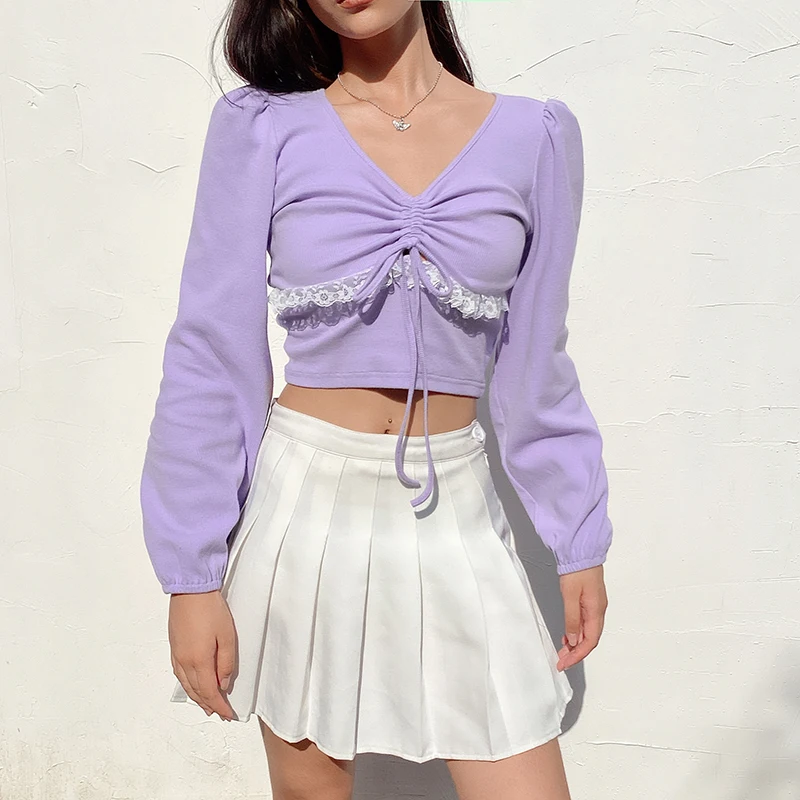 Darlingaga V Neck Lace Patchwork Autumn Woman Tshirts Cropped Y2K Top Puff Sleeve Drawstring Fashion Ruched T shirt Slim Tee New