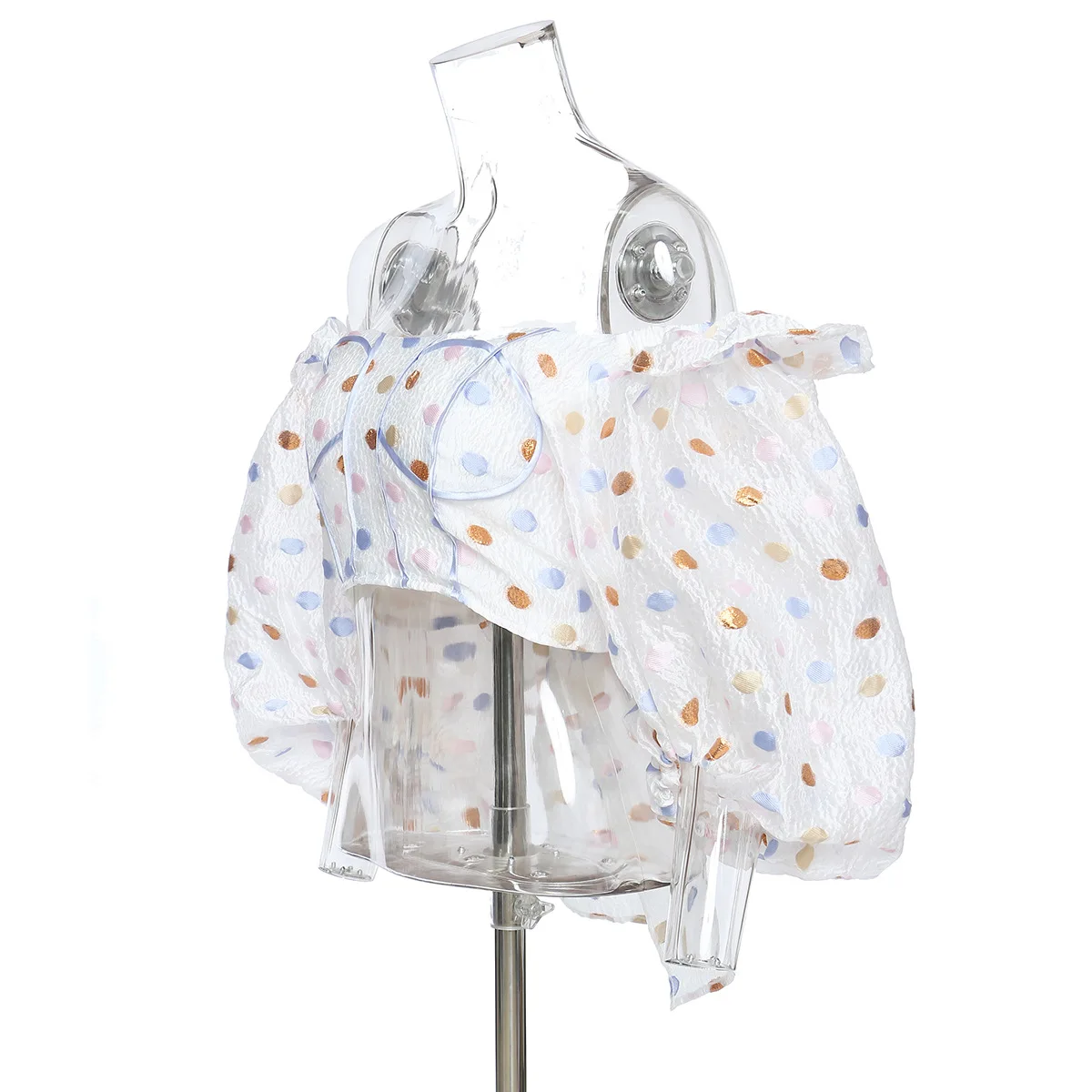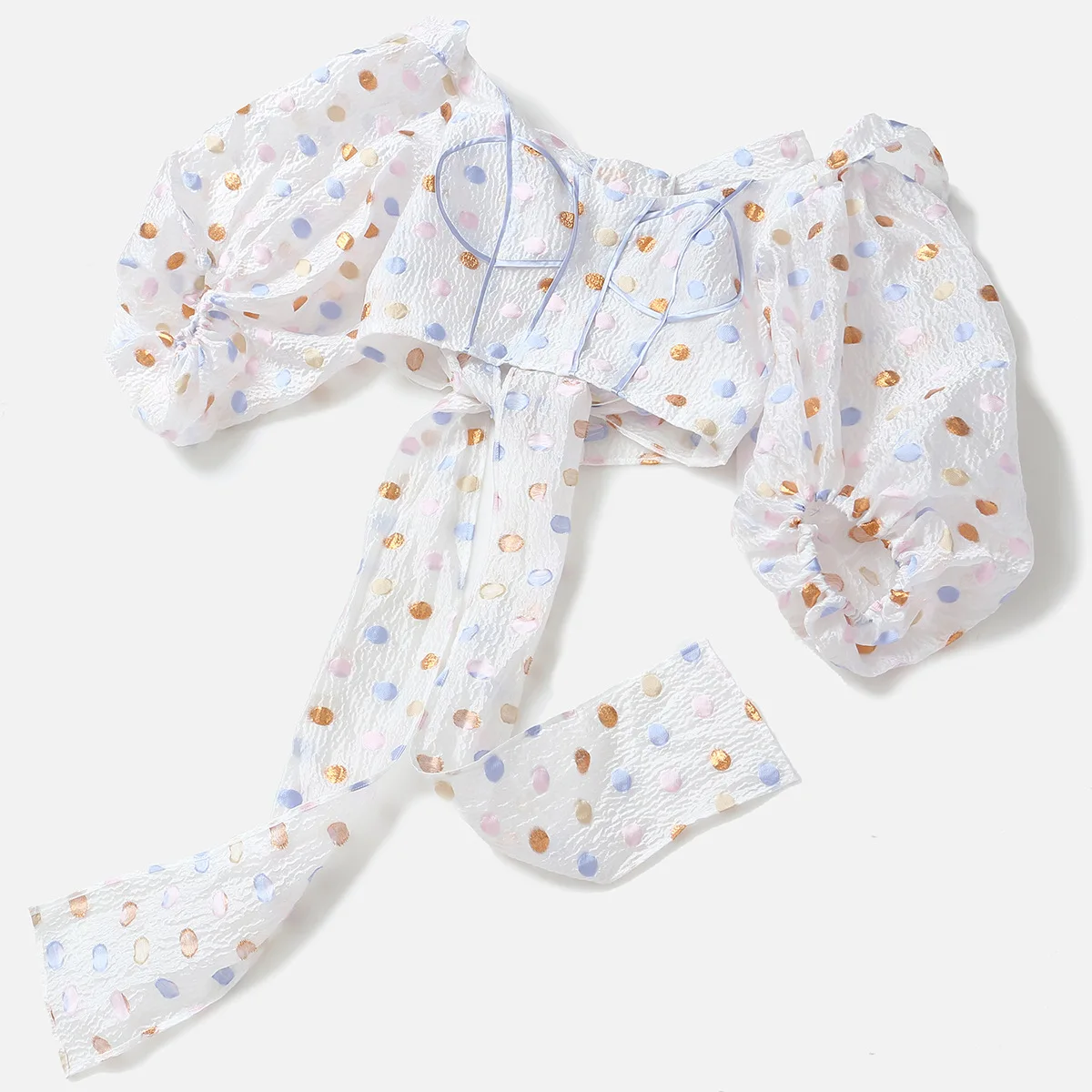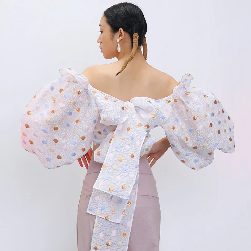 DEAT 2021 new spring and summer puff sleeves polka dots printed short high waist dobby fabric straps bow shirt WM29100L