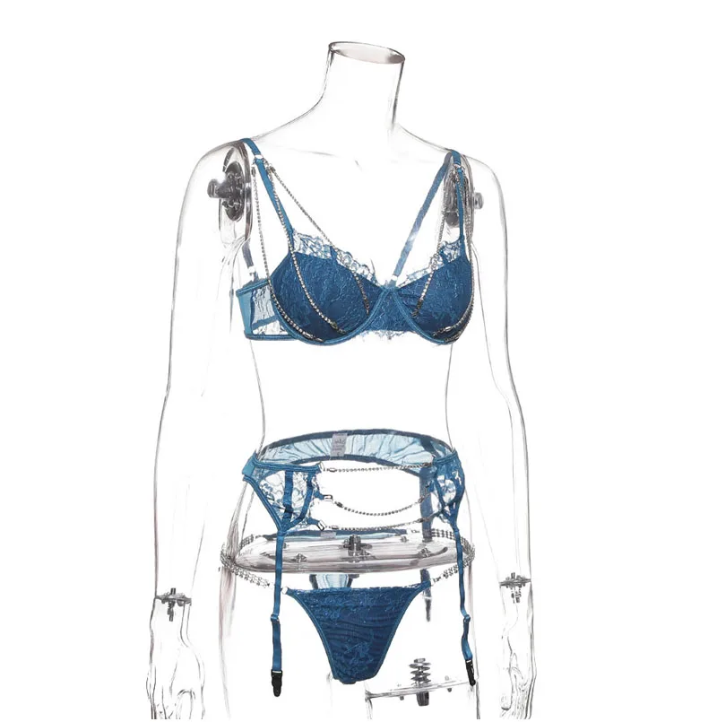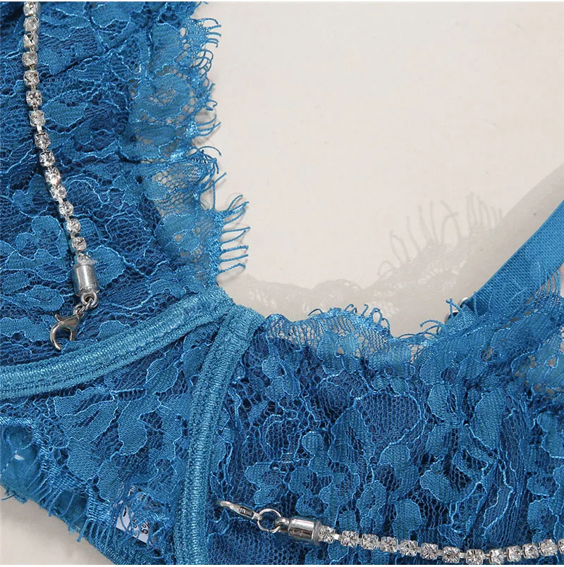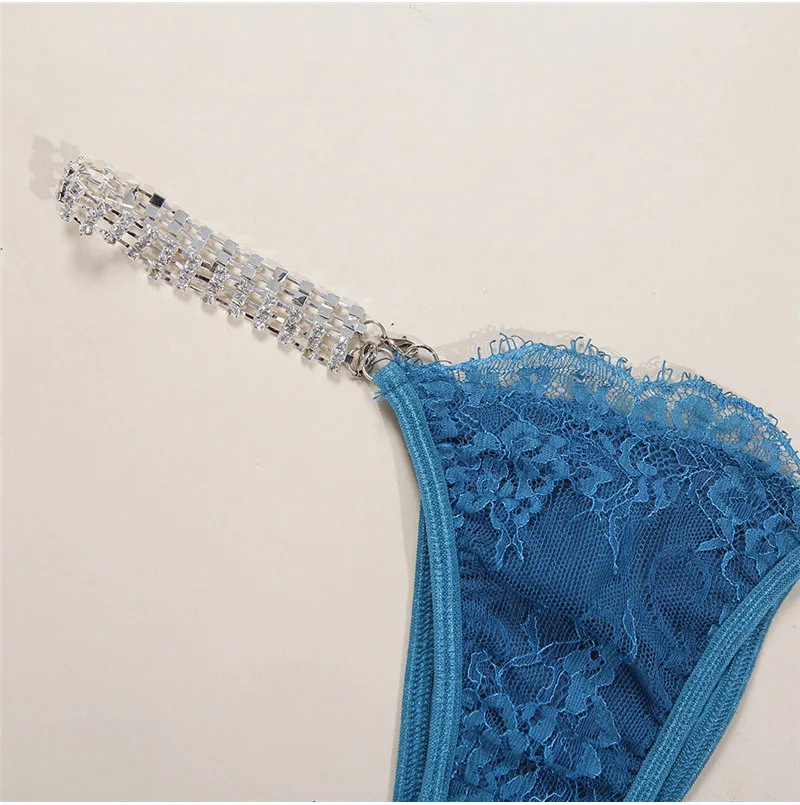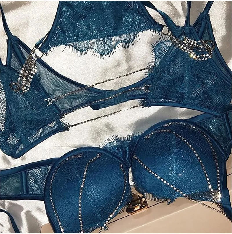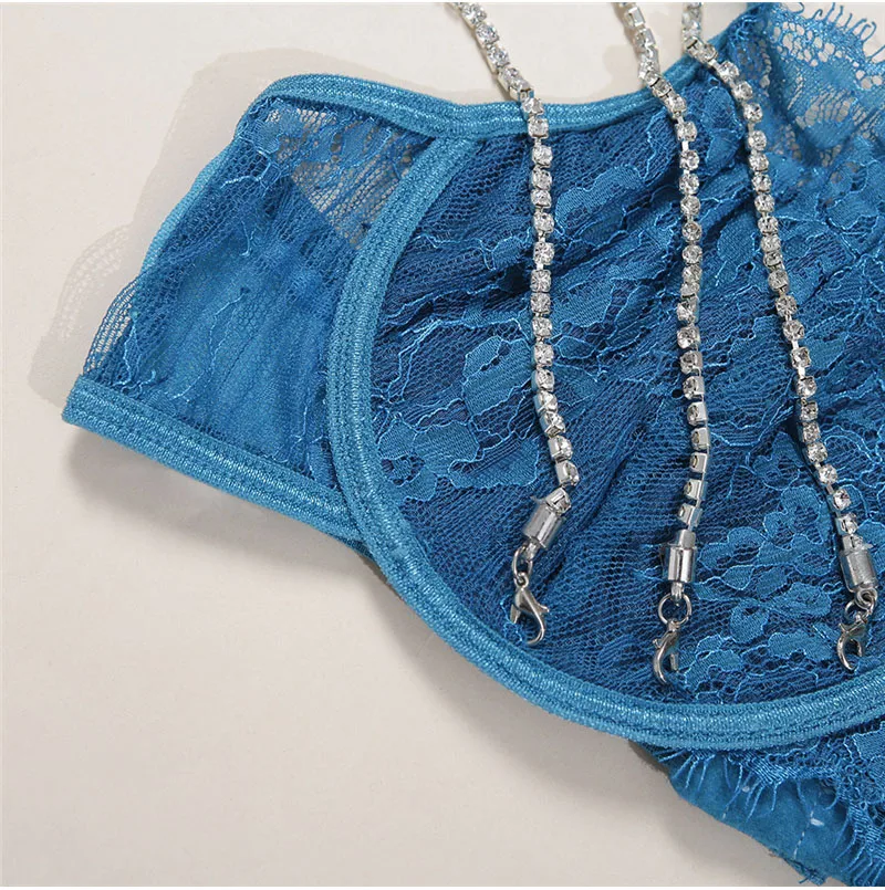 Diamonds Sexy Lingerie Lace Sets Women Ladies Underwear Sleepwear Sets Crystal Chain Bra G-string Babydoll