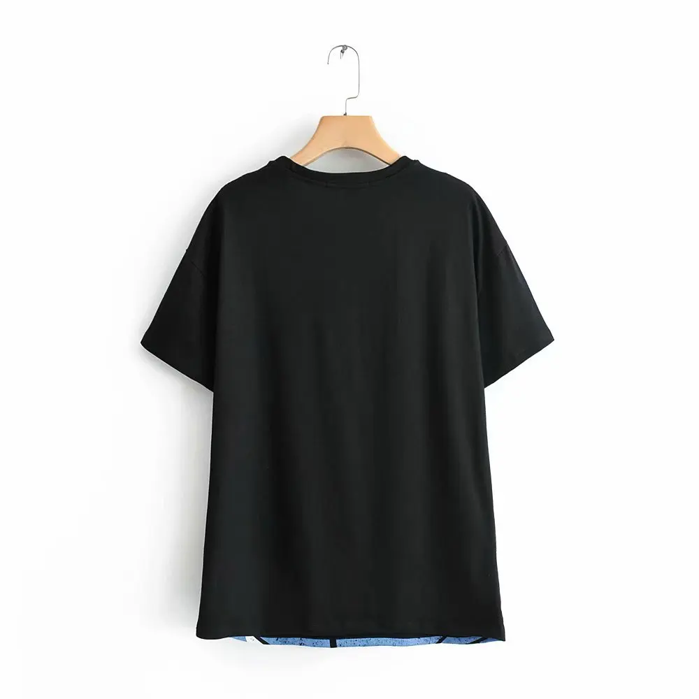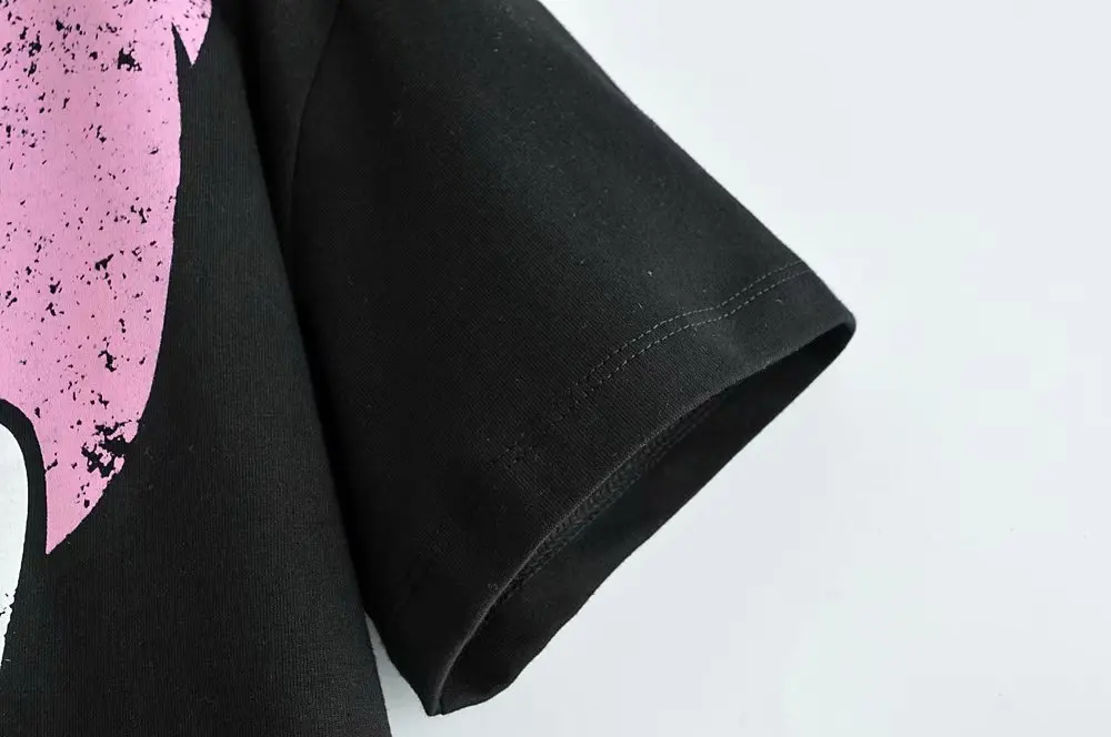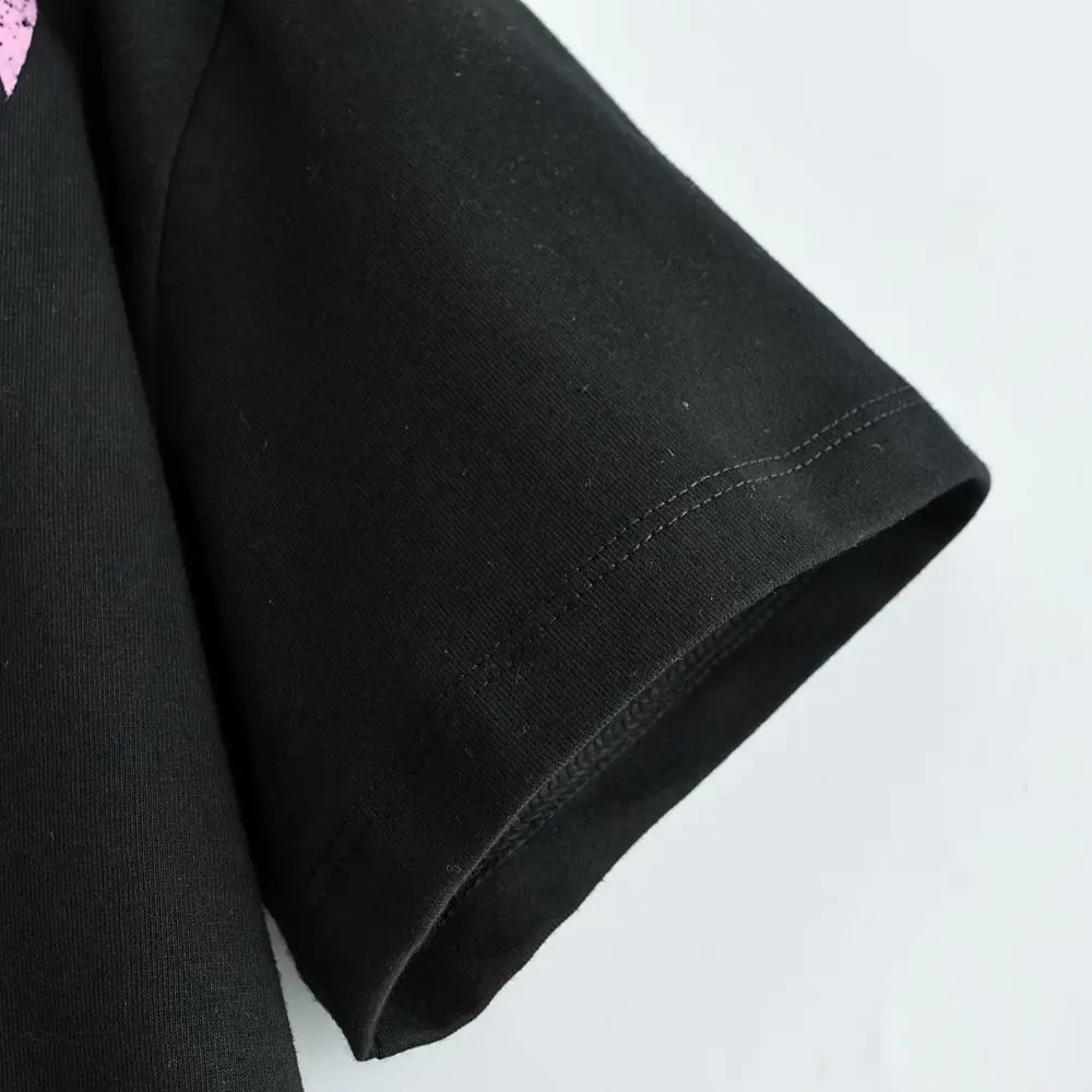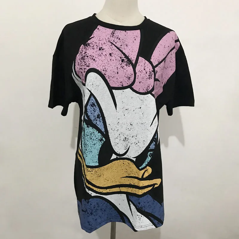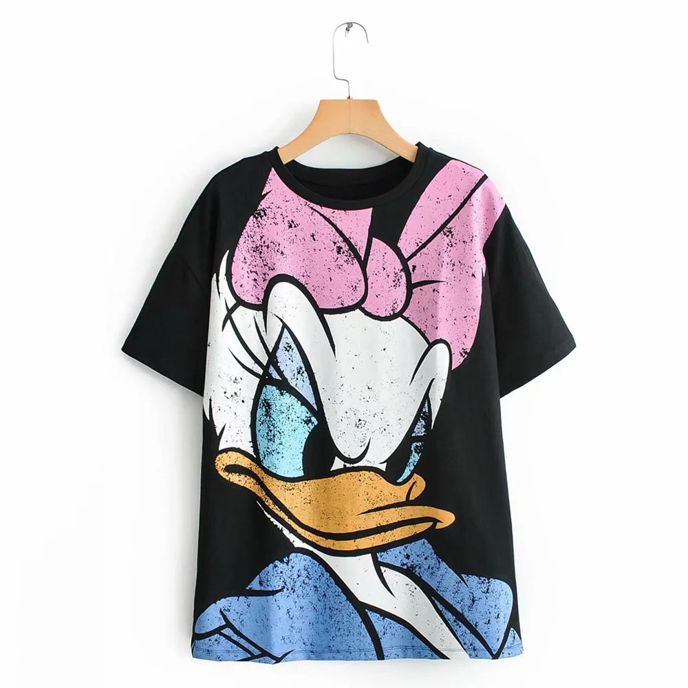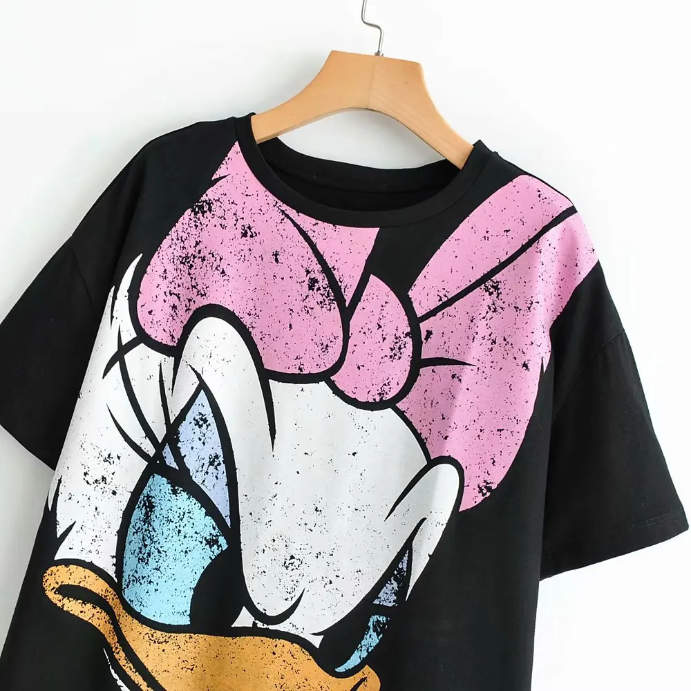 Disney Fashion Cute Daisy Duck Cartoon Print Black T-Shirt O-Neck Pullover Short Sleeve Casual Sweet Women Loose Tee Tops
