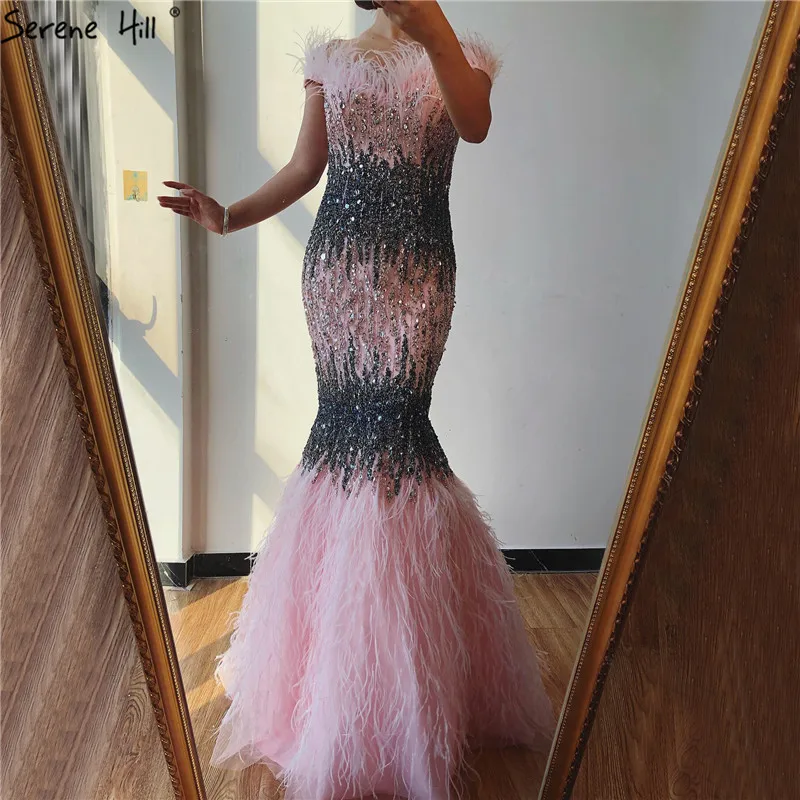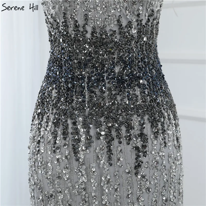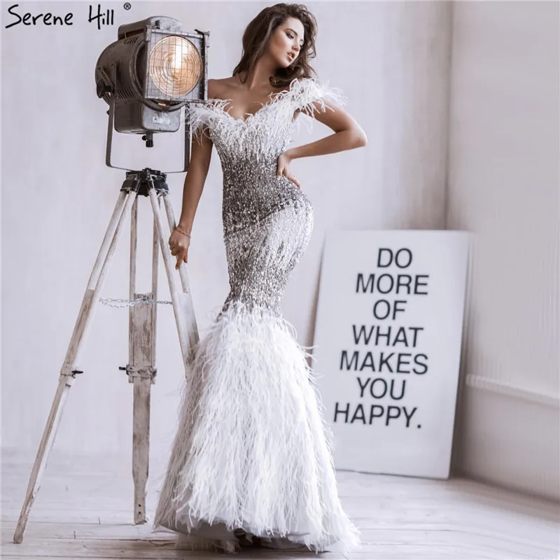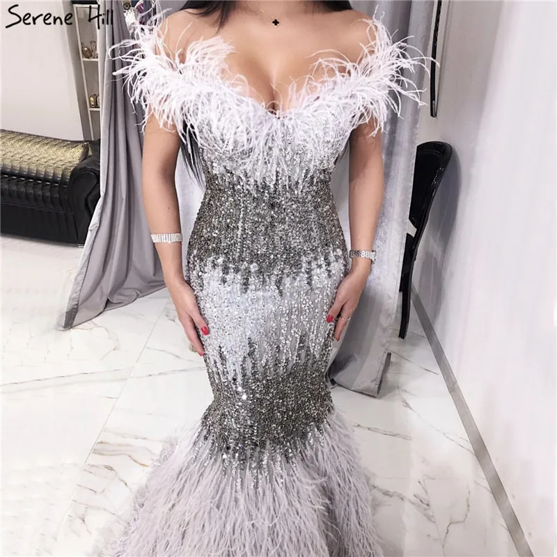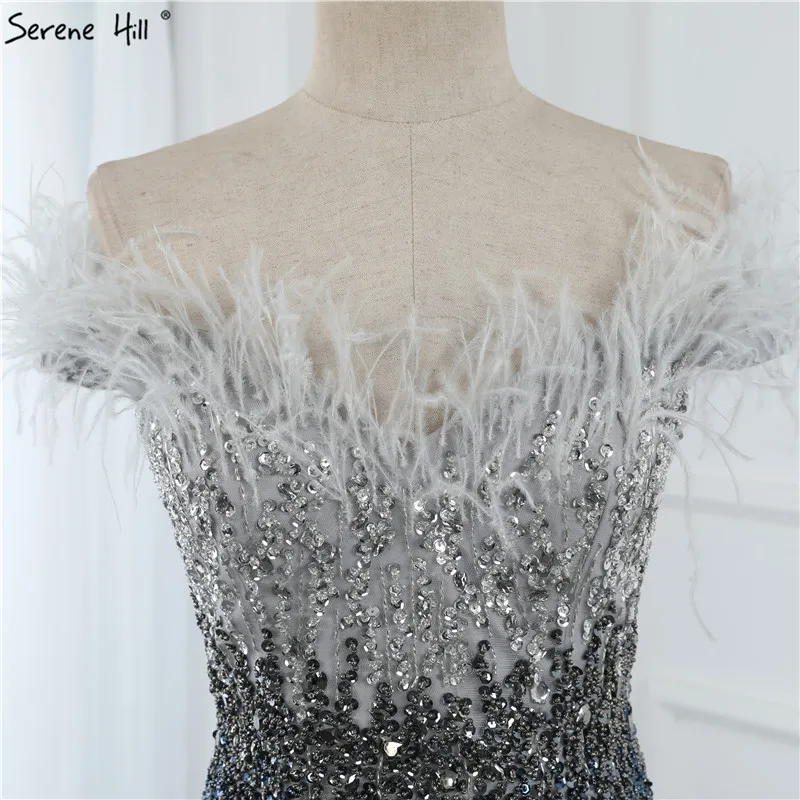 Dubai Design Grey Luxury Sexy Evening Dresses Crystal Feathers Off Shoulder Formal Dress 2020 Serene Hill LA70242