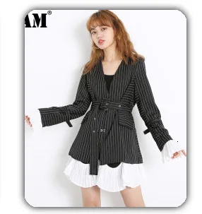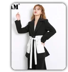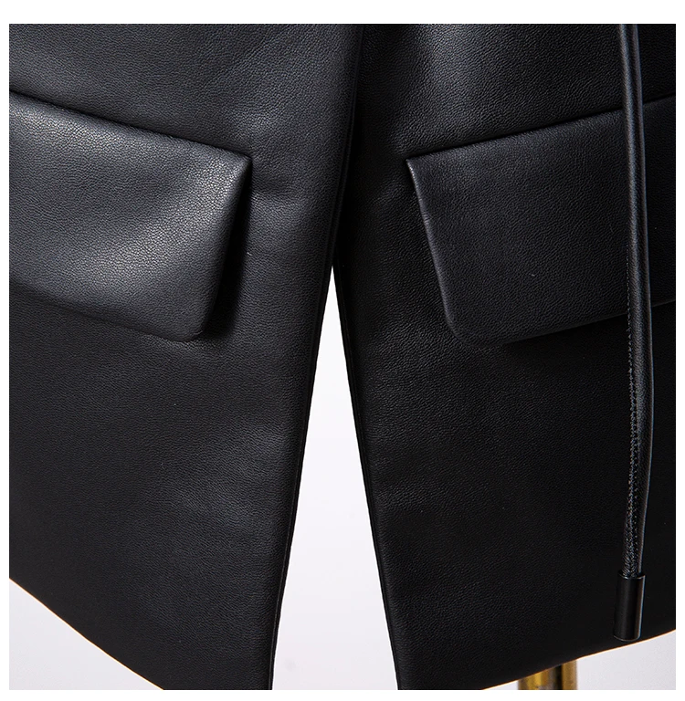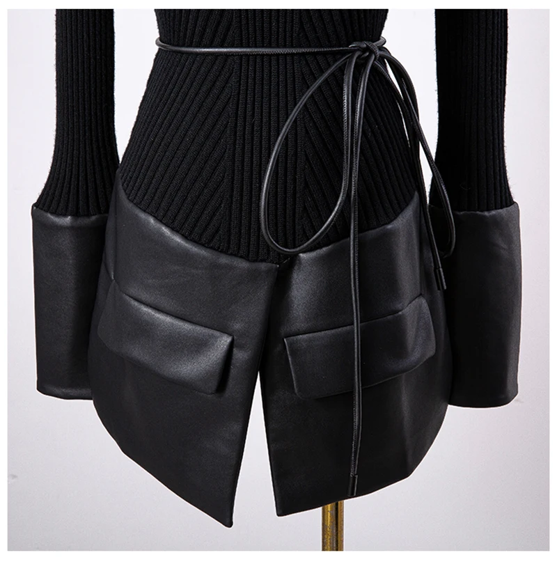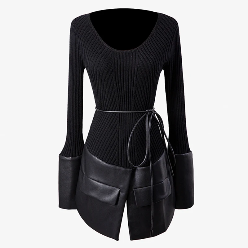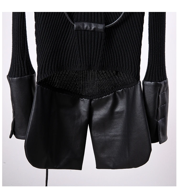 [EAM] Spliced PU Leather Knitting Sweater Loose Round Neck Long Sleeve Women Pullovers New Fashion Autumn Winter 2021 1DD2424
