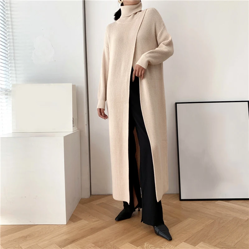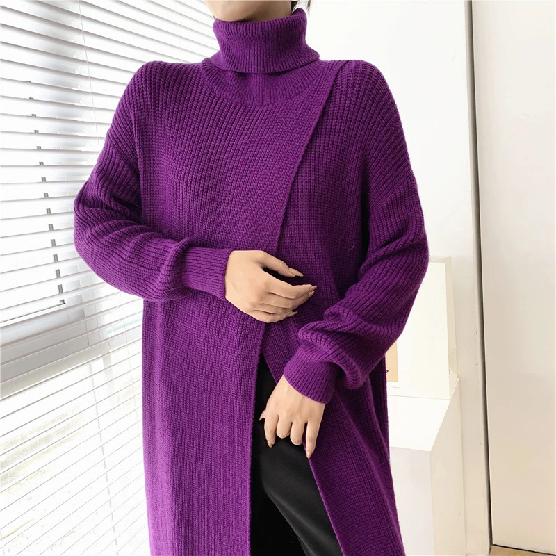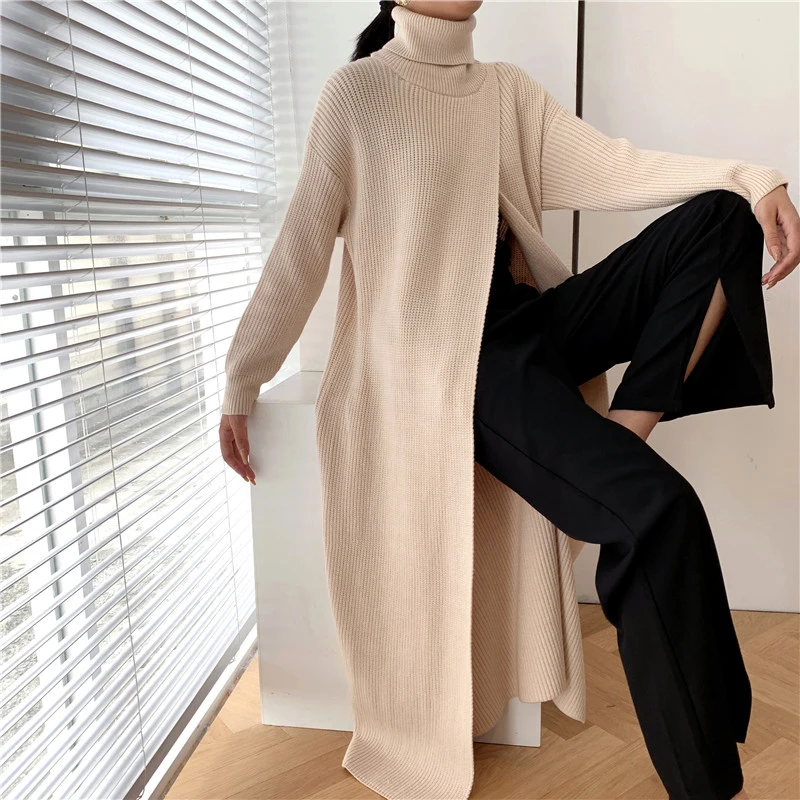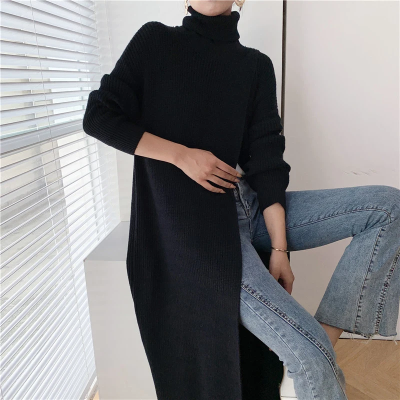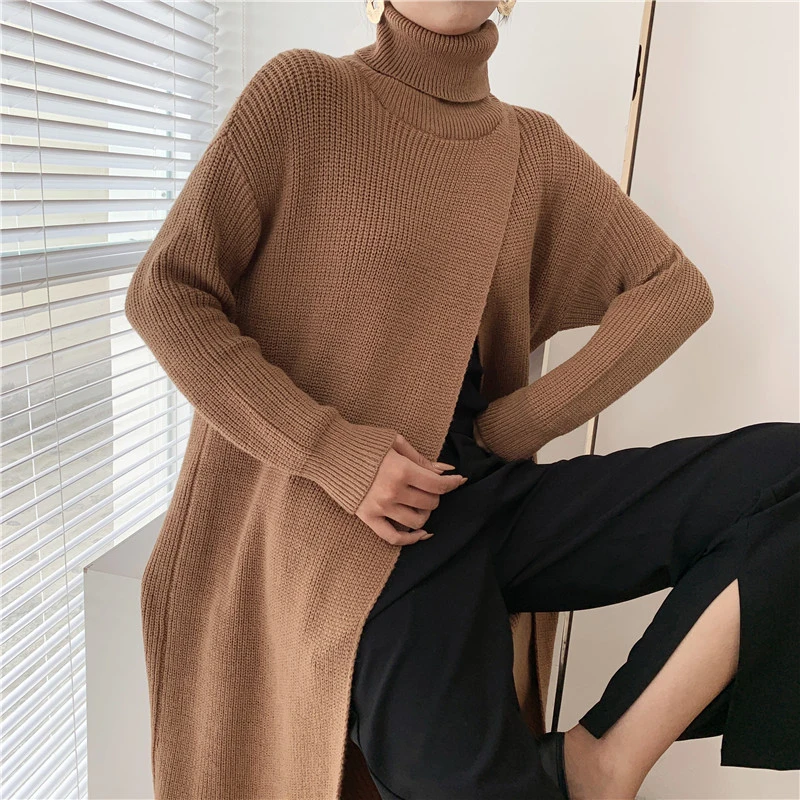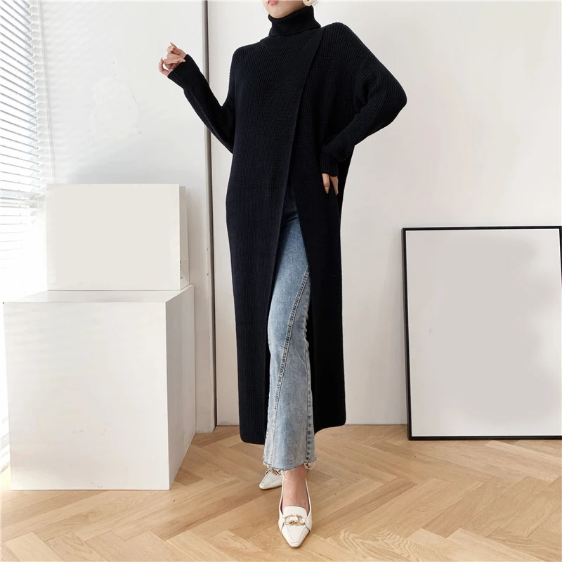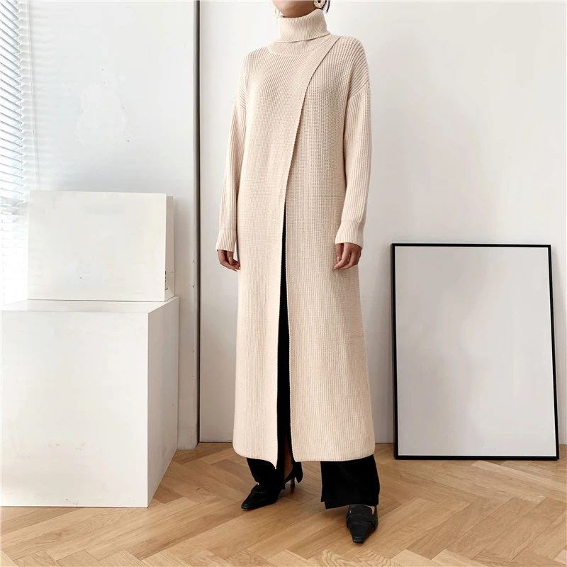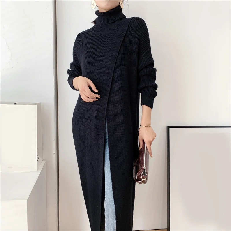 [EAM] Vent Long Knitting Sweater Loose Fit Turtleneck Long Sleeve Women Pullovers New Fashion Tide Autumn Winter 2021 1DA357