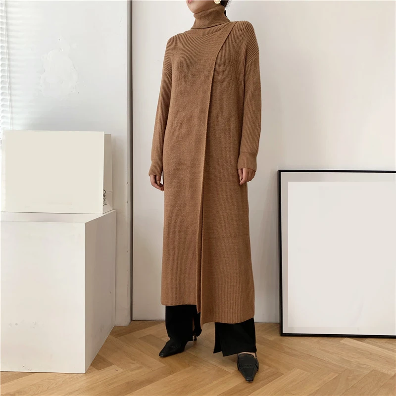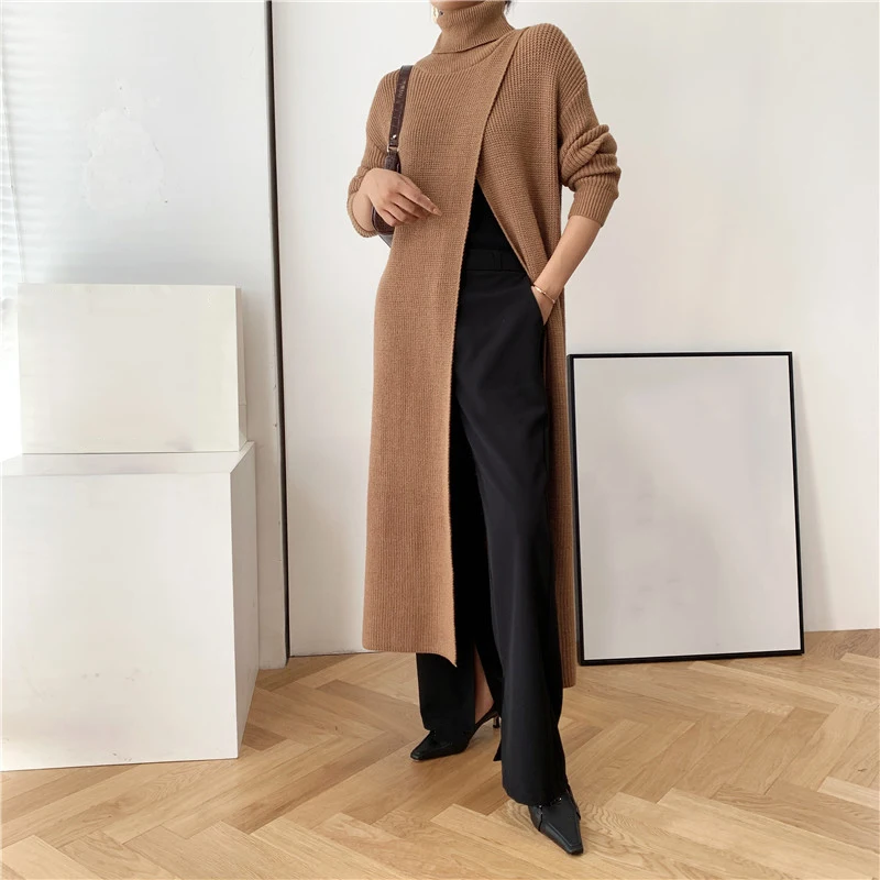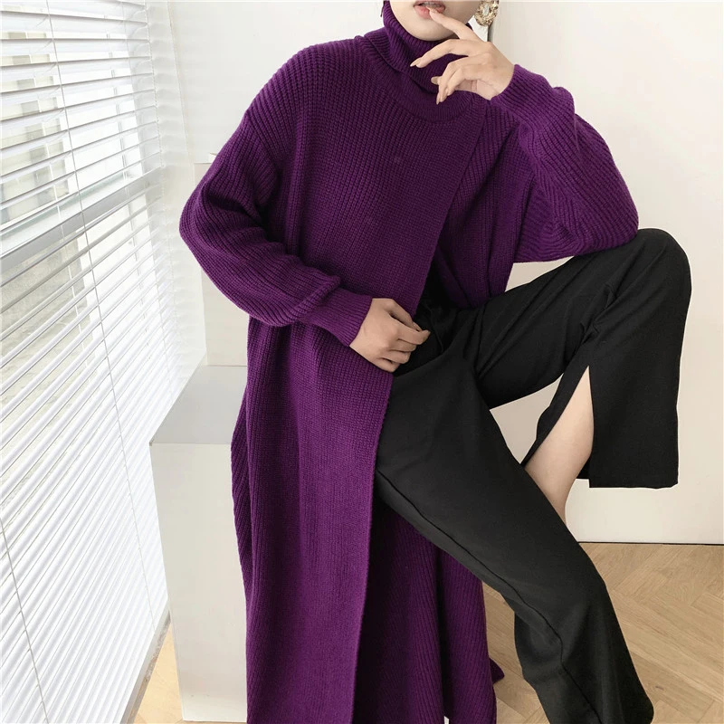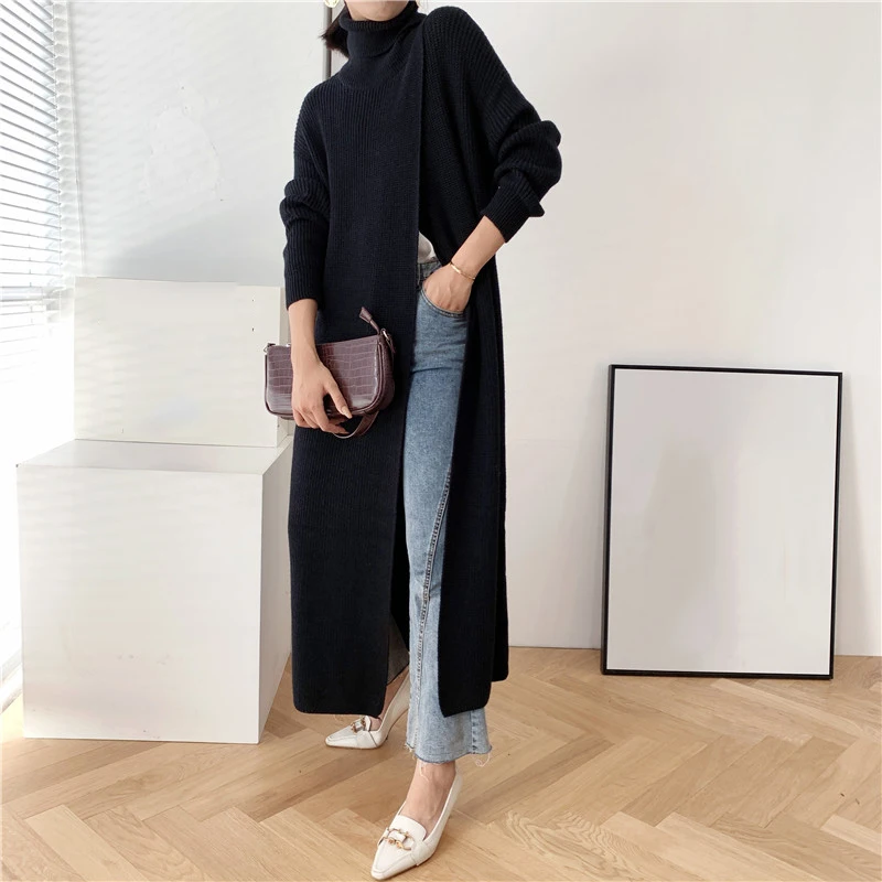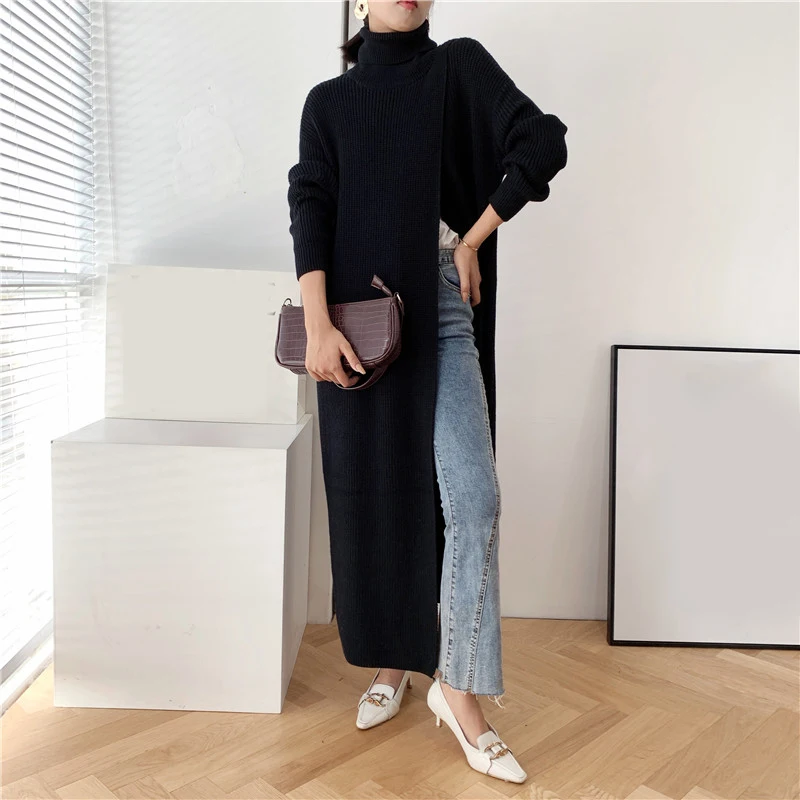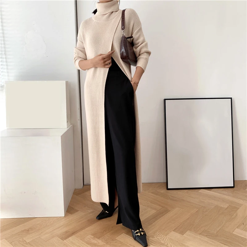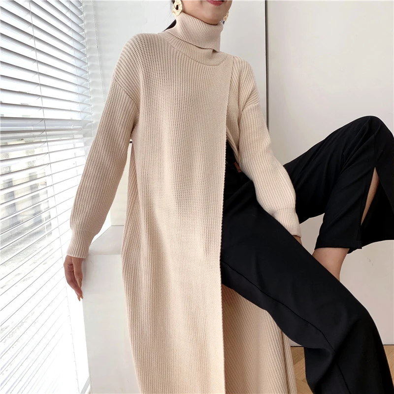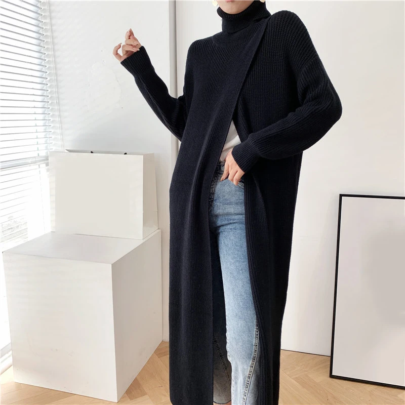 [EAM] Vent Long Knitting Sweater Loose Fit Turtleneck Long Sleeve Women Pullovers New Fashion Tide Autumn Winter 2021 1DA357
