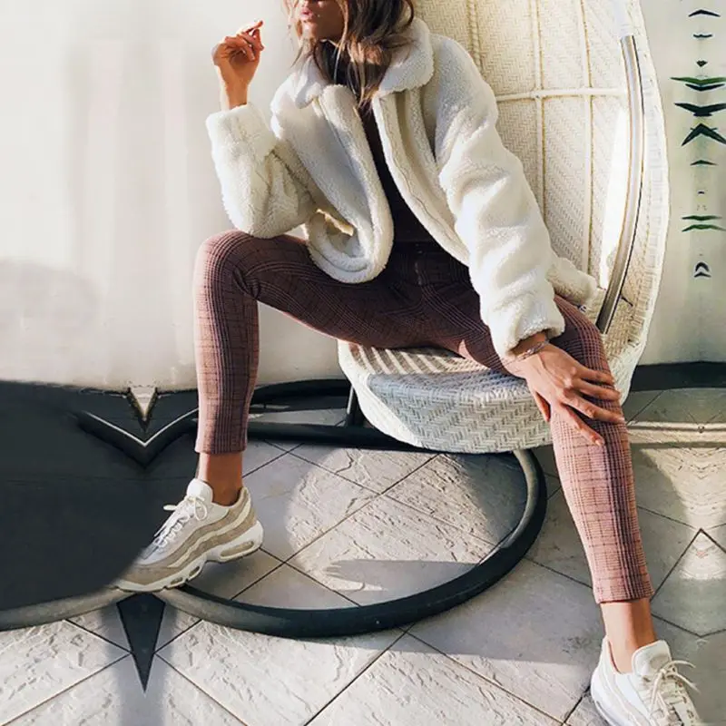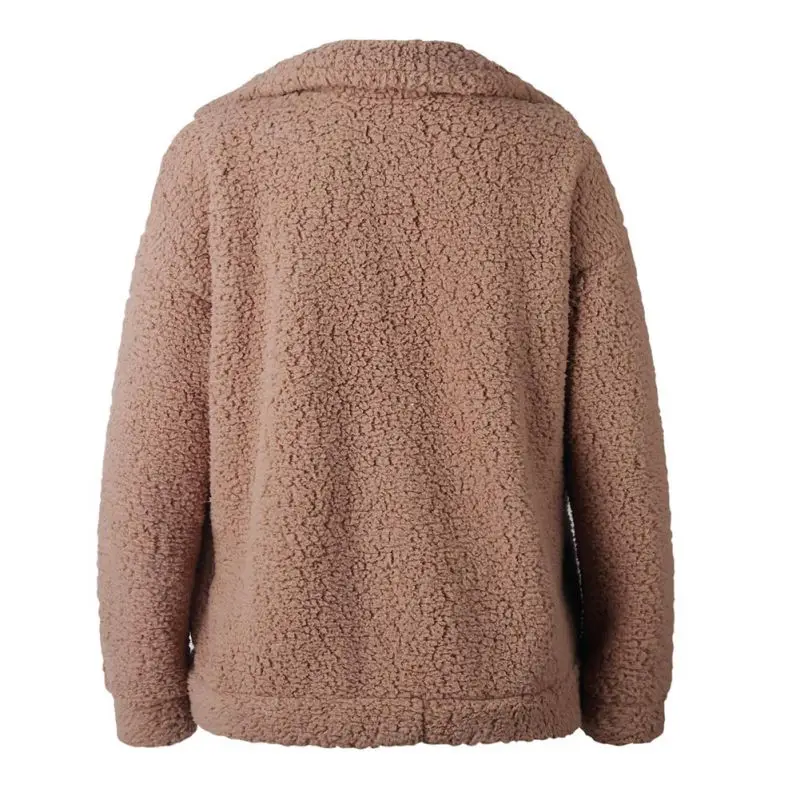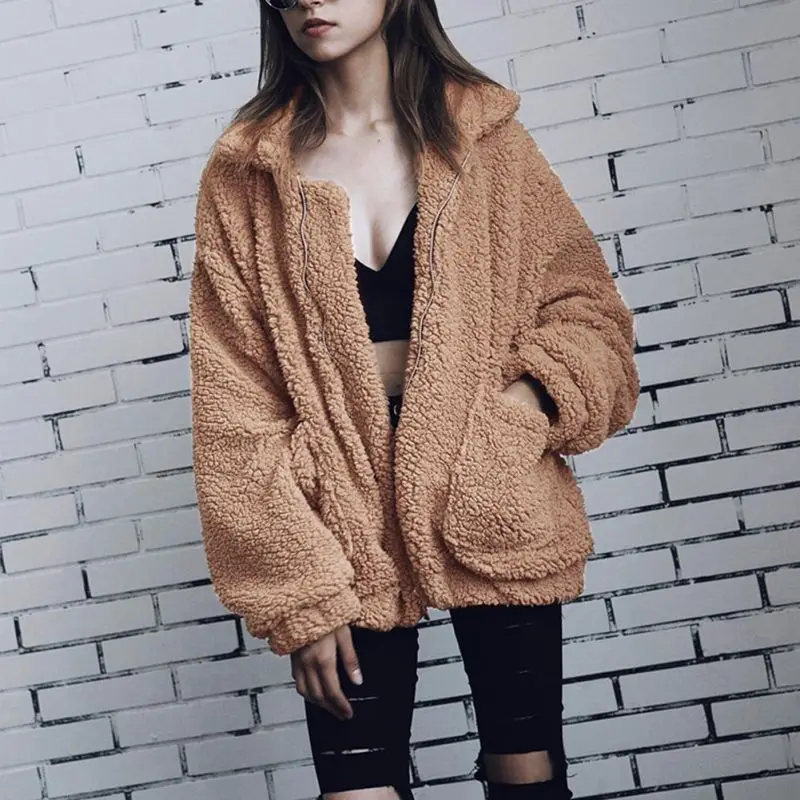 3.Stylish cute lapel coat, open front with zipper fly, two side pockets, soft plush overcoat