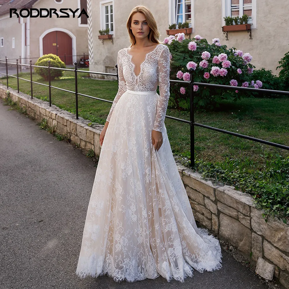 Elegant Full Lace Champagne Wedding Dresses 2020 Sexy V-neck illusion Long Sleeve Boho Beach Bridal Gown Sweep Train Marriage