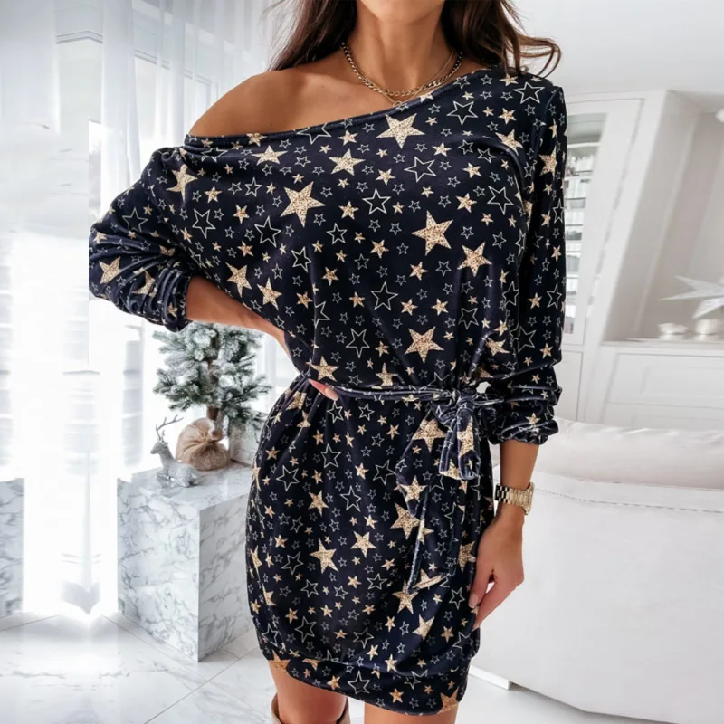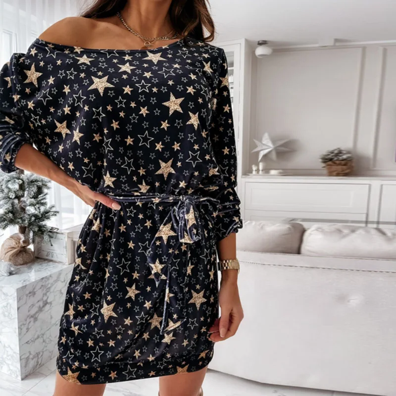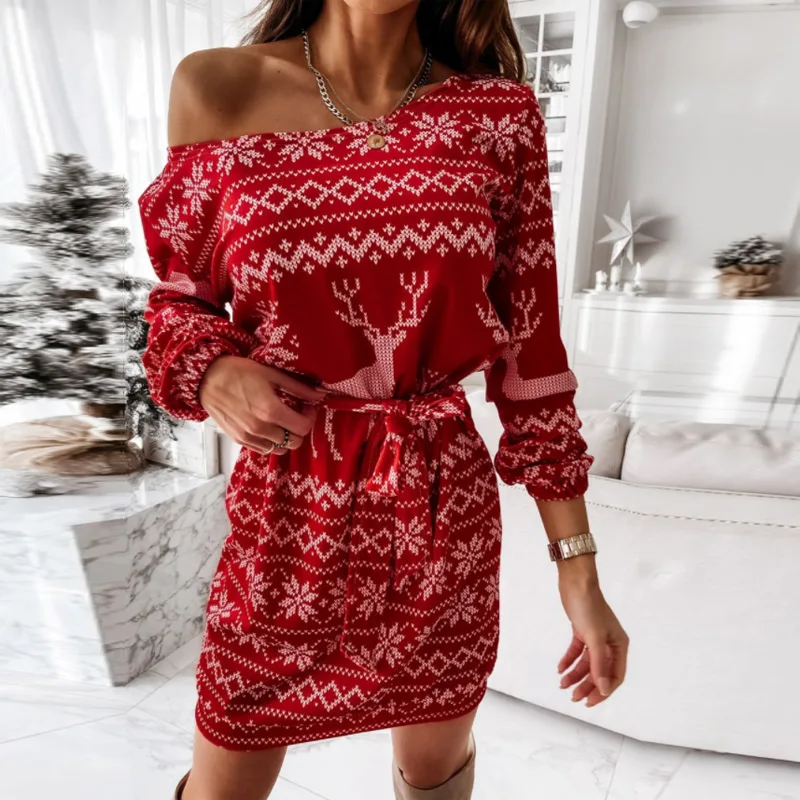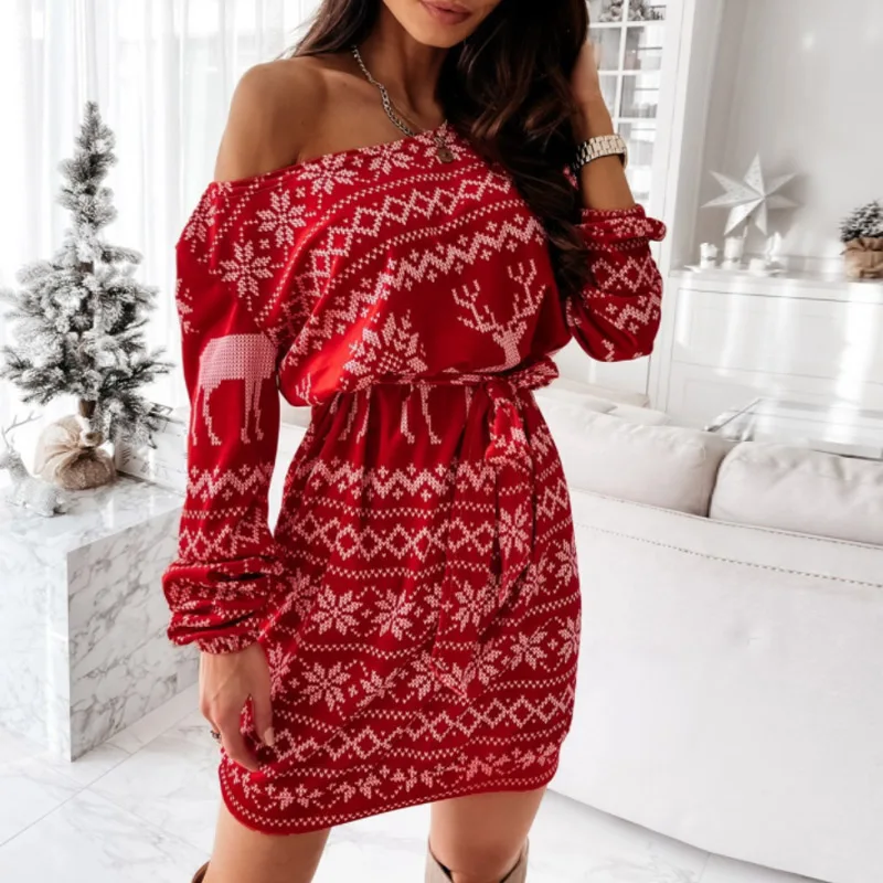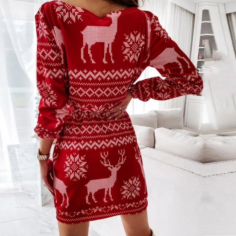 Elegant Puff Sleeve O Neck Mini Dresses Women Spring Fashion Christmas Snowflake Printed Dress Ladies Slim Bodycon Party vestido