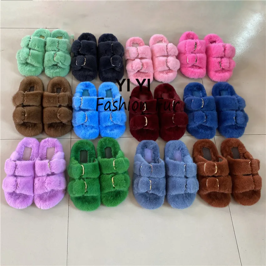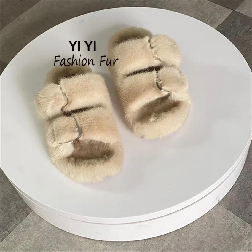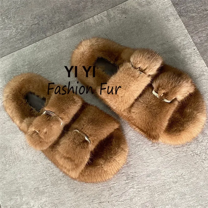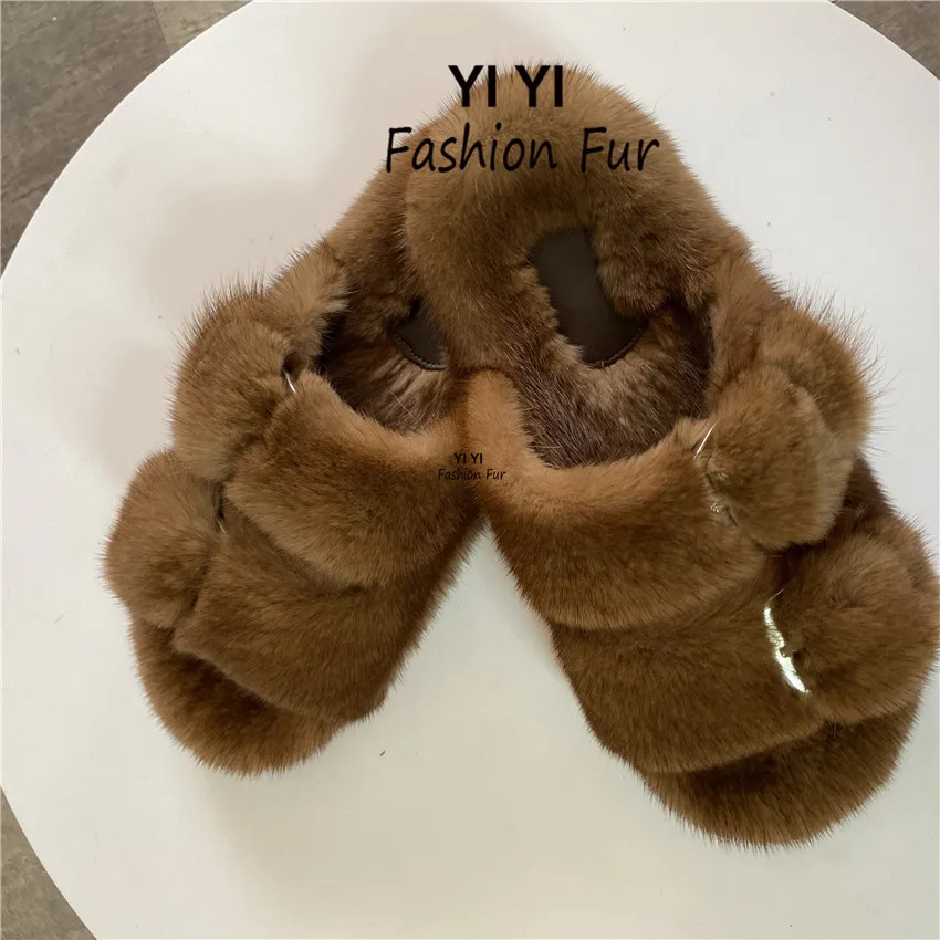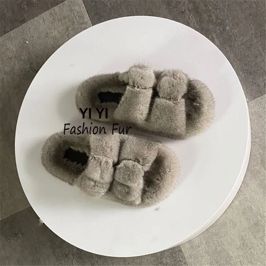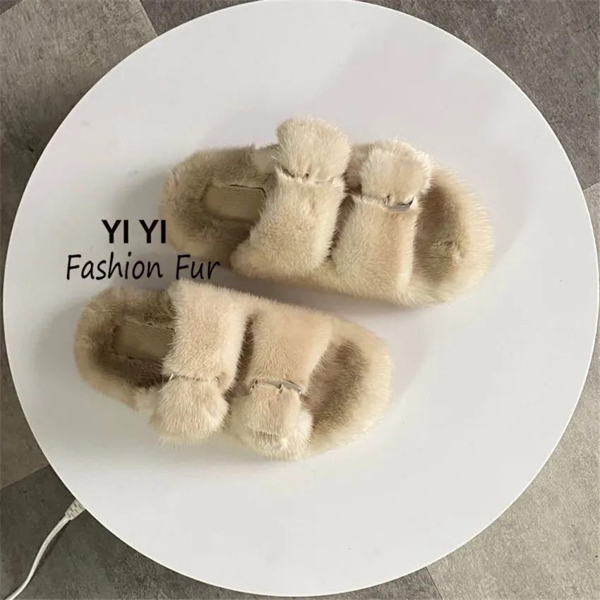 European Station Luxury Fashion Fur Slippers High Quality Mink Fur Slippers Ladies 100% Mink Fur Slippers Flat Heel Slippers