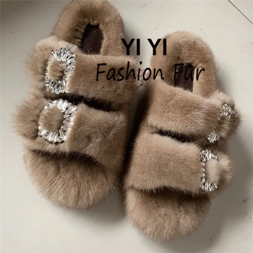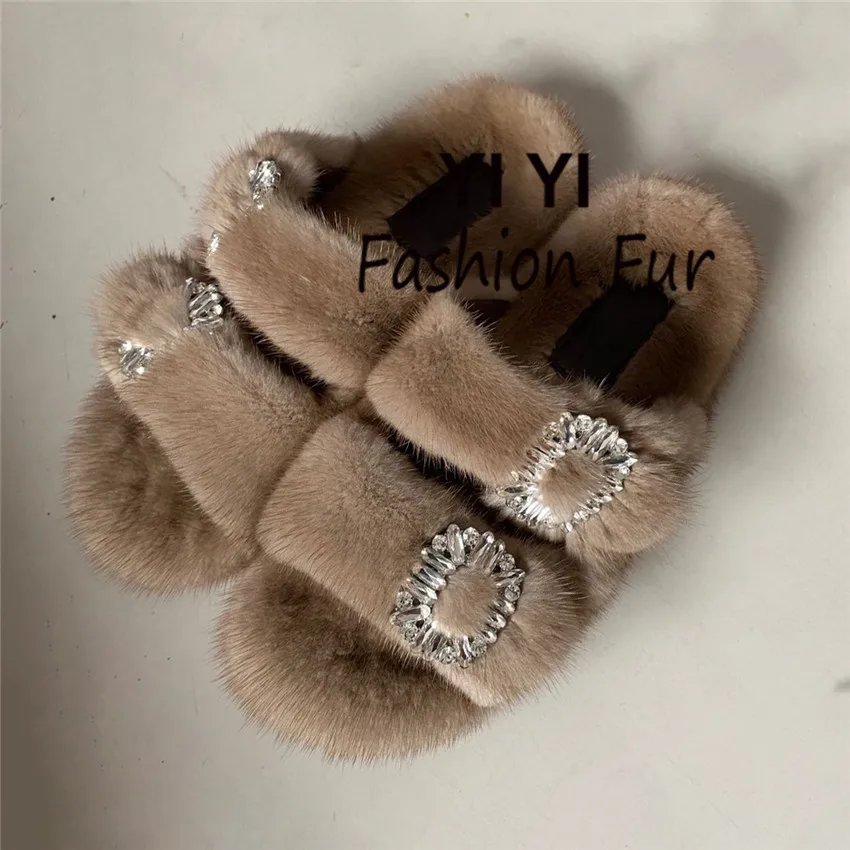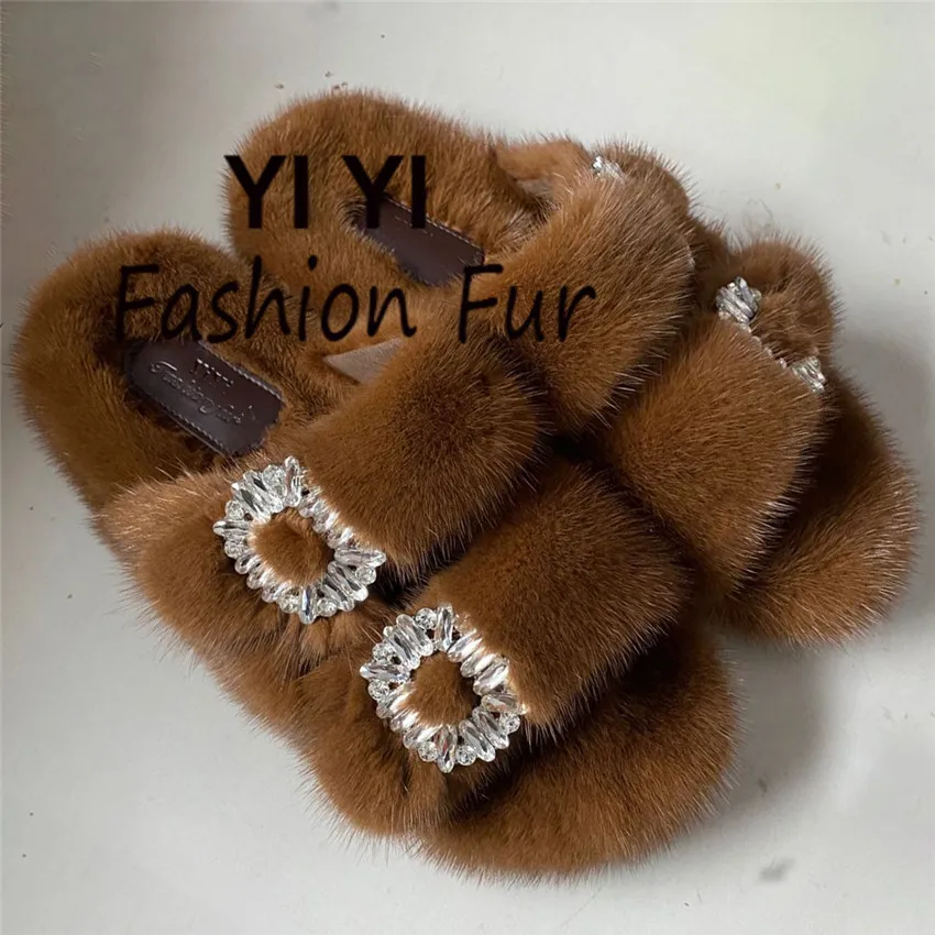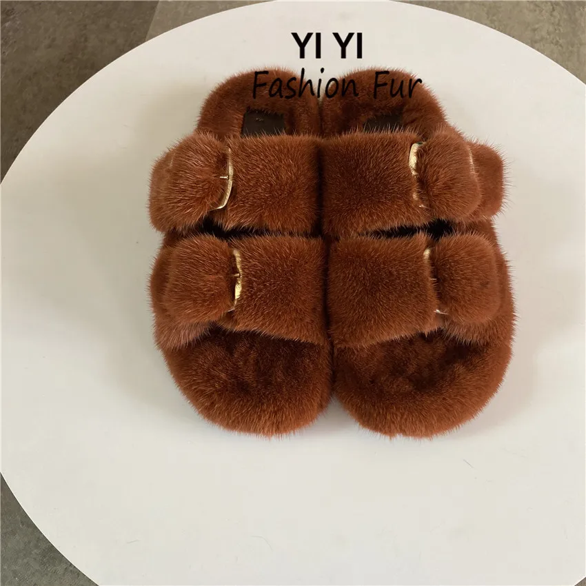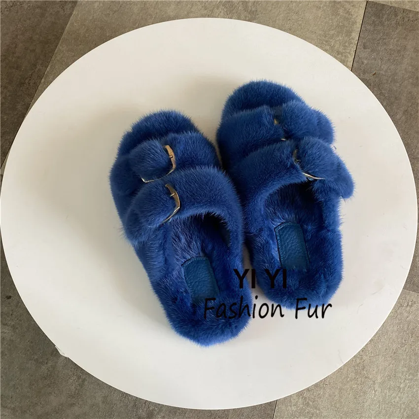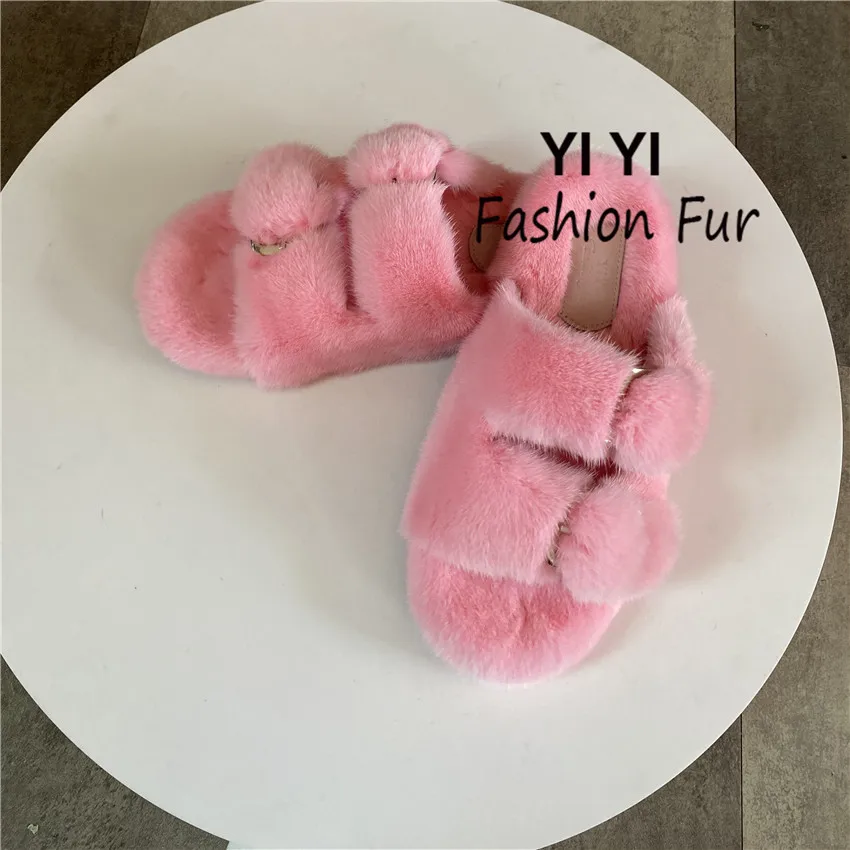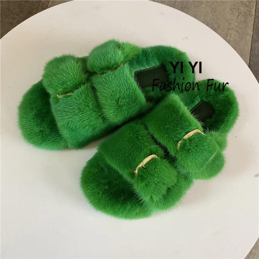 European Station Luxury Fashion Fur Slippers High Quality Mink Fur Slippers Ladies 100% Mink Fur Slippers Flat Heel Slippers