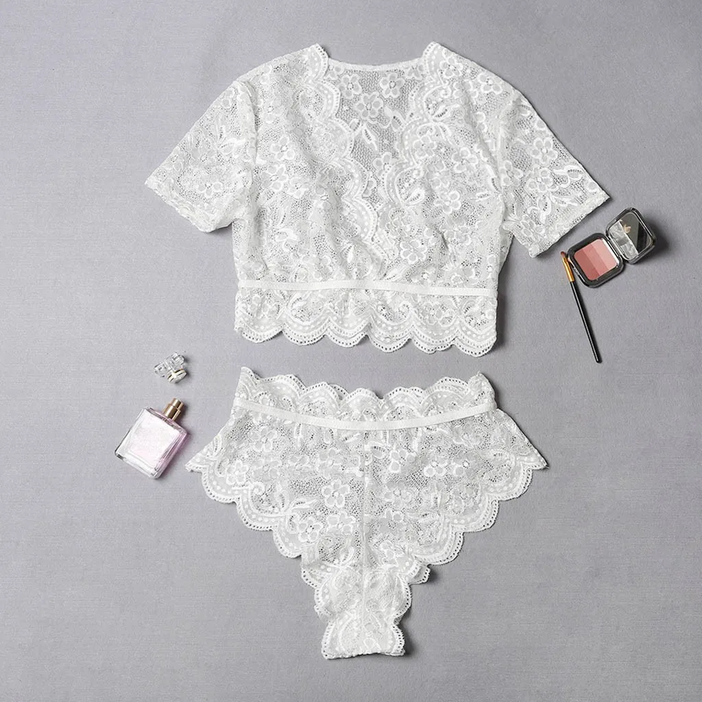 Women Sexy Lace Underwear V-neck Bra Thong Short Sleeve Top Lingerie Set S-3XL