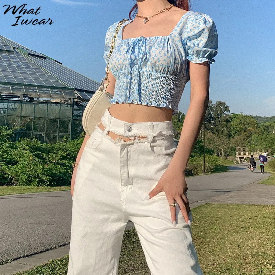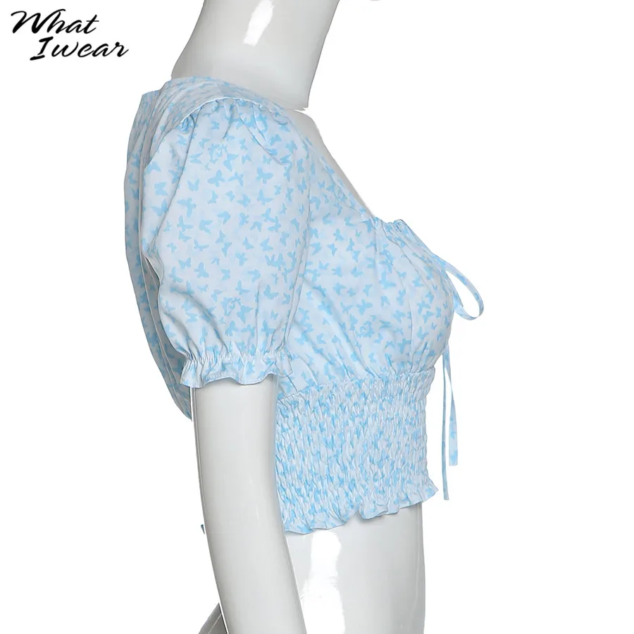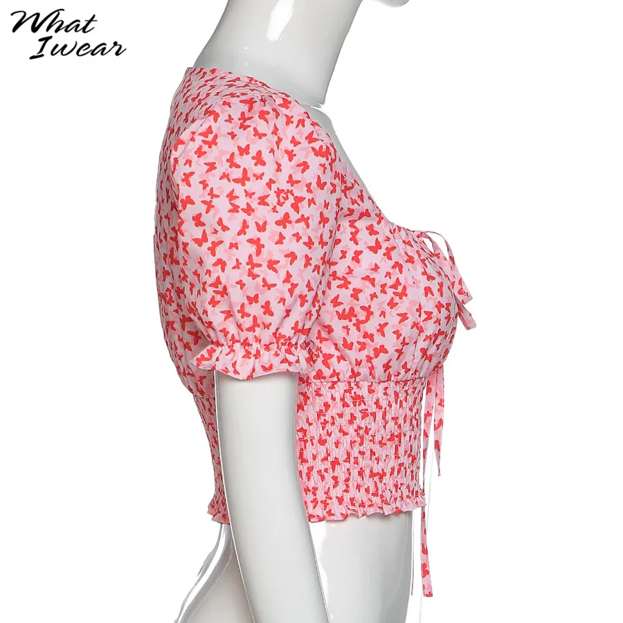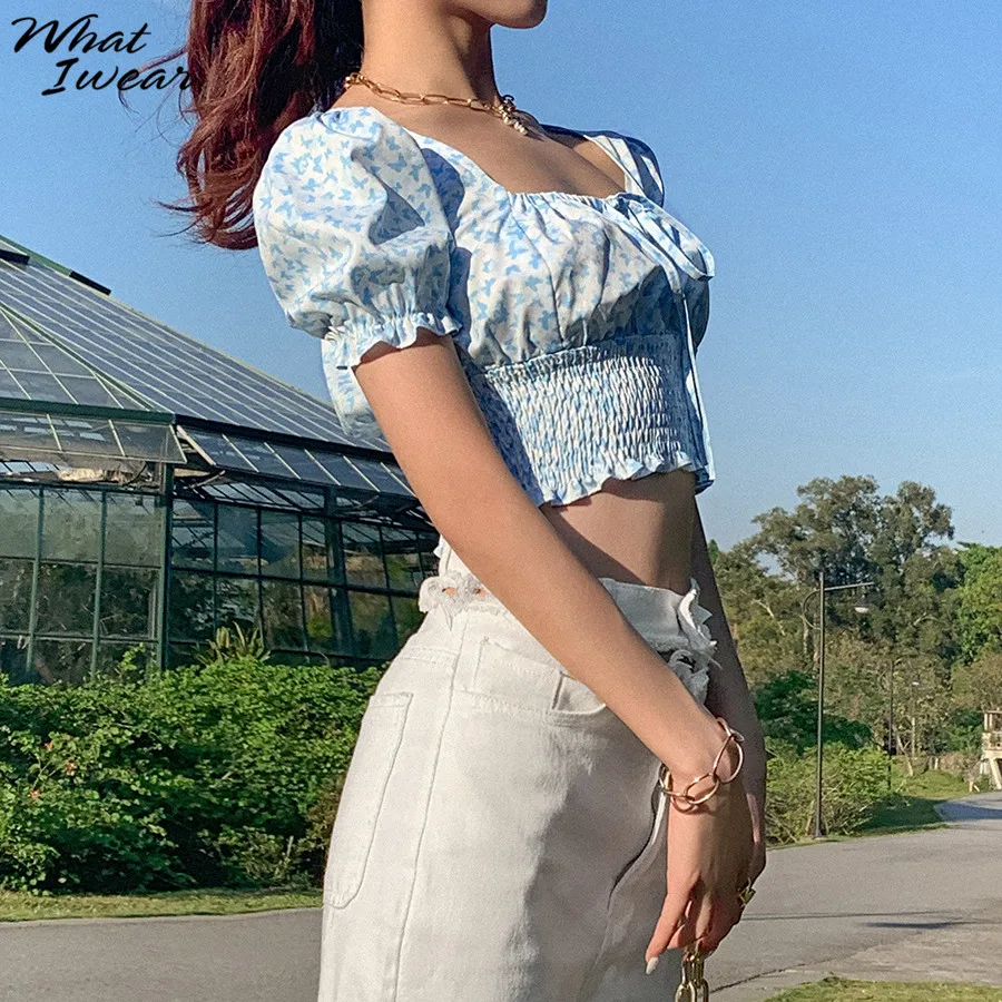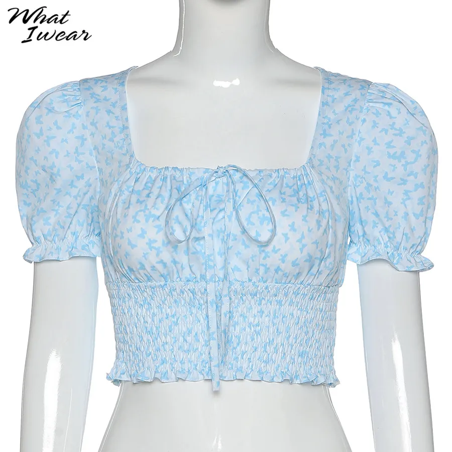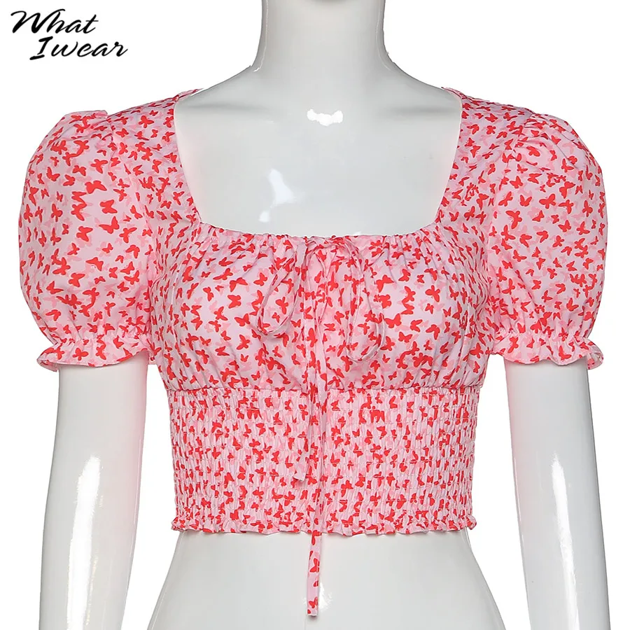 Floral Print shirt elegant t-shirt women puff sleeve Square Collar tshirt Tie Up crop top Summer Shirts Casual Tees Harajuku