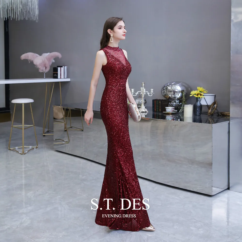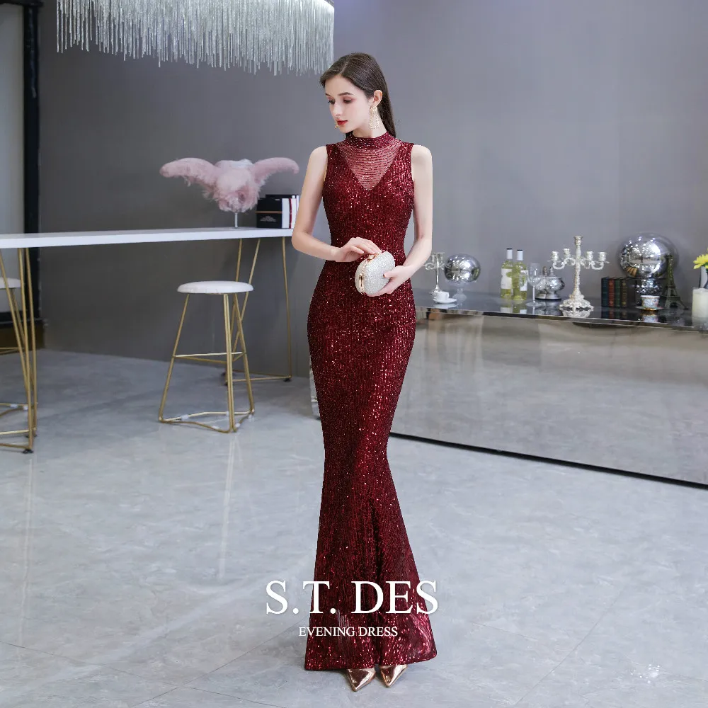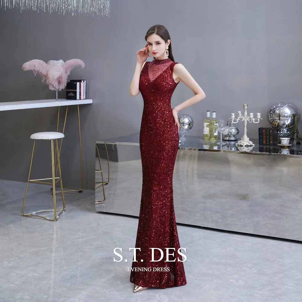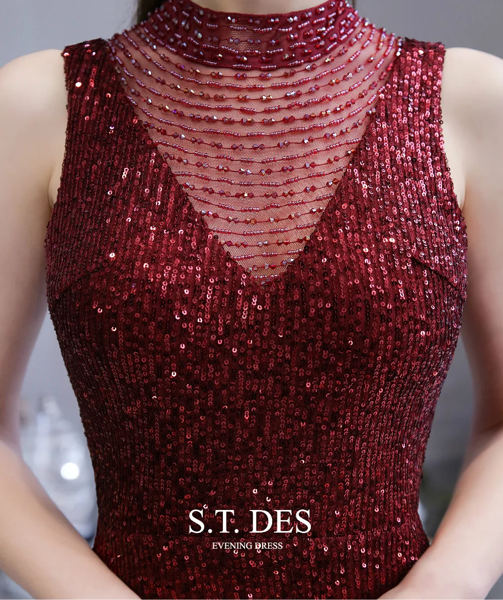 Formal-dress 2020 Summer S.T.DES Elegant Burgundy High Sheer Neck Full Sequins Tulle Illusion Mermaid Evening Dress For Woman